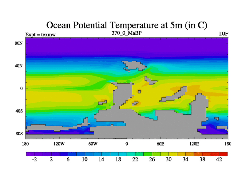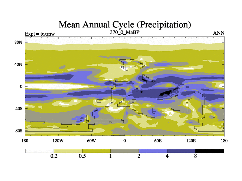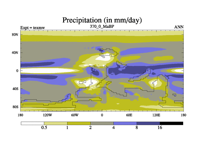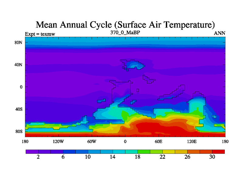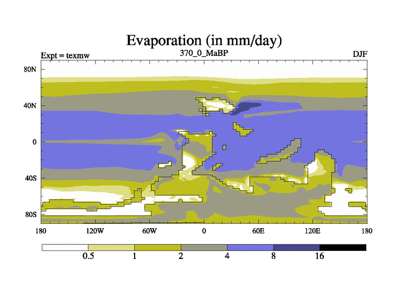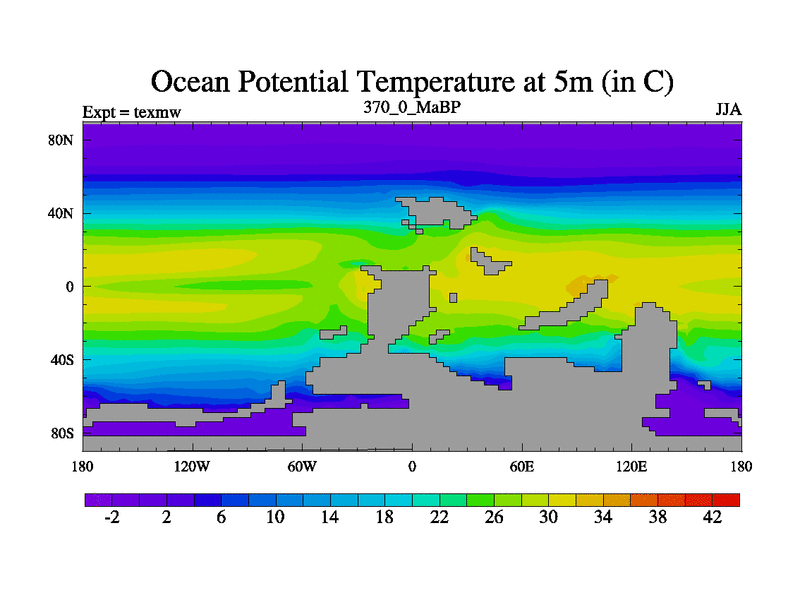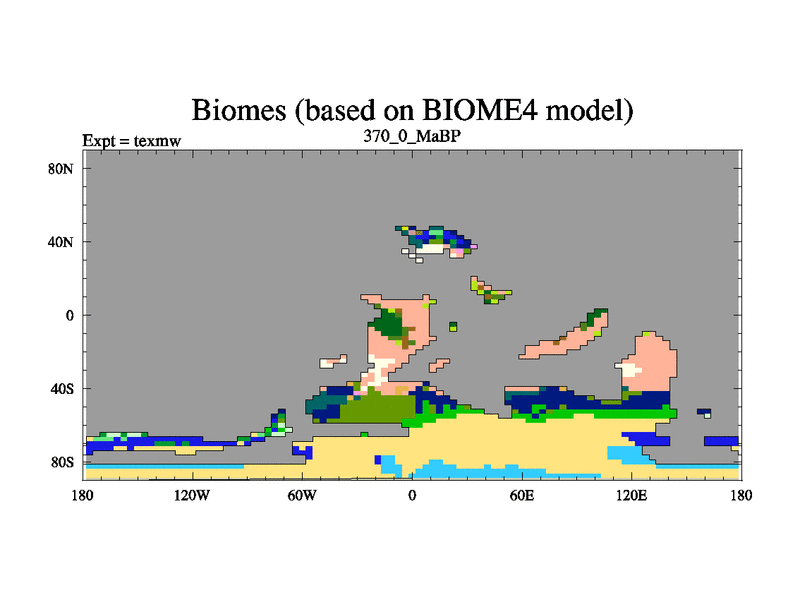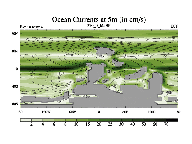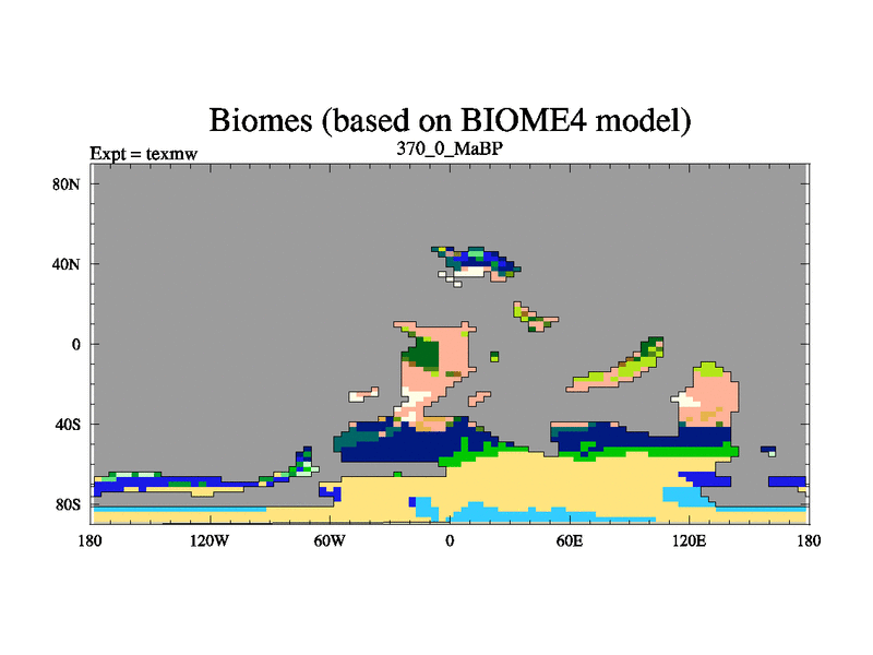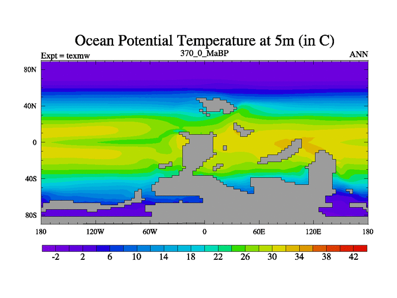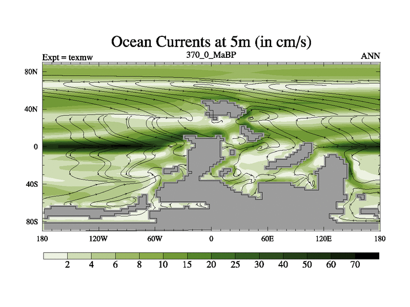 This is the 370.0 Ma simulation using the Scotese palaeogeographies. High output extension of the 5000 year spinup.