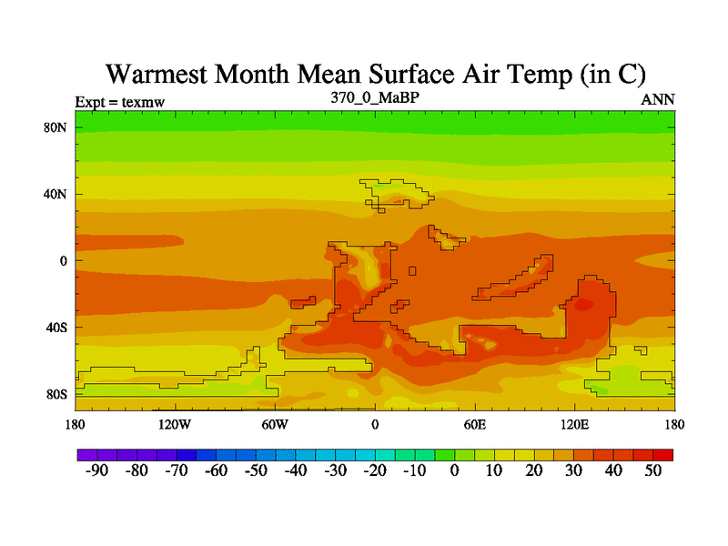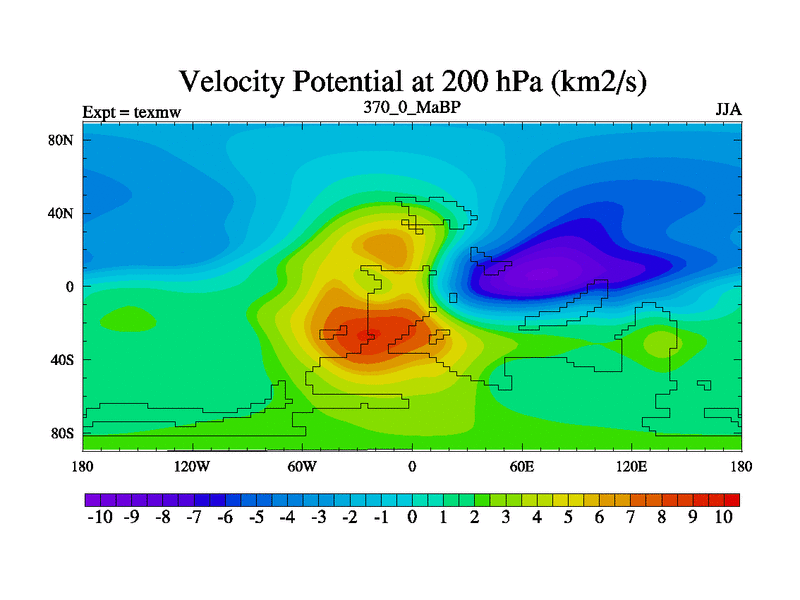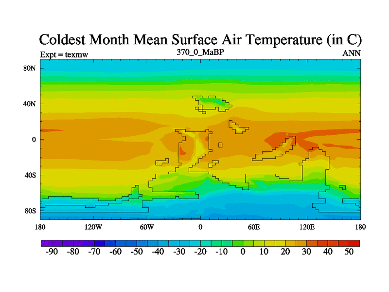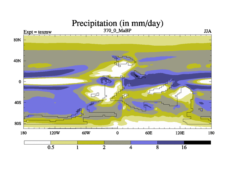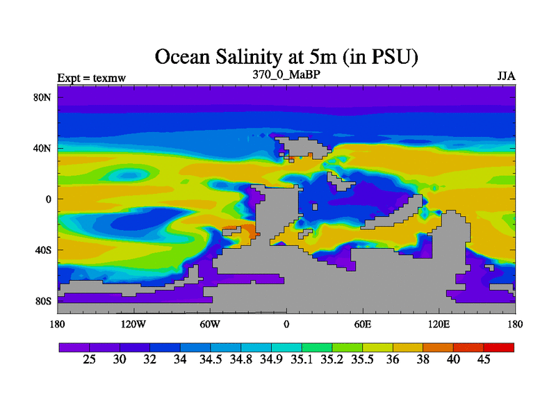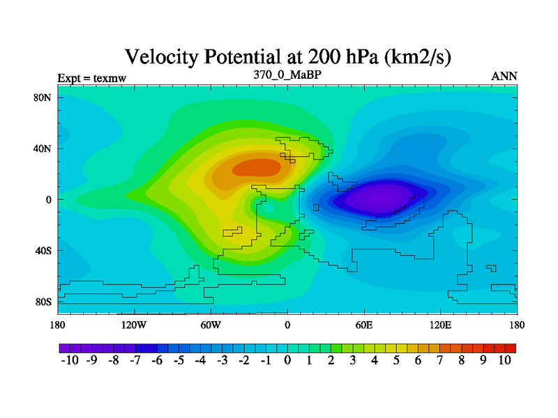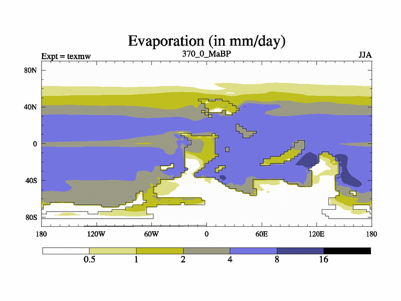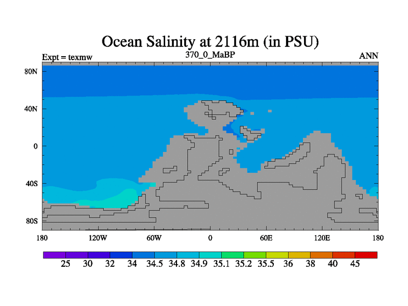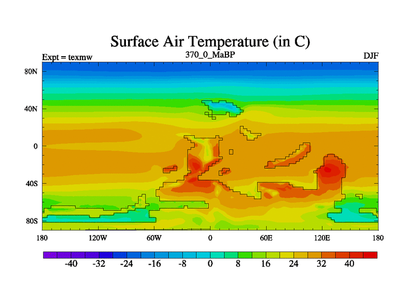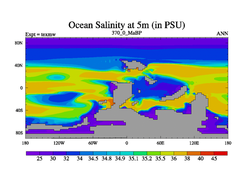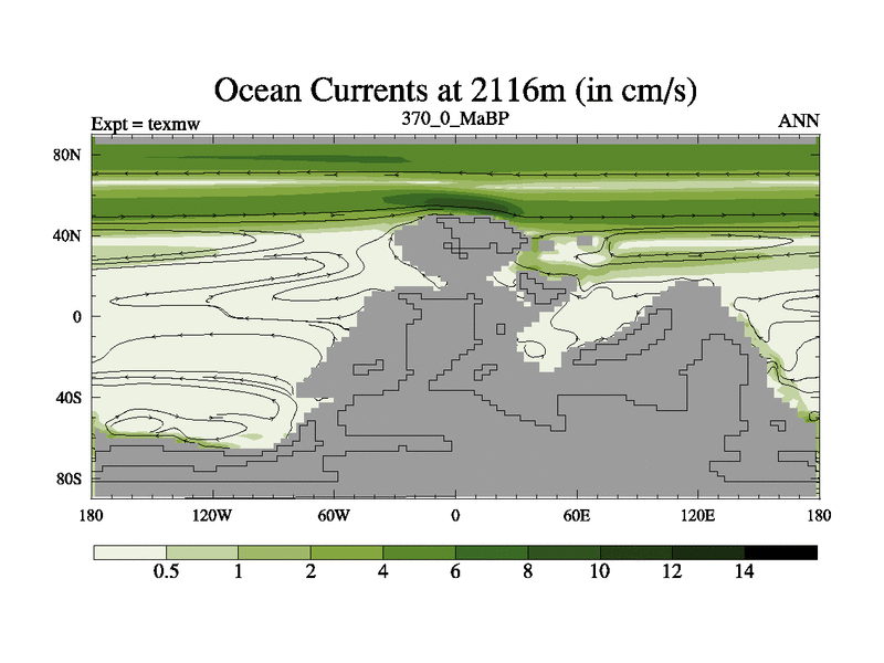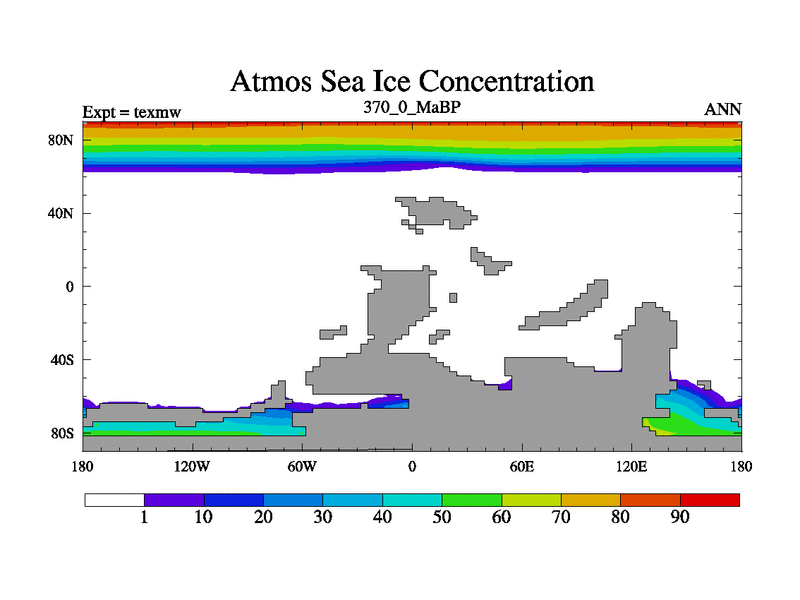 This is the 370.0 Ma simulation using the Scotese palaeogeographies. High output extension of the 5000 year spinup.