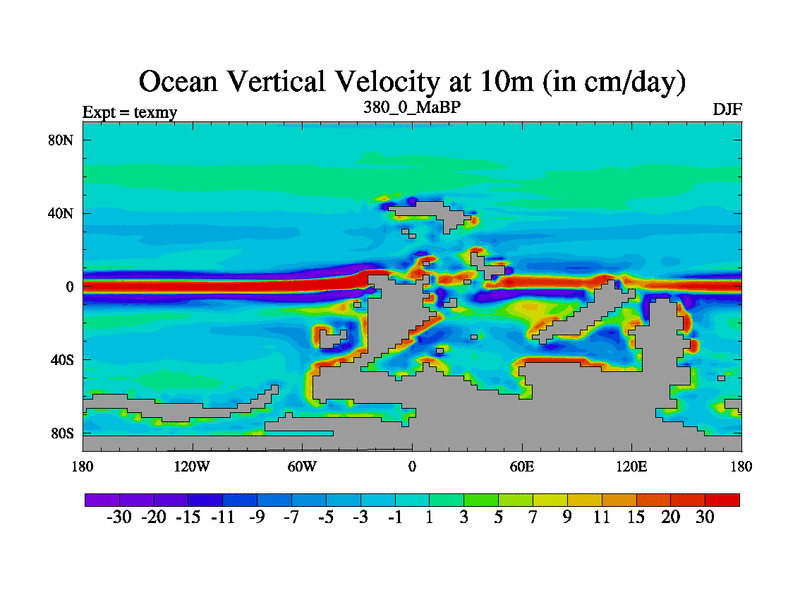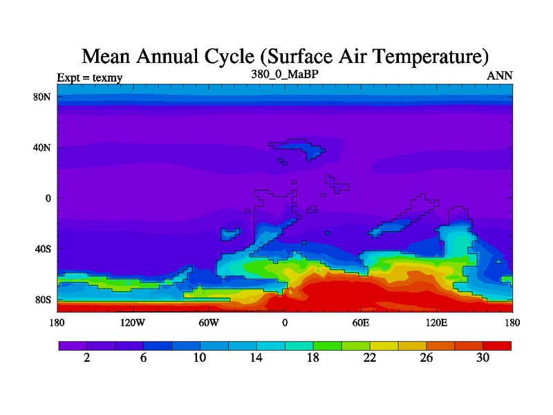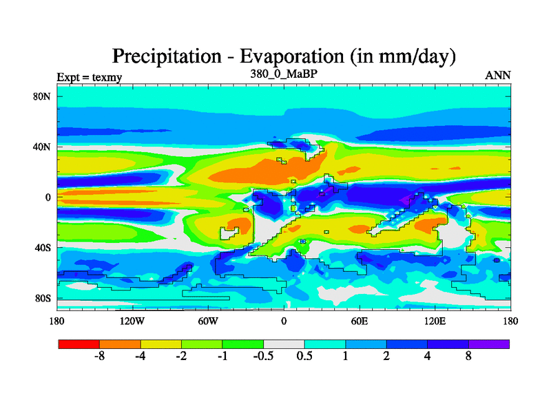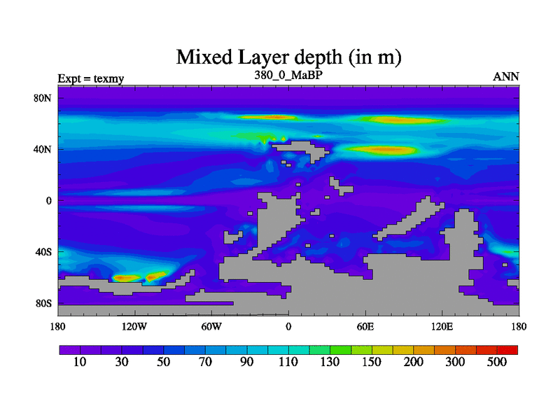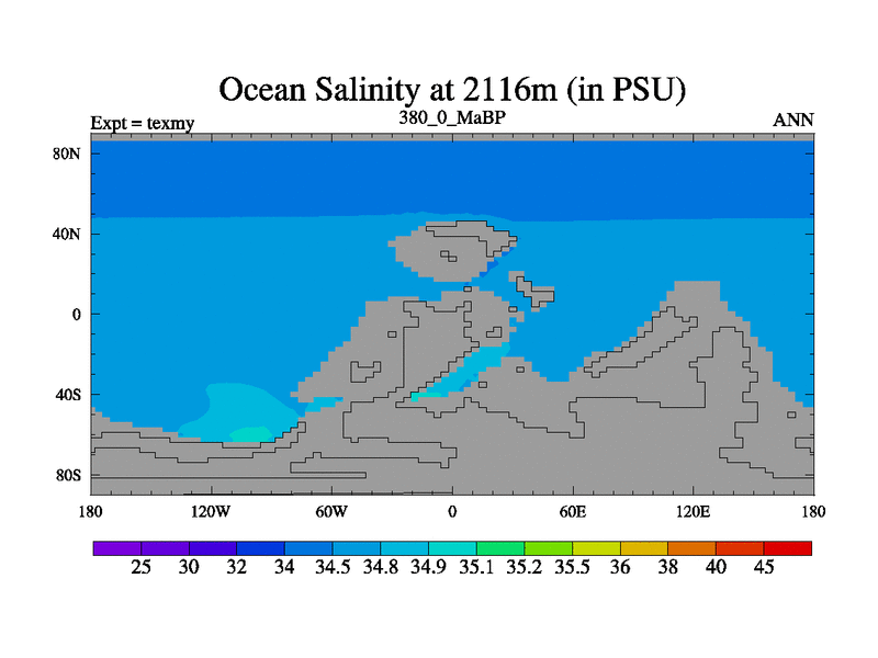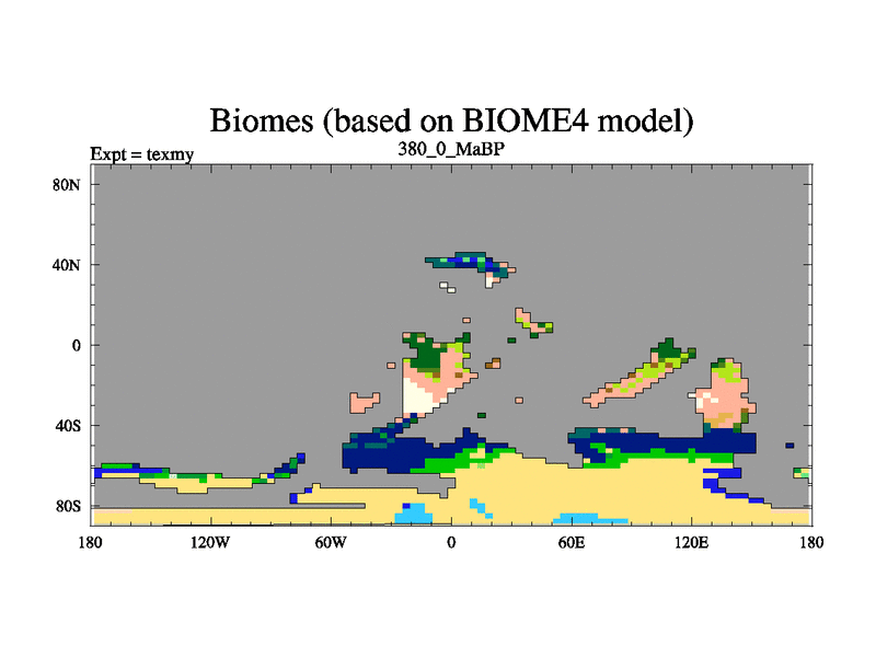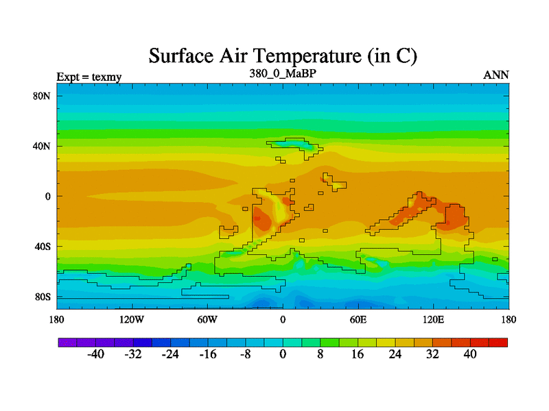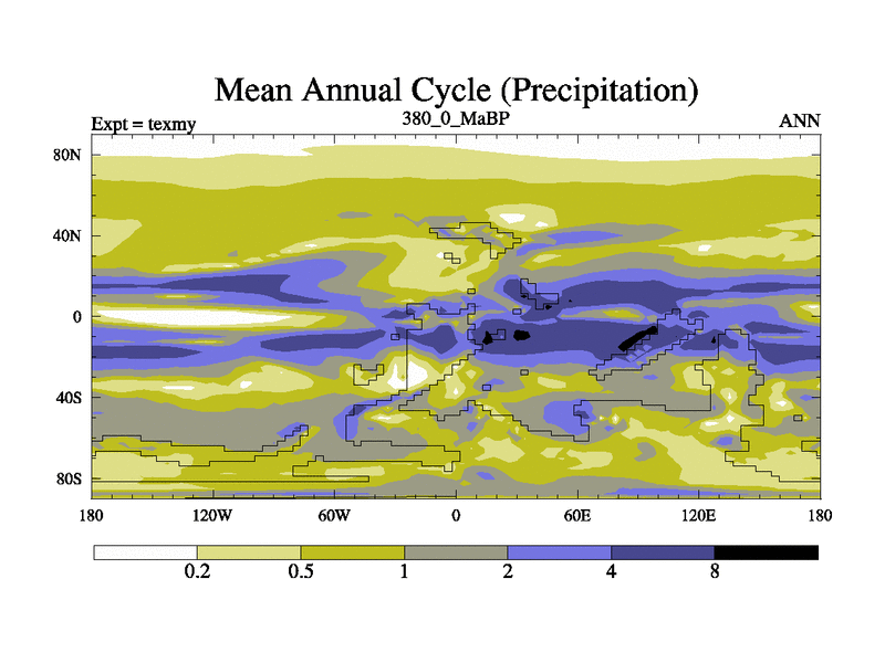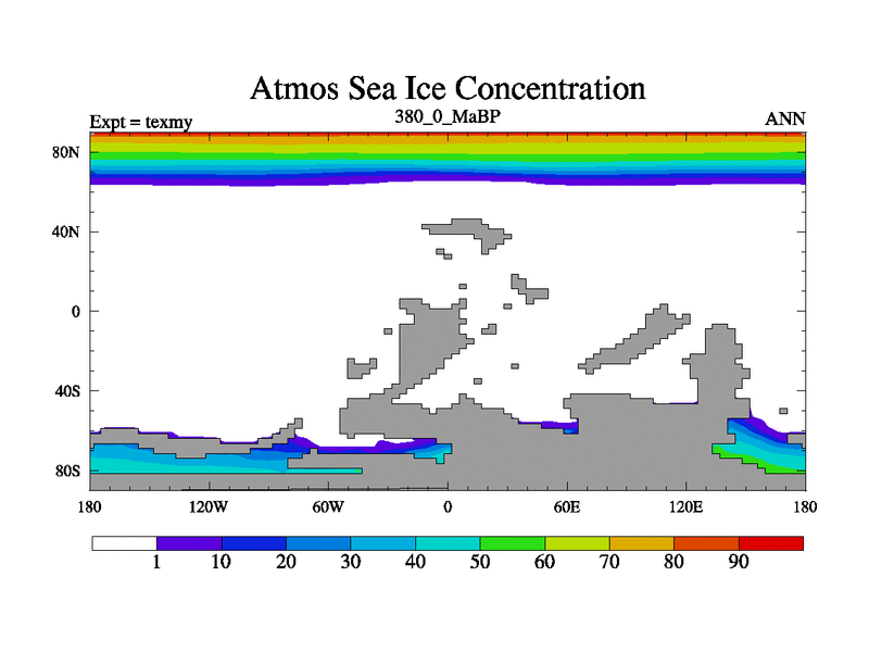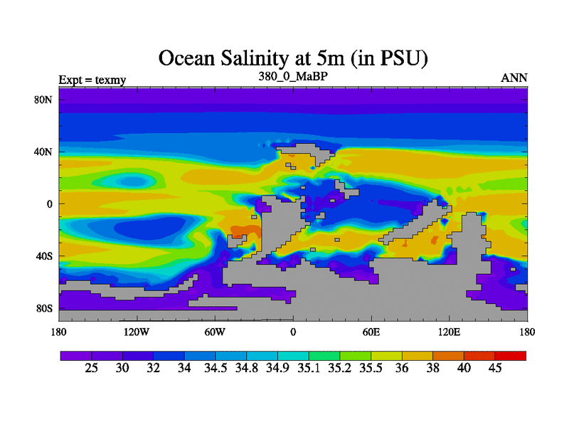 This is the 380.0 Ma simulation using the Scotese palaeogeographies. High output extension of the 5000 year spinup.