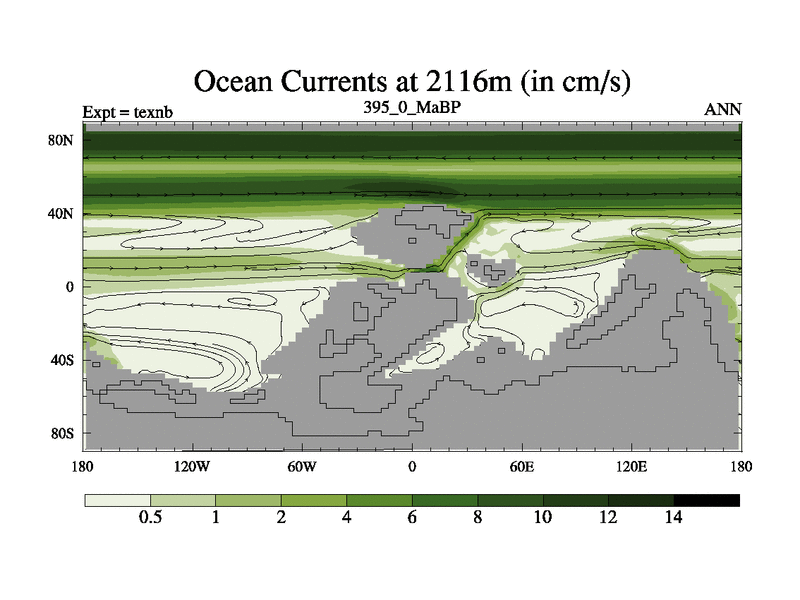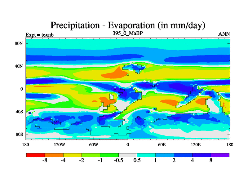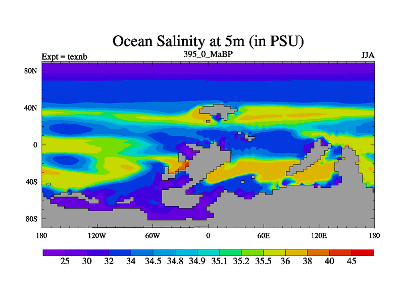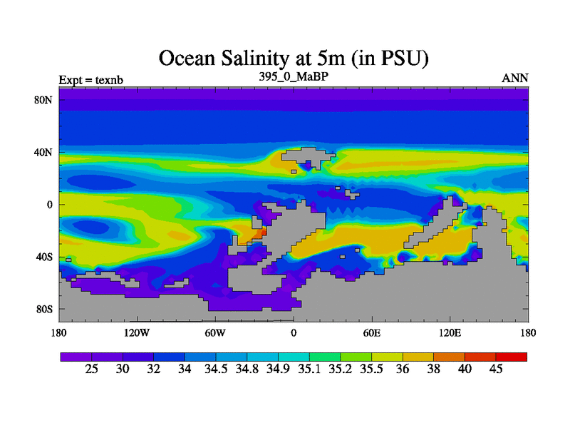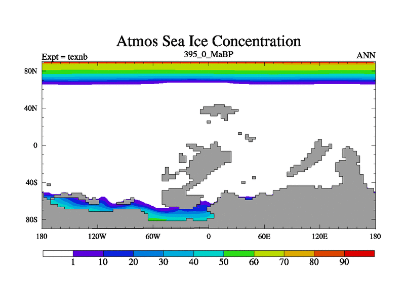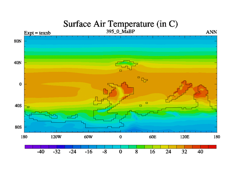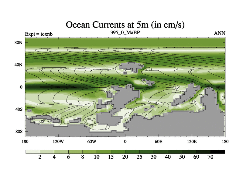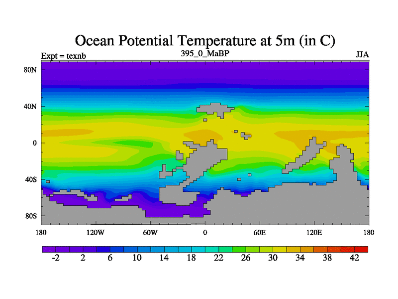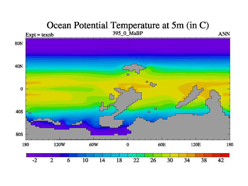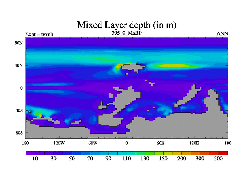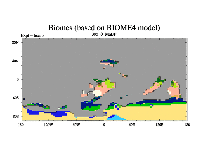 This is the 395.0 Ma simulation using the Scotese palaeogeographies. High output extension of the 5000 year spinup.