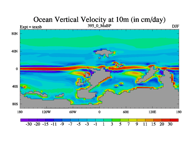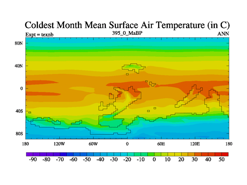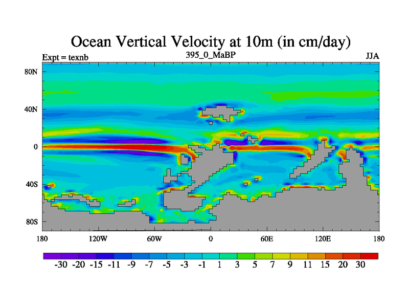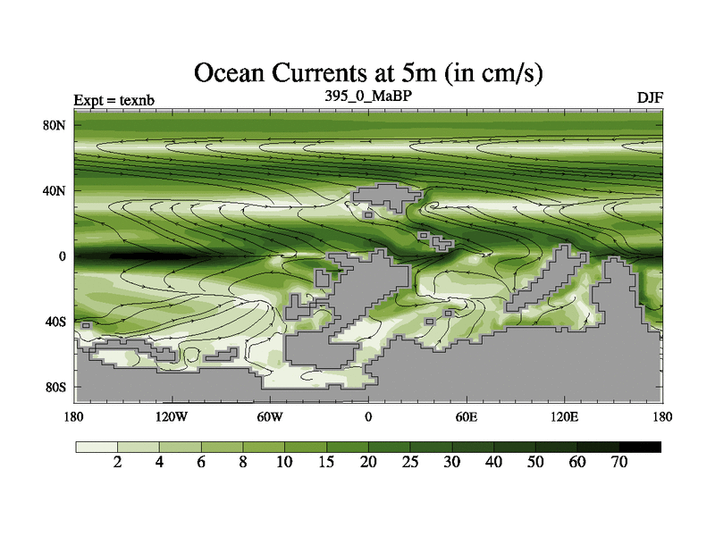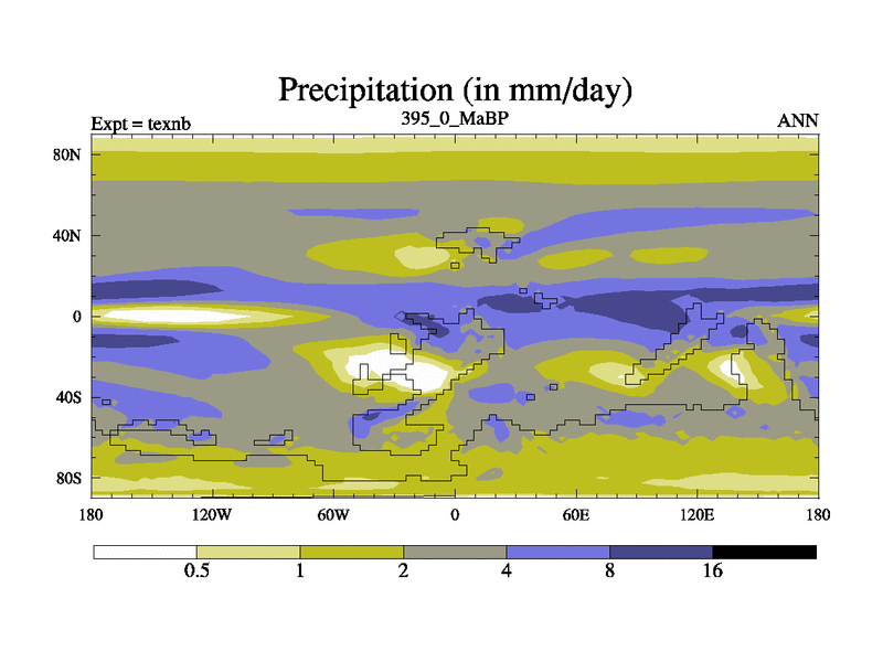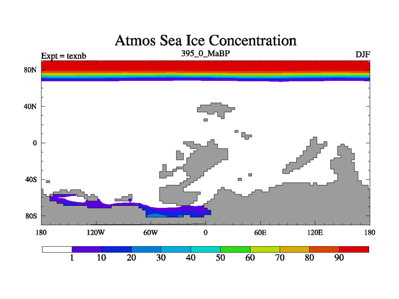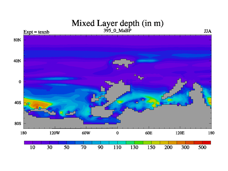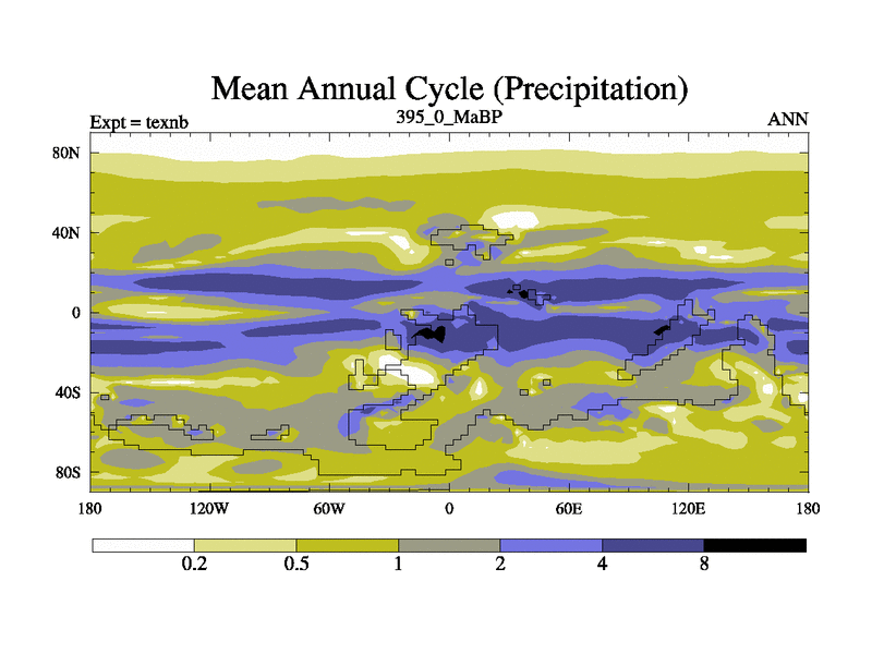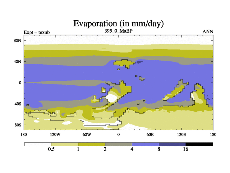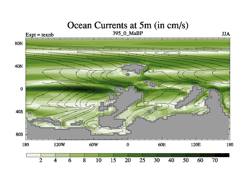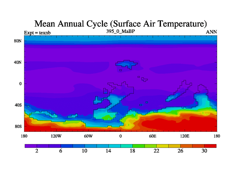 This is the 395.0 Ma simulation using the Scotese palaeogeographies. High output extension of the 5000 year spinup.