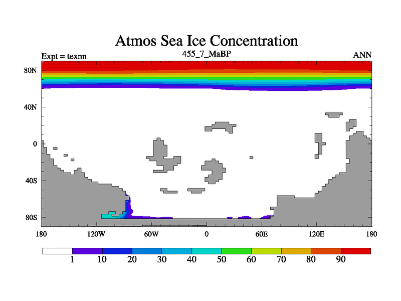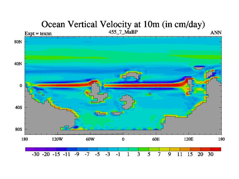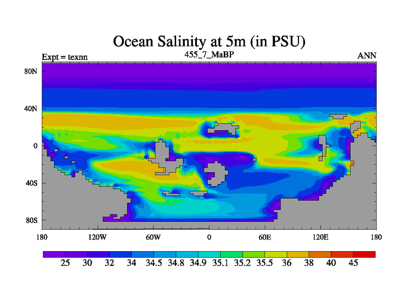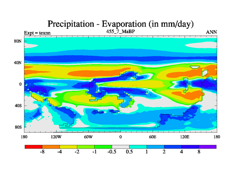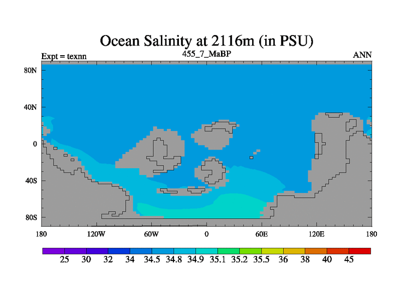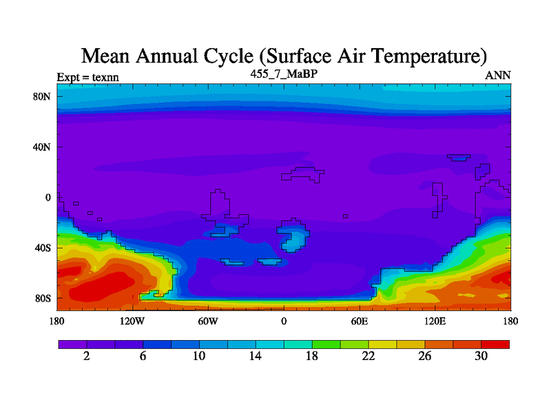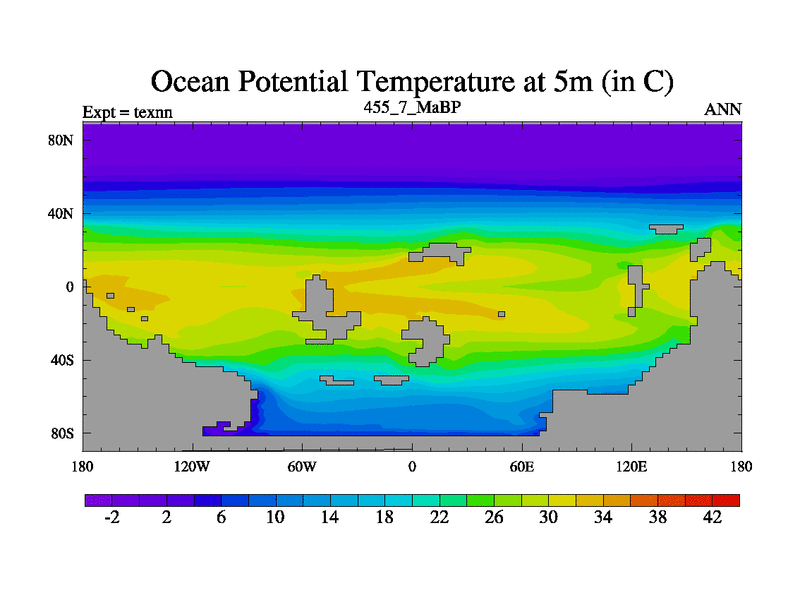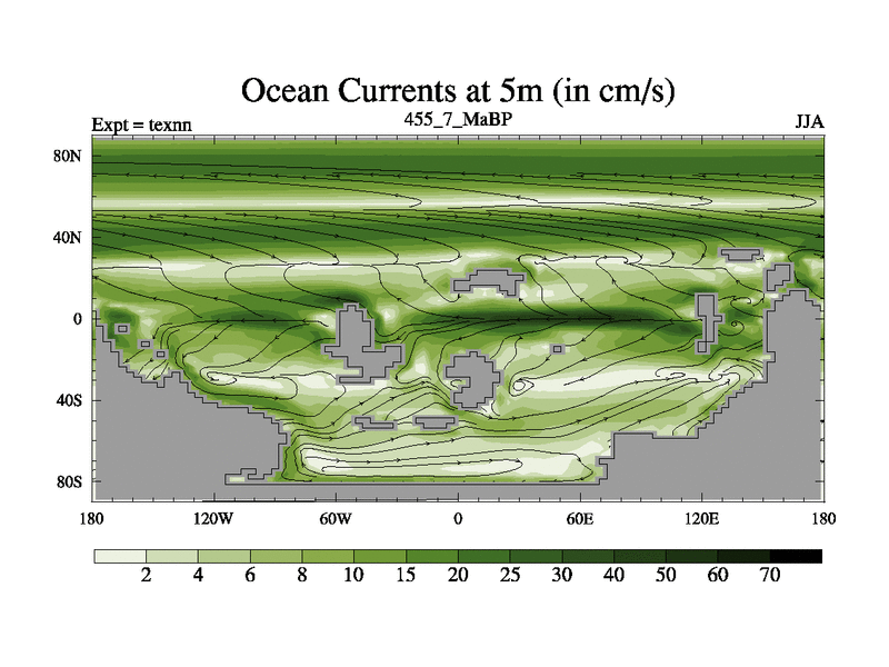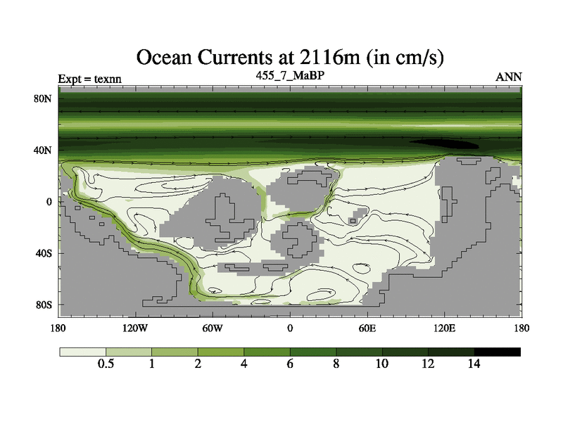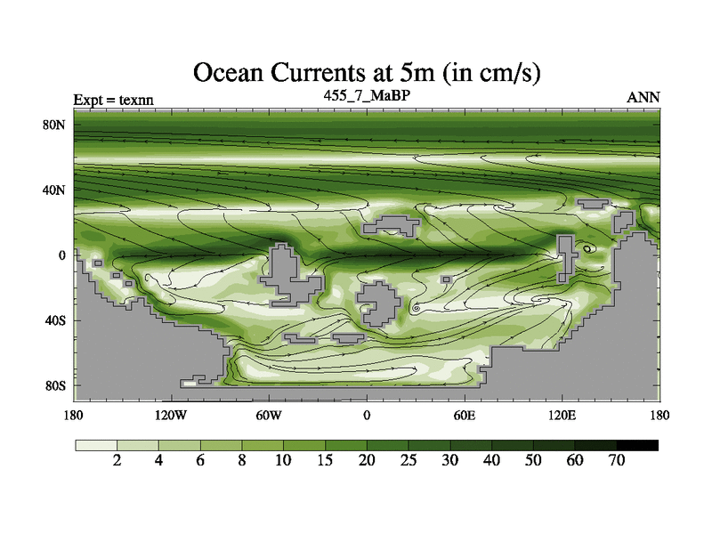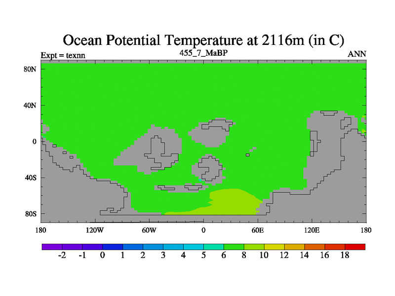 This is the 455.7 Ma simulation using the Scotese palaeogeographies. High output extension of the 5000 year spinup.