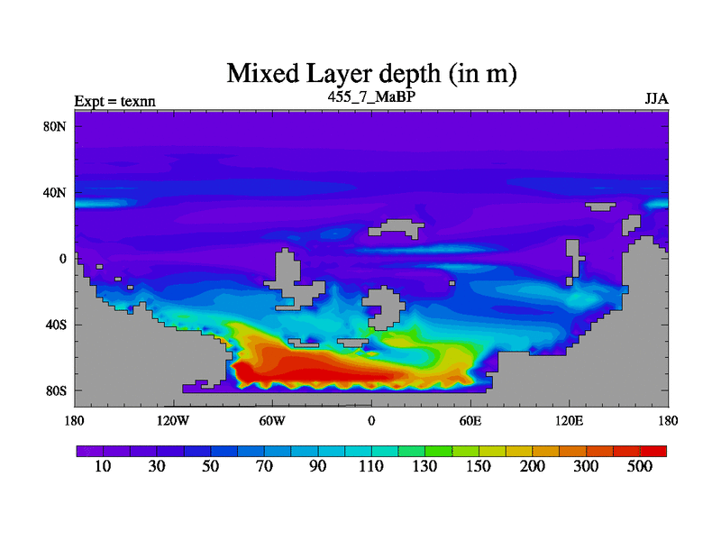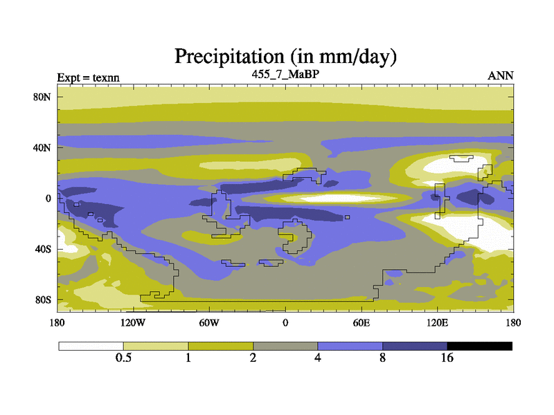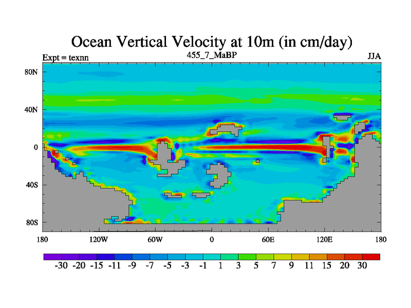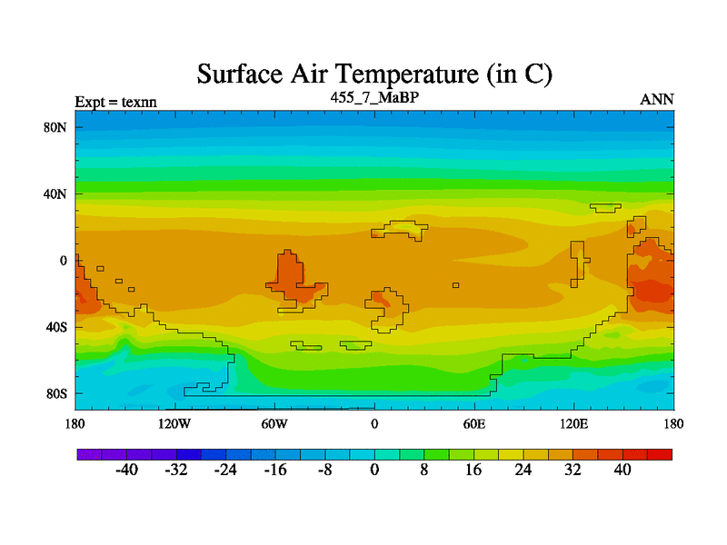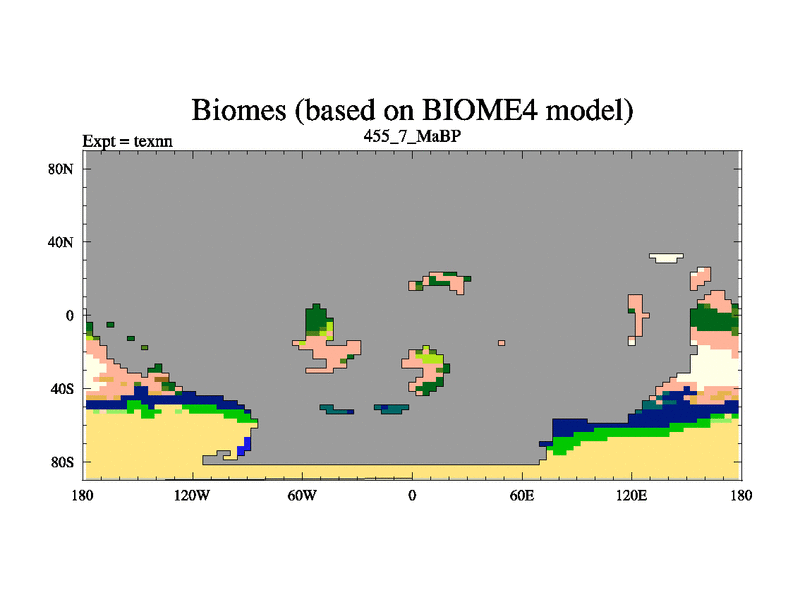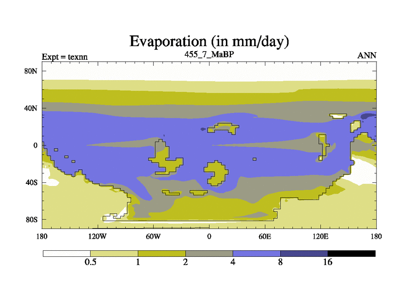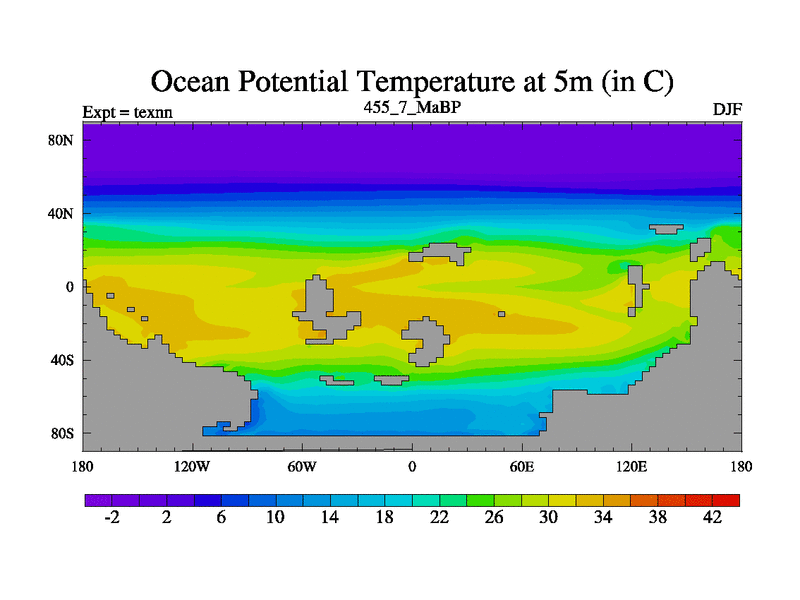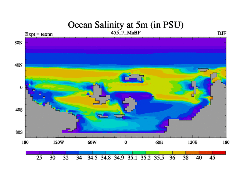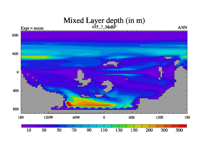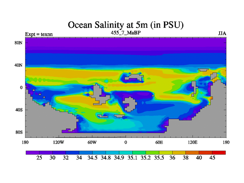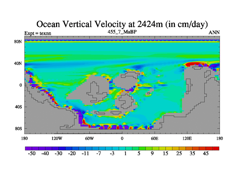 This is the 455.7 Ma simulation using the Scotese palaeogeographies. High output extension of the 5000 year spinup.