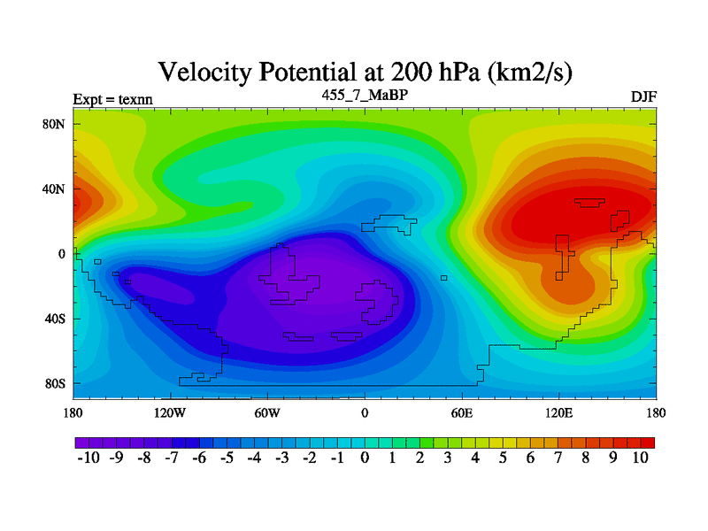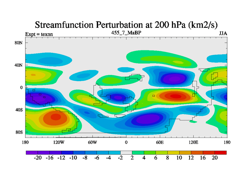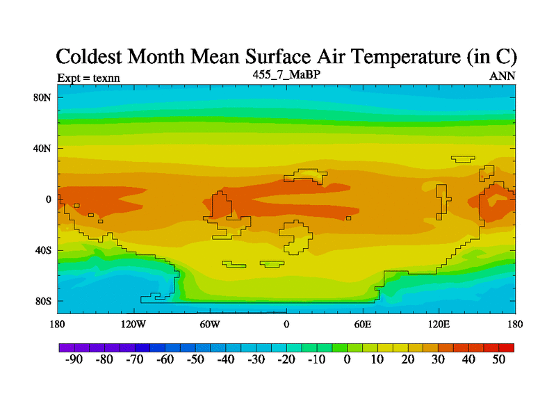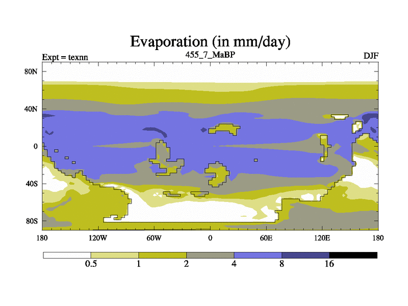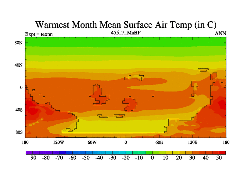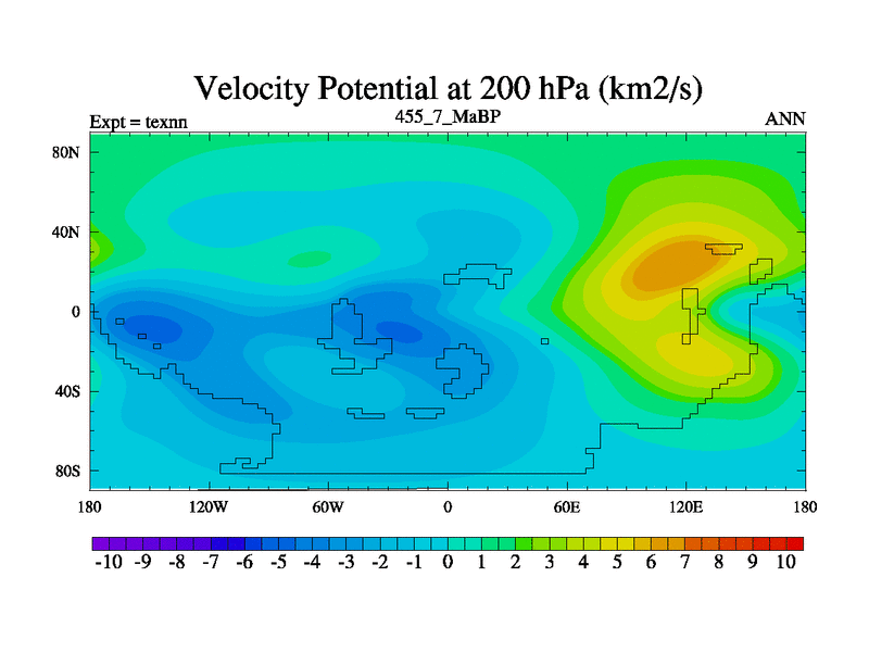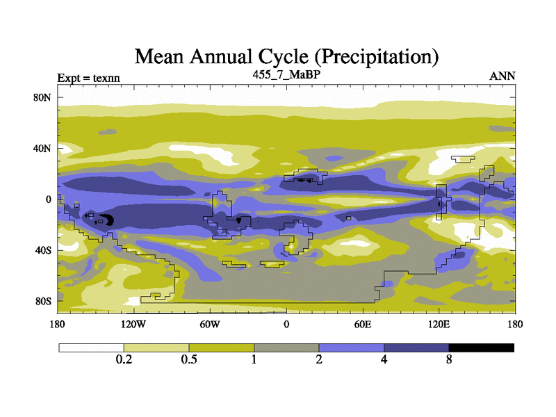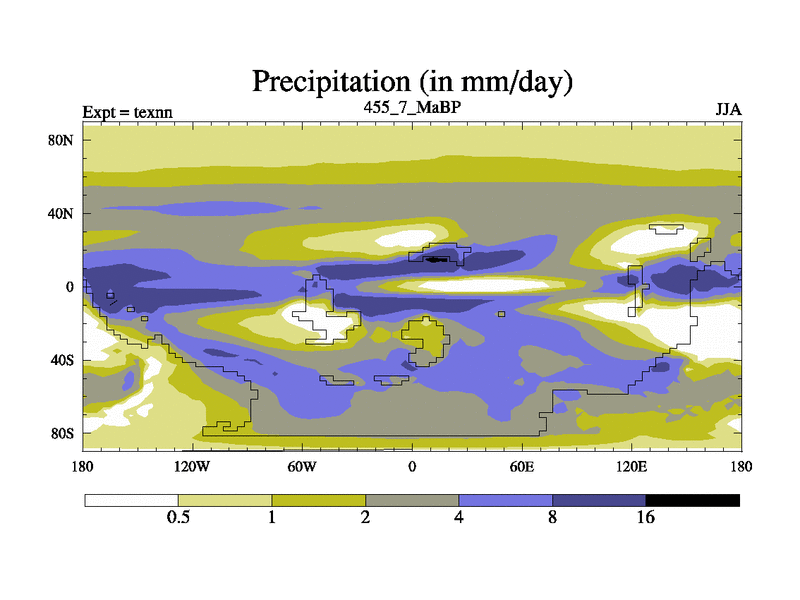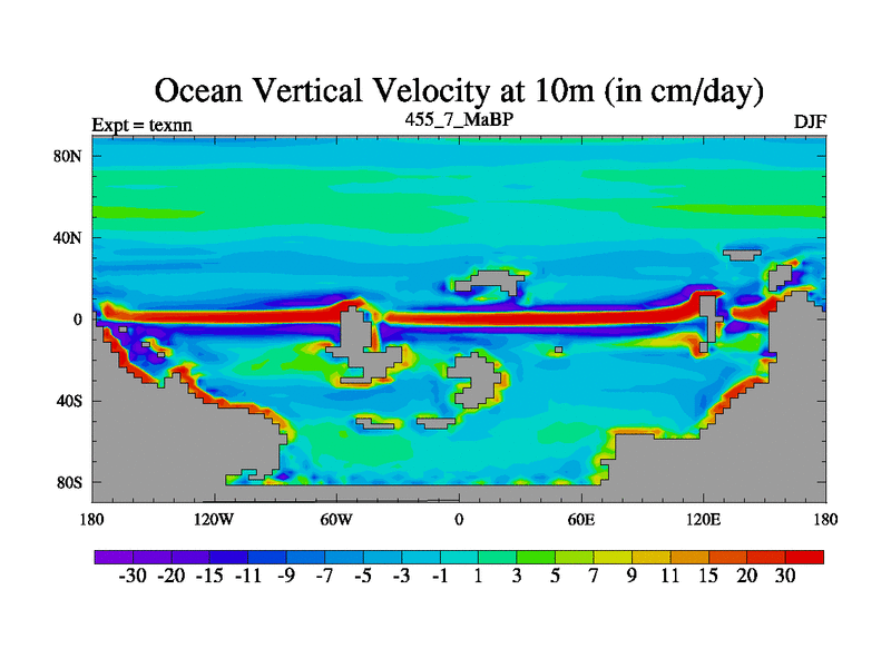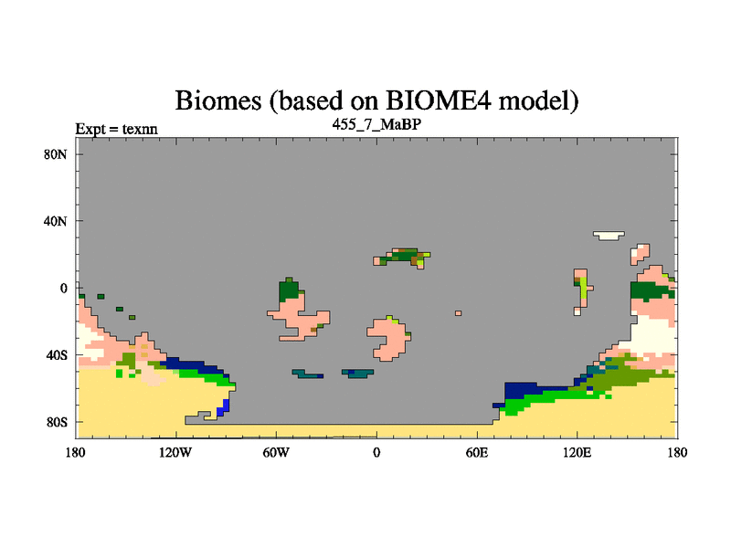 This is the 455.7 Ma simulation using the Scotese palaeogeographies. High output extension of the 5000 year spinup.