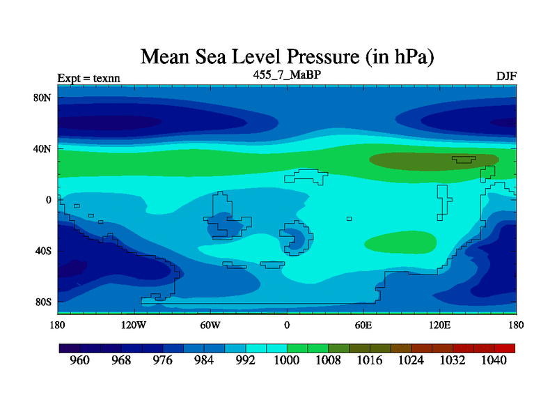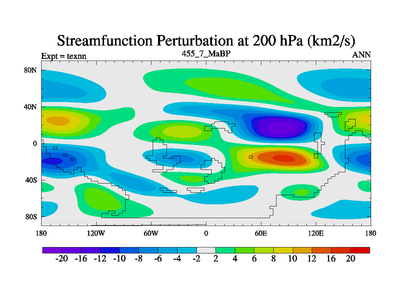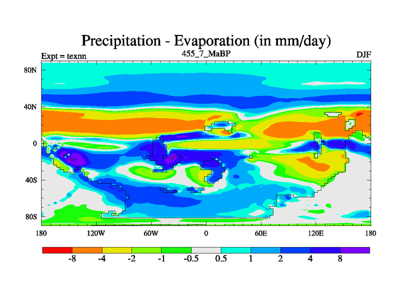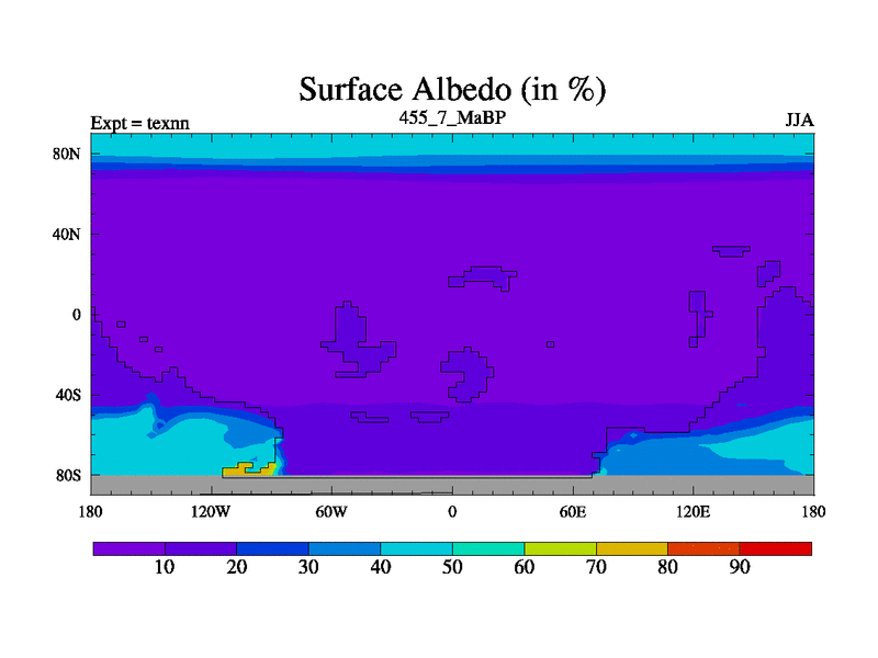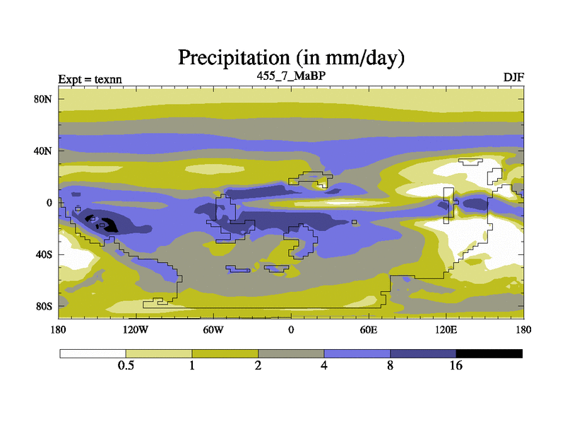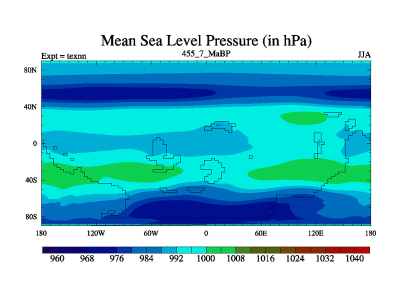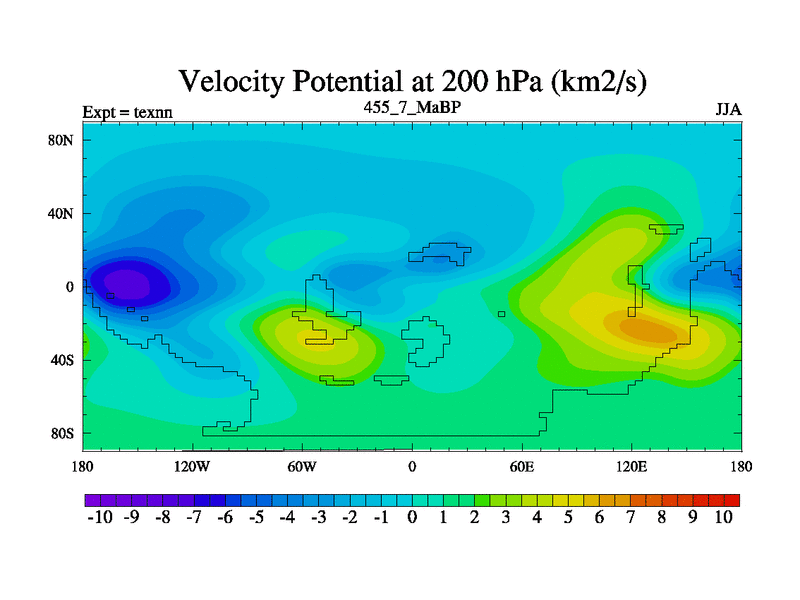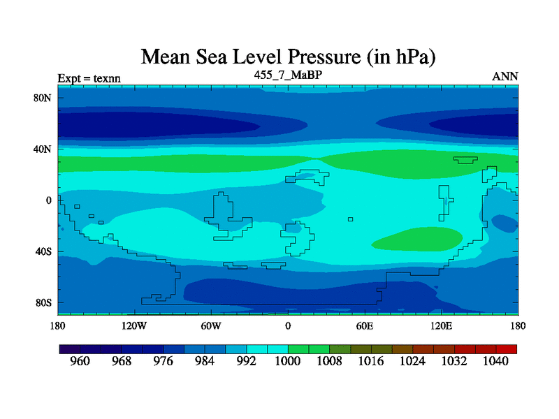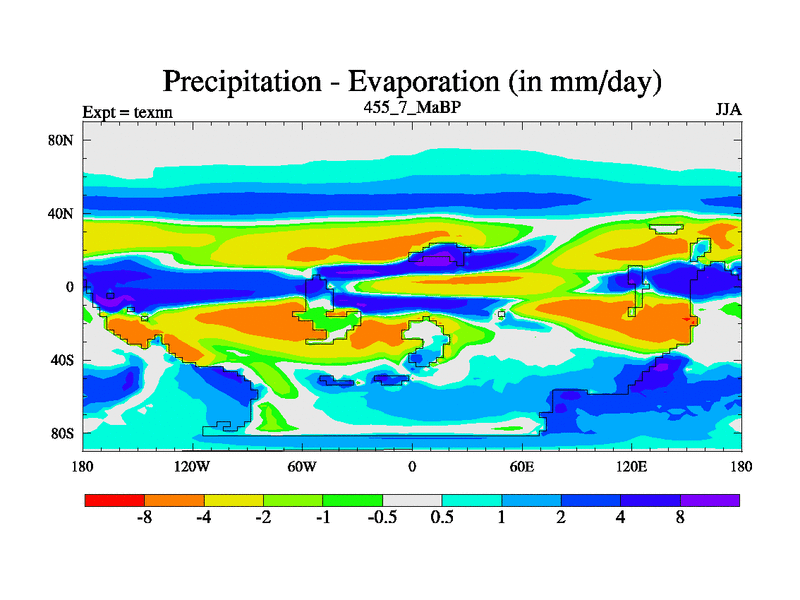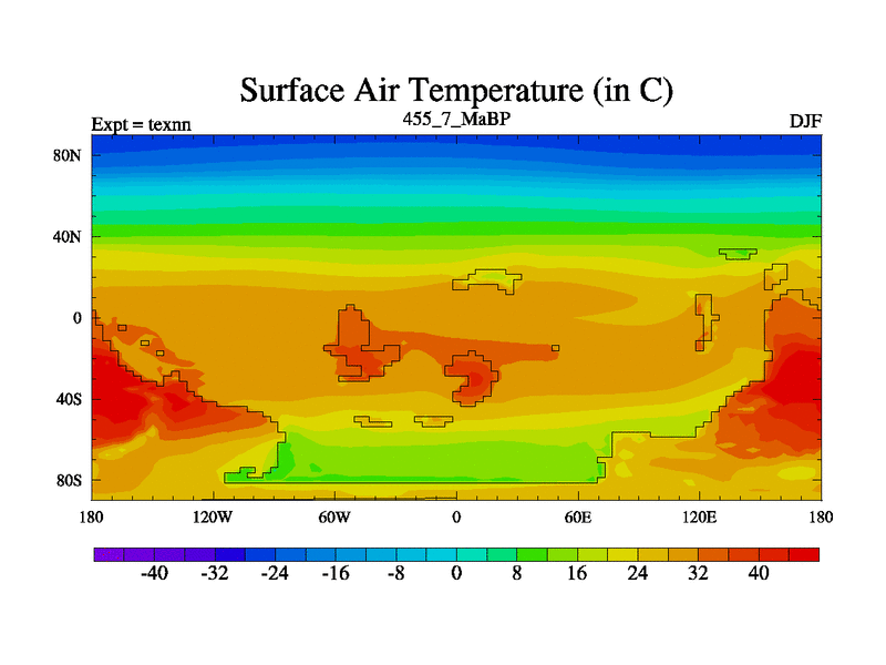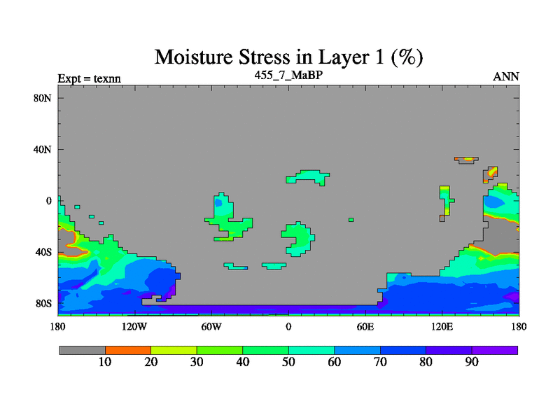 This is the 455.7 Ma simulation using the Scotese palaeogeographies. High output extension of the 5000 year spinup.