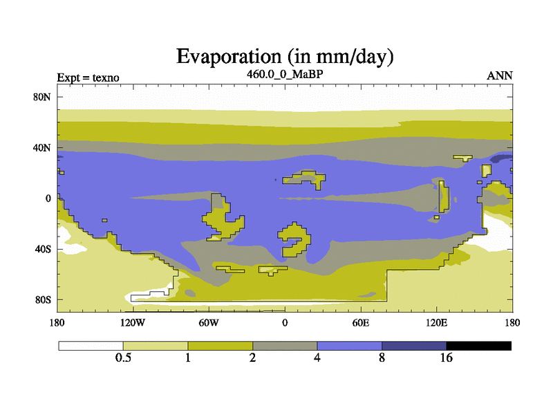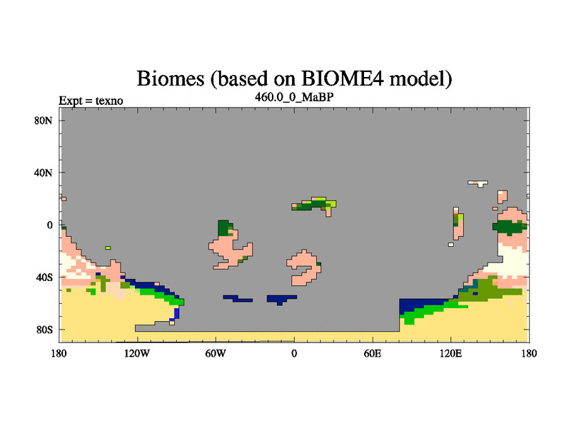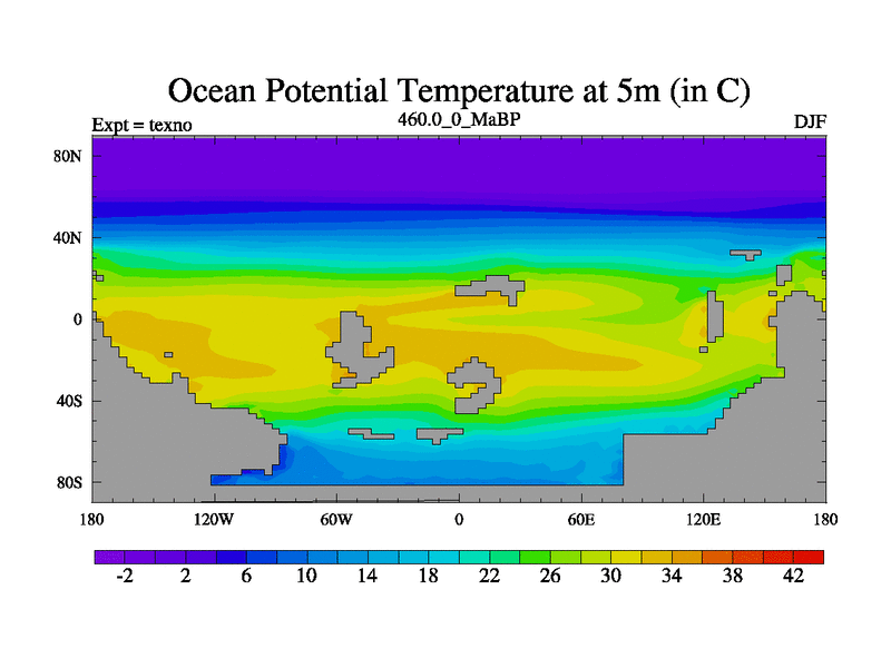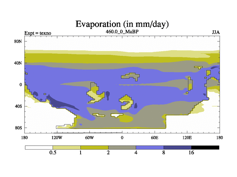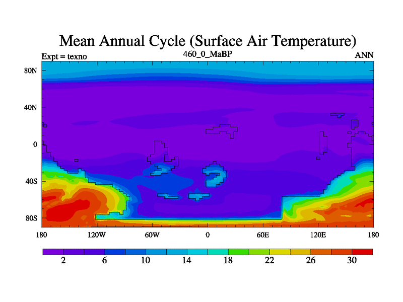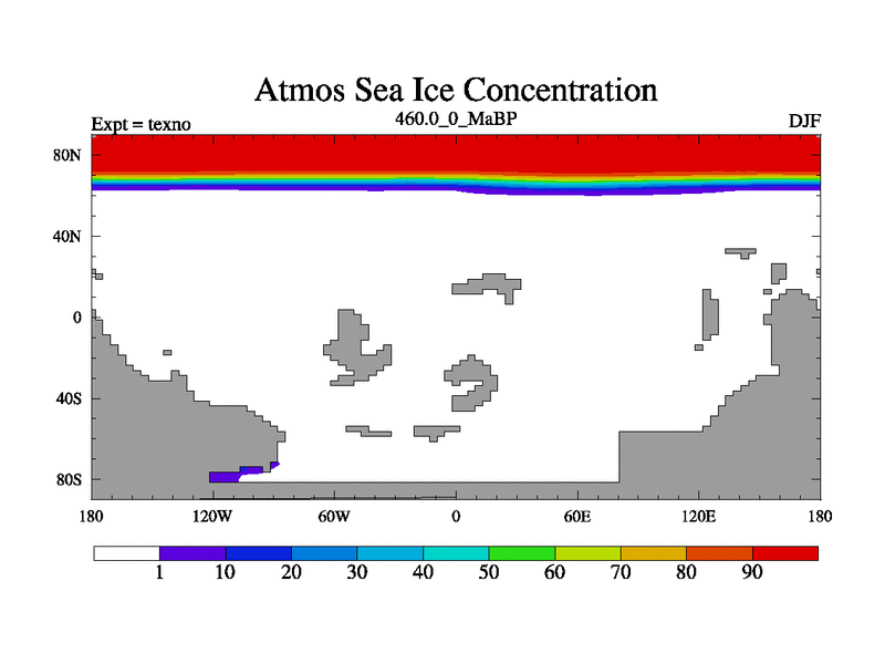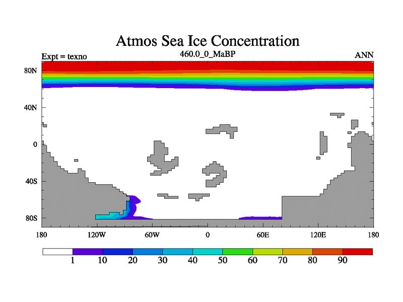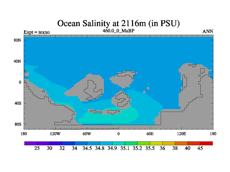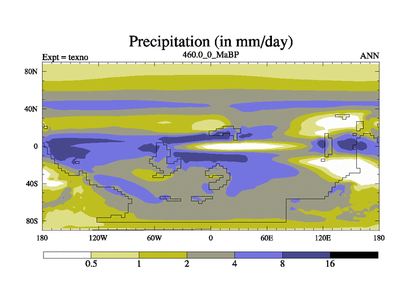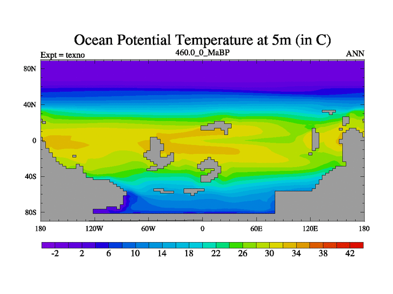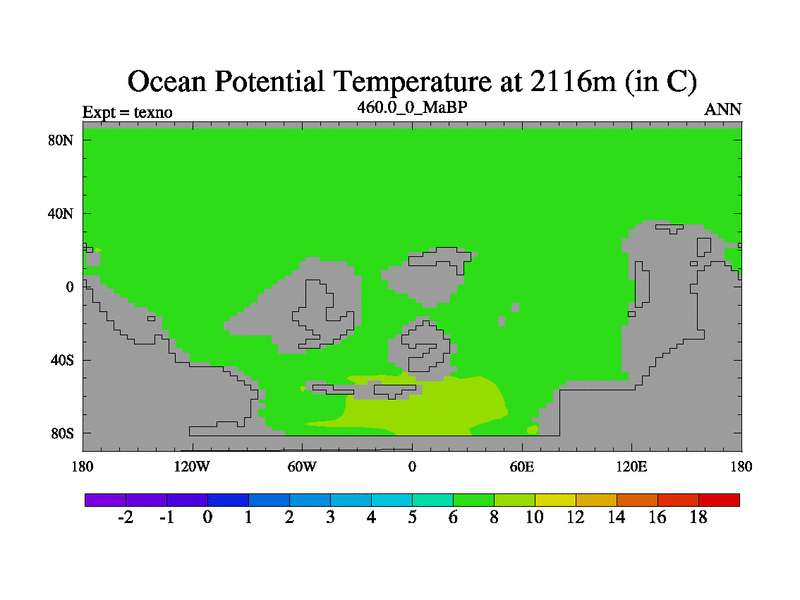 This is the 460.0 Ma simulation using the Scotese palaeogeographies. High output extension of the 5000 year spinup.