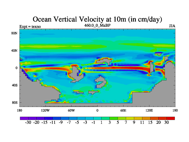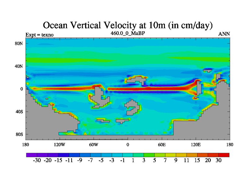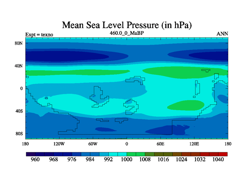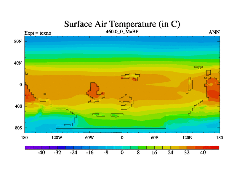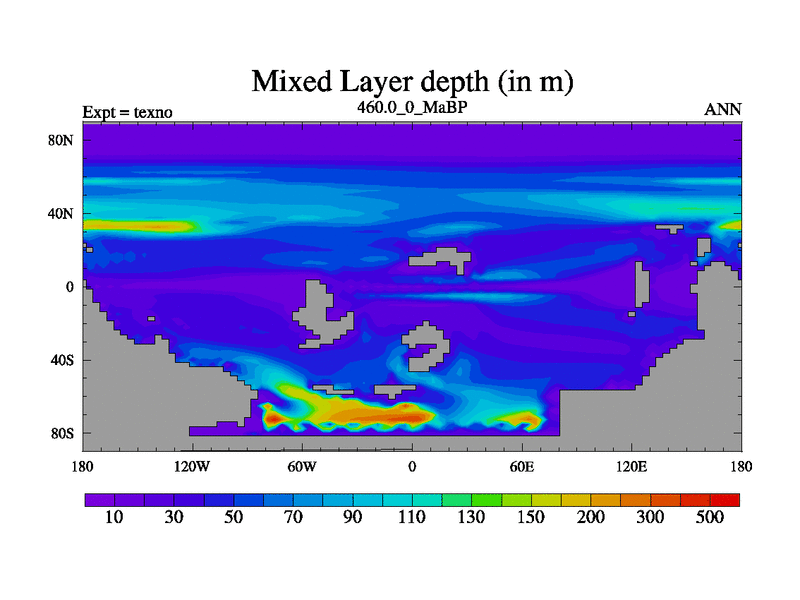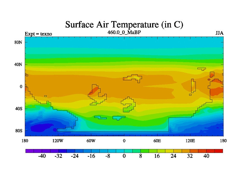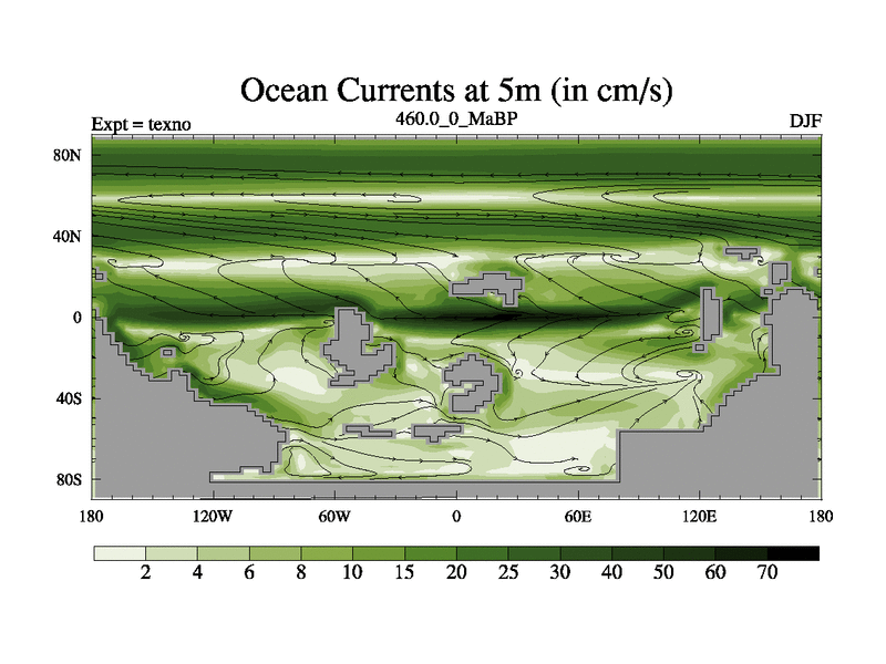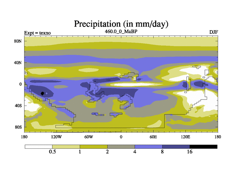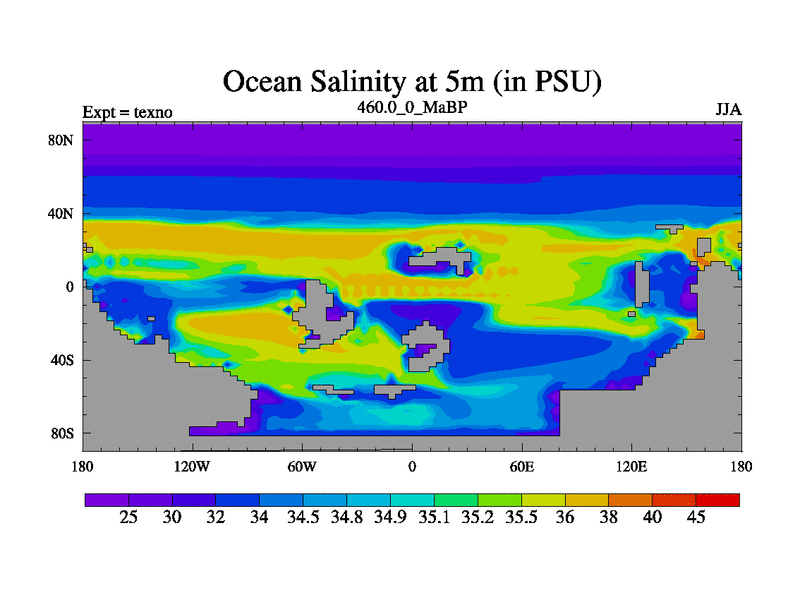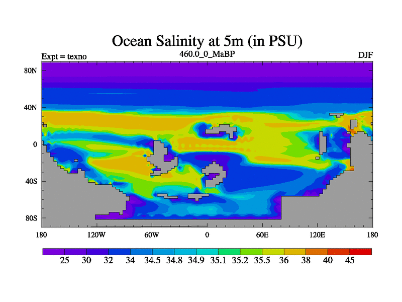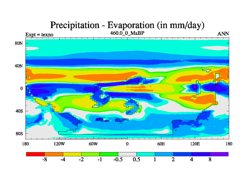 This is the 460.0 Ma simulation using the Scotese palaeogeographies. High output extension of the 5000 year spinup.