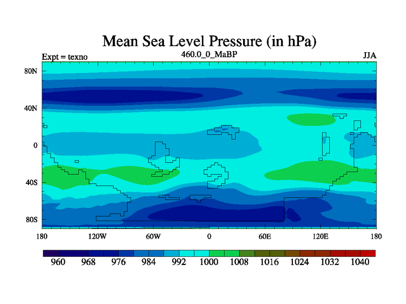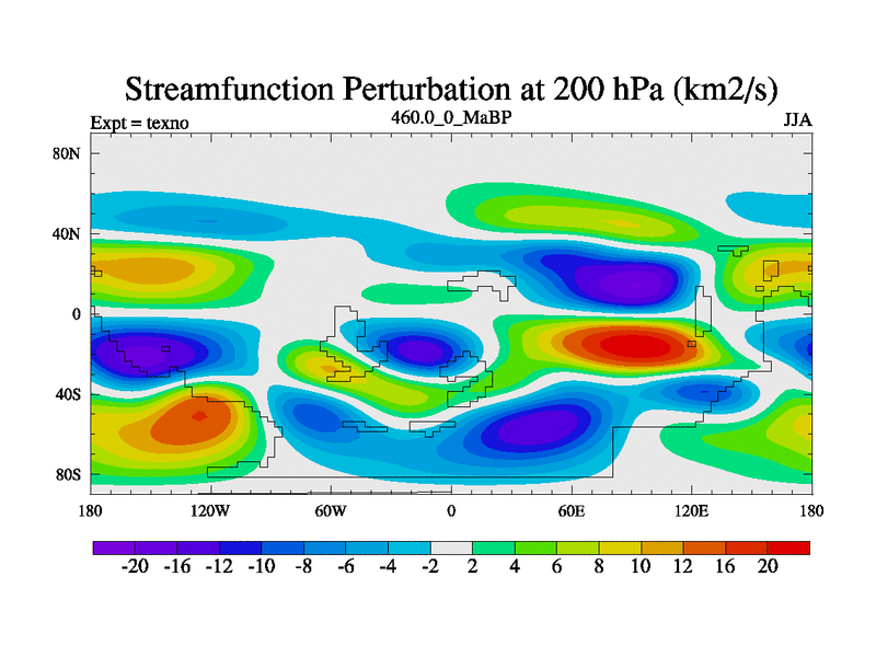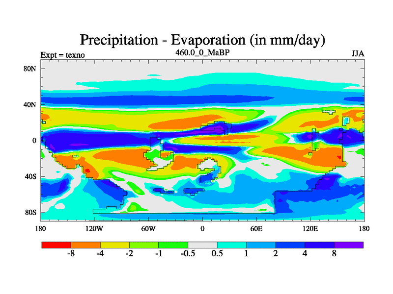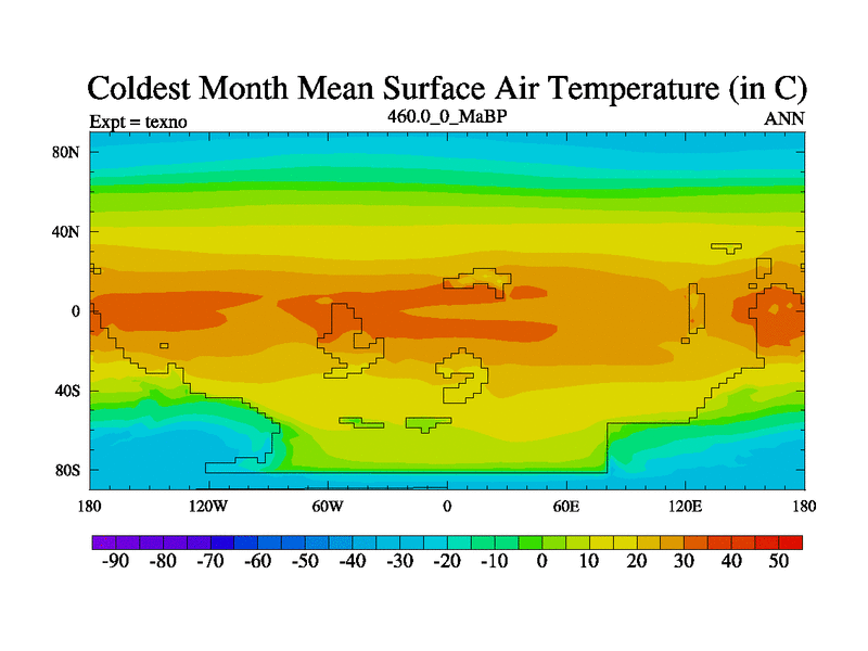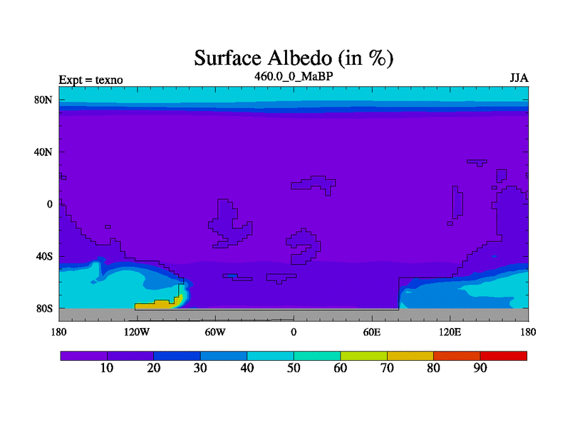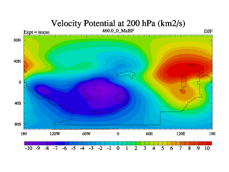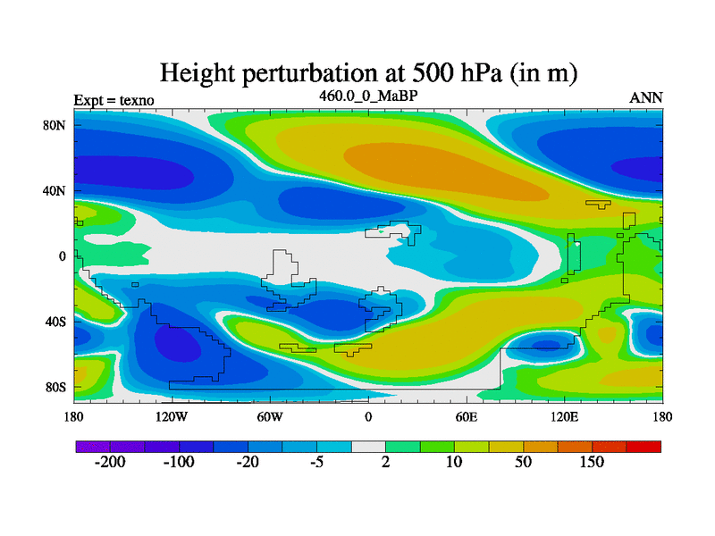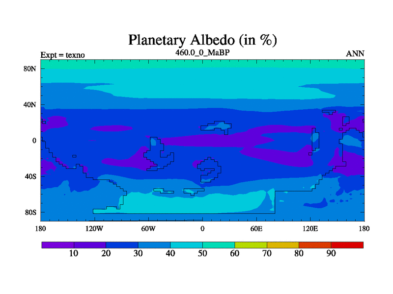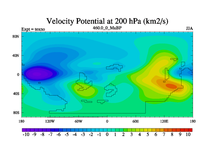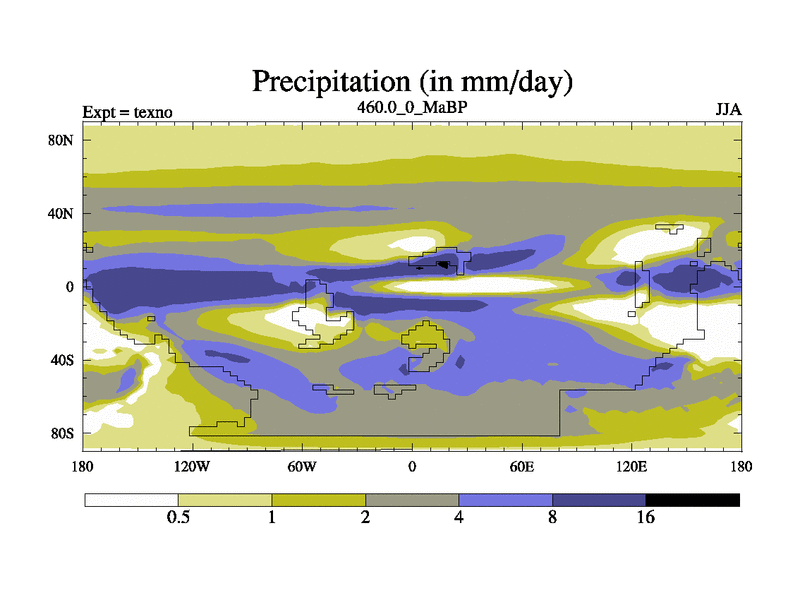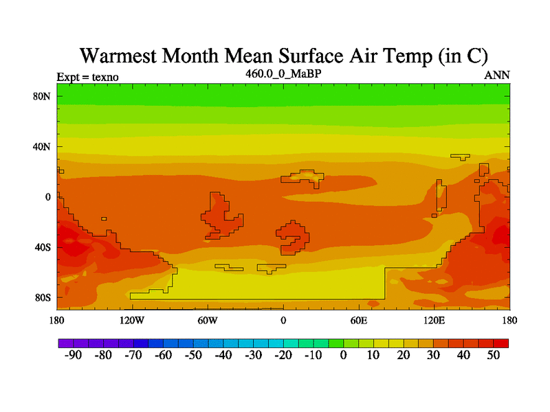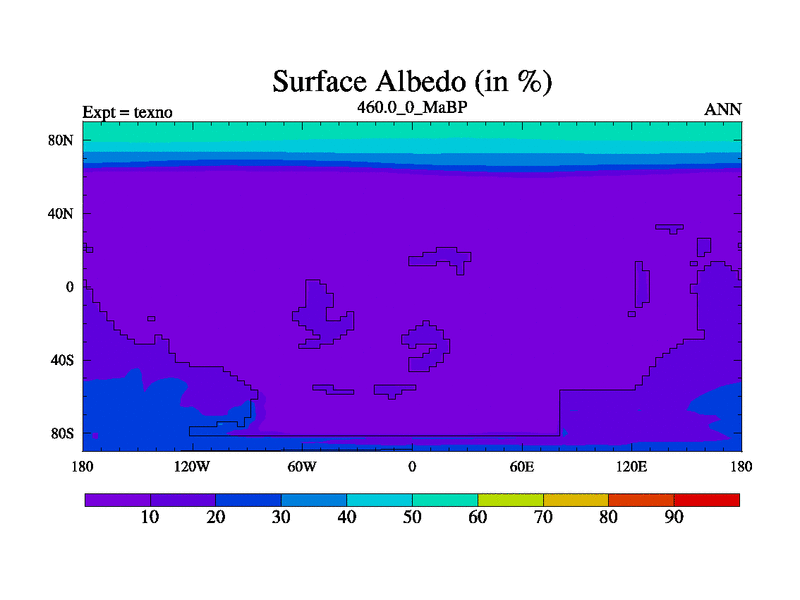 This is the 460.0 Ma simulation using the Scotese palaeogeographies. High output extension of the 5000 year spinup.