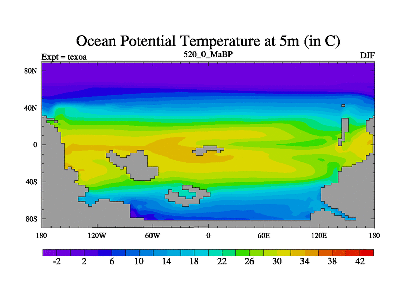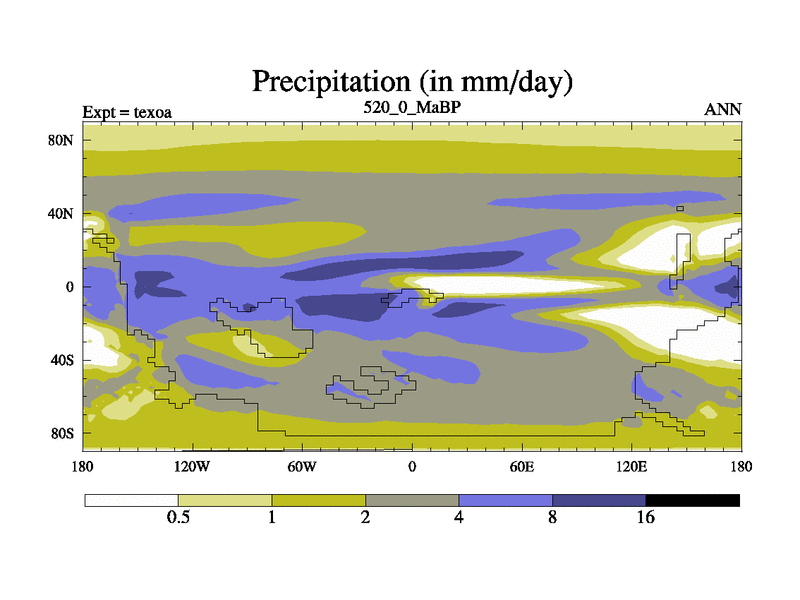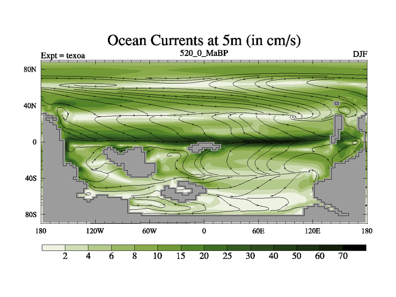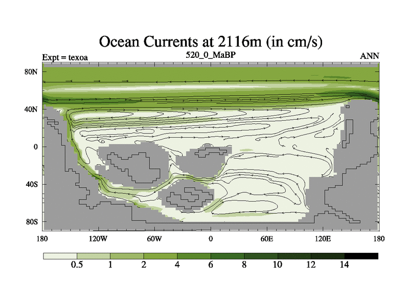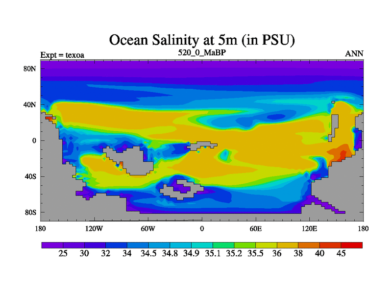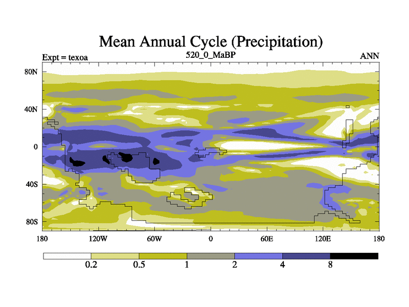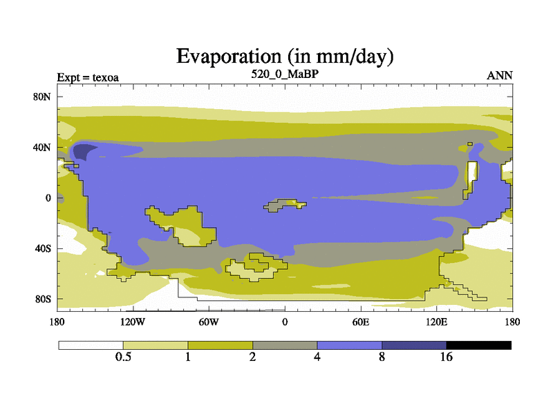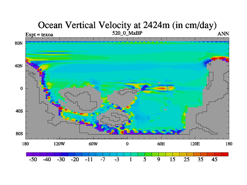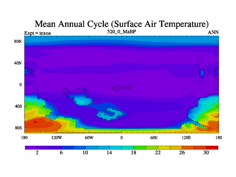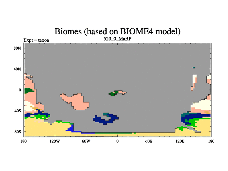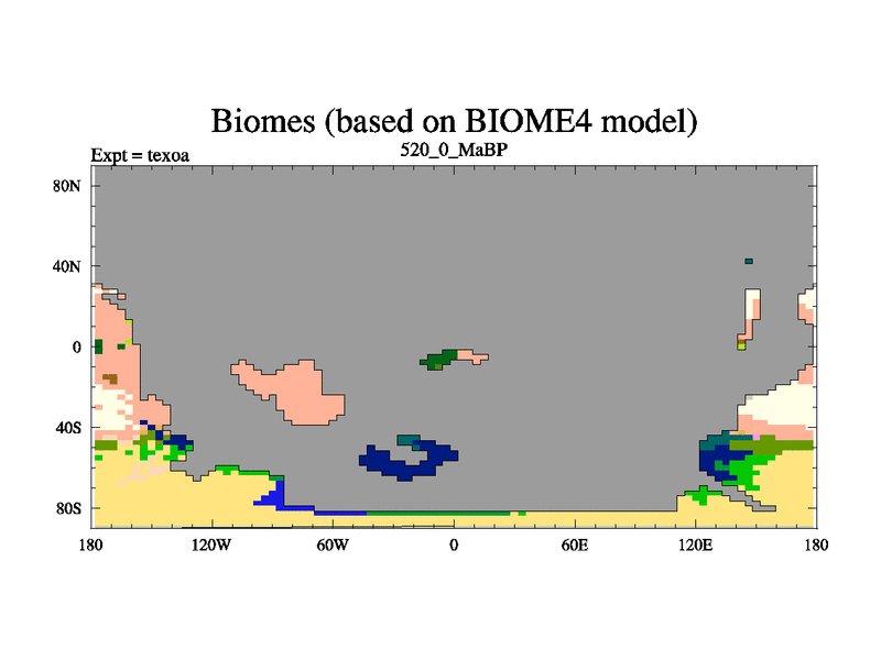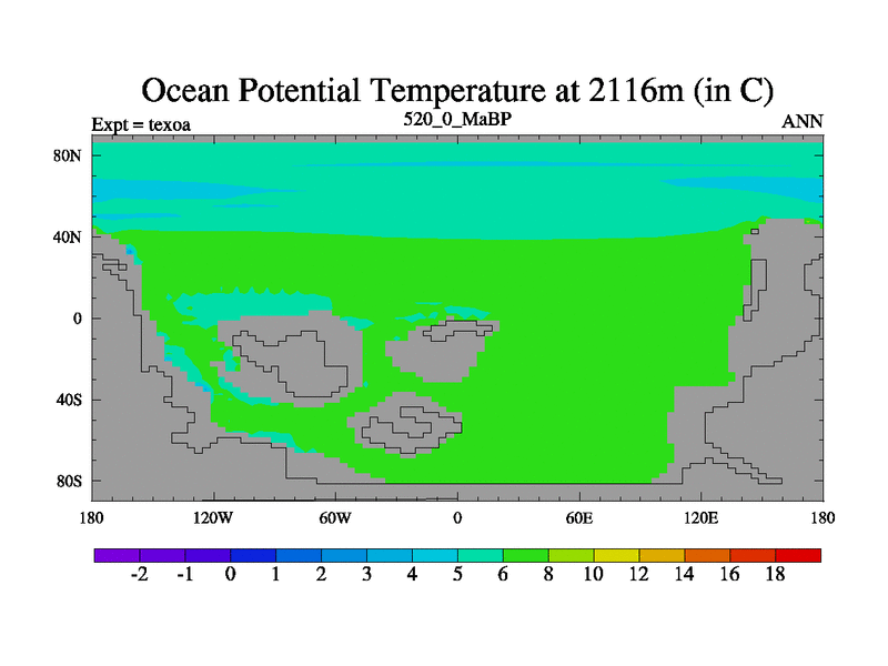 This is the 520.0 Ma simulation using the Scotese palaeogeographies. High output extension of the 5000 year spinup.
