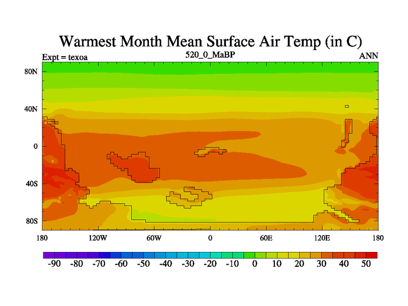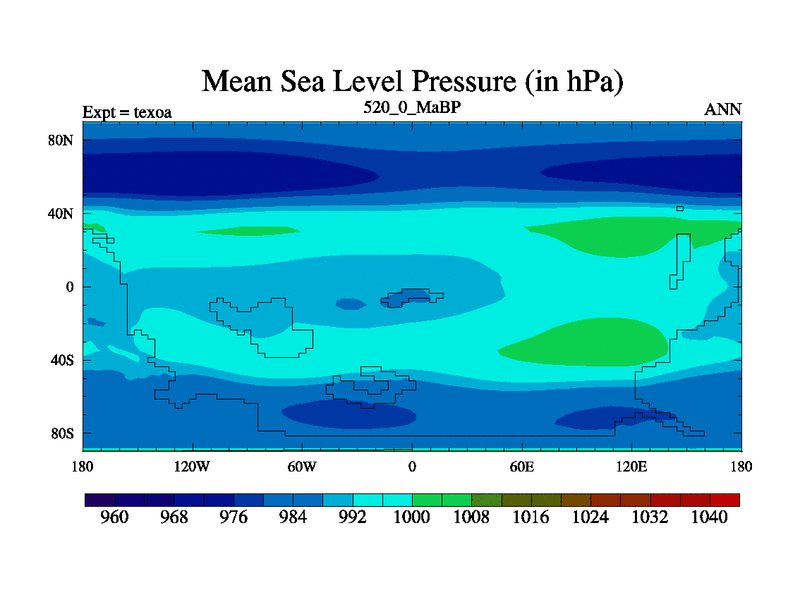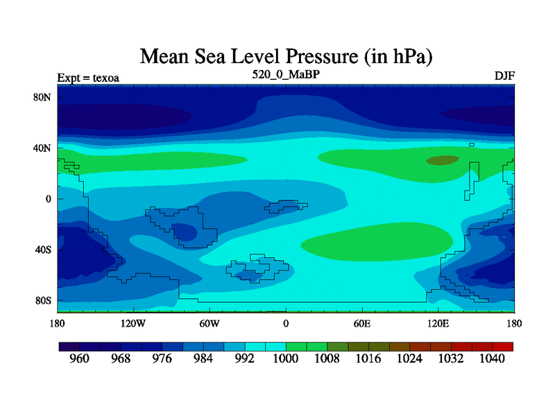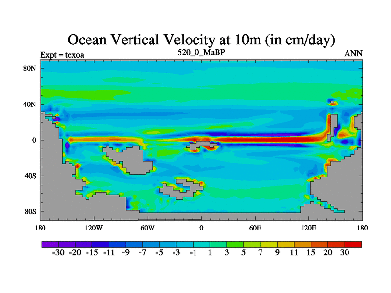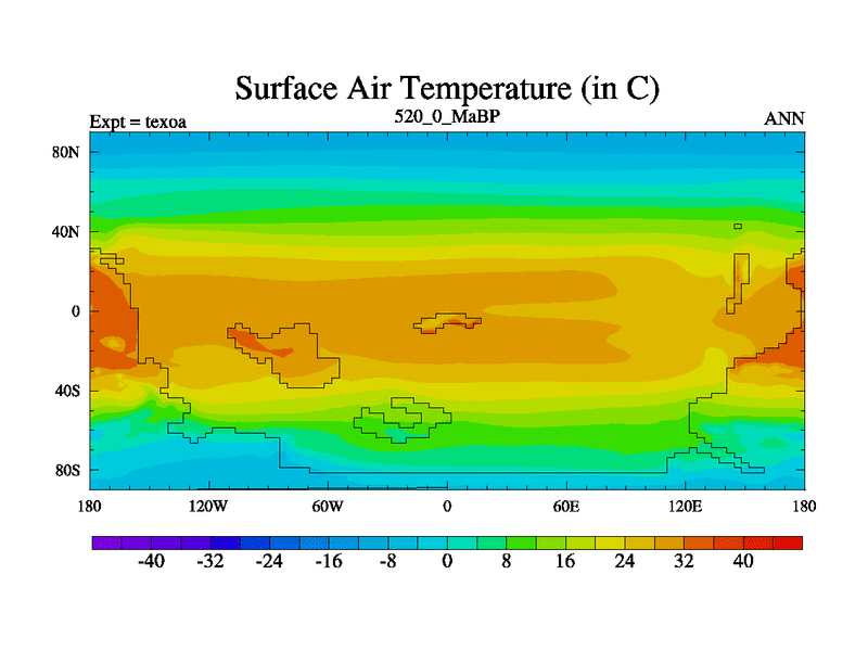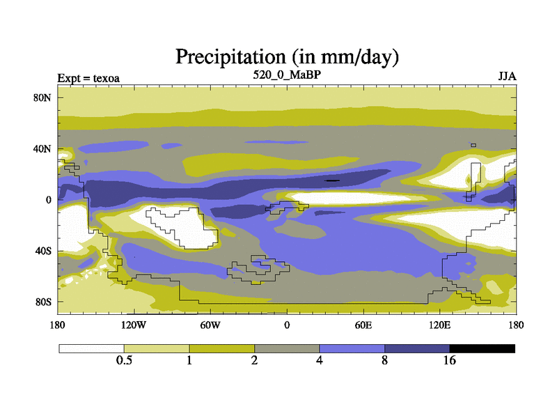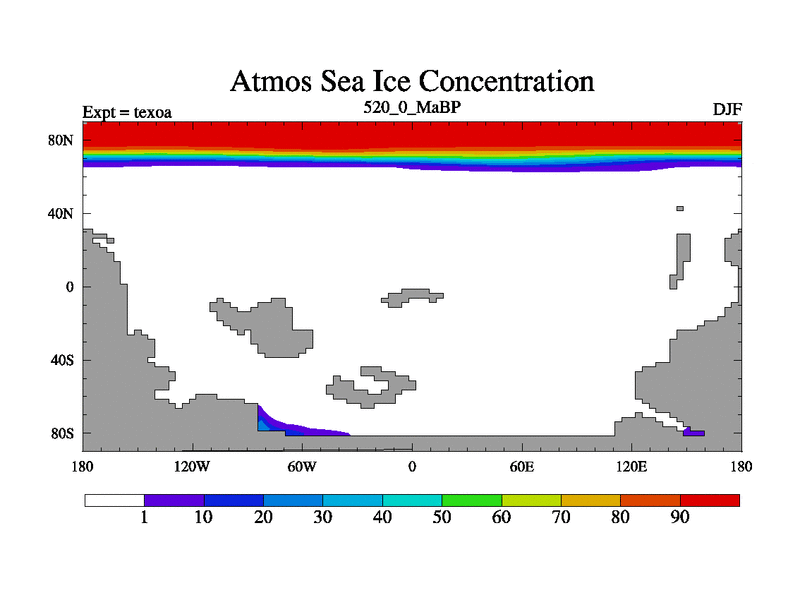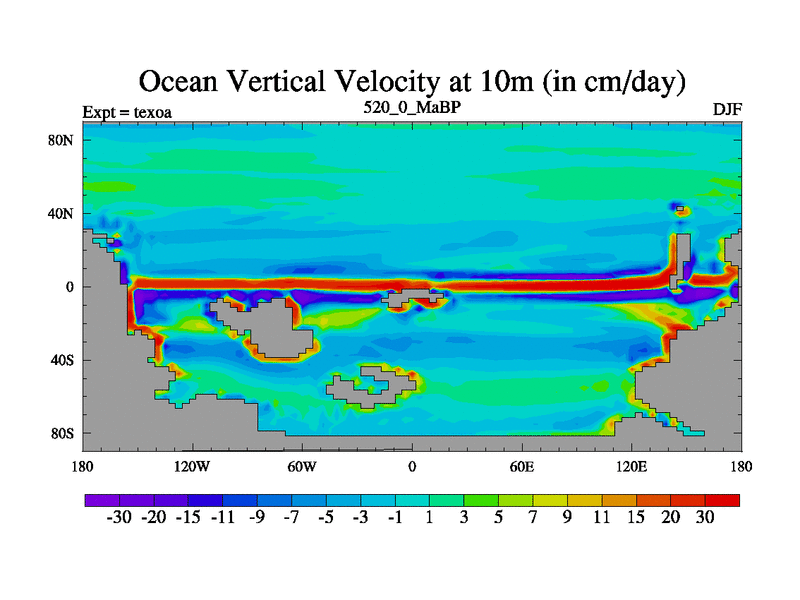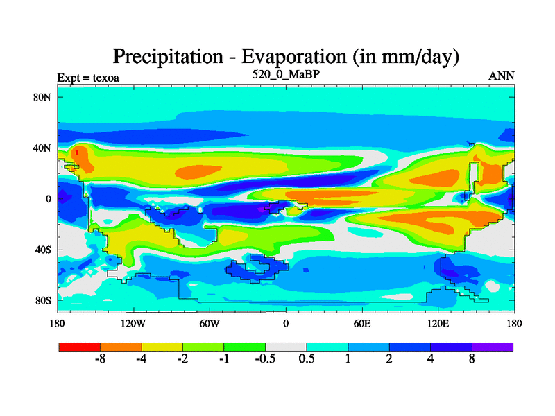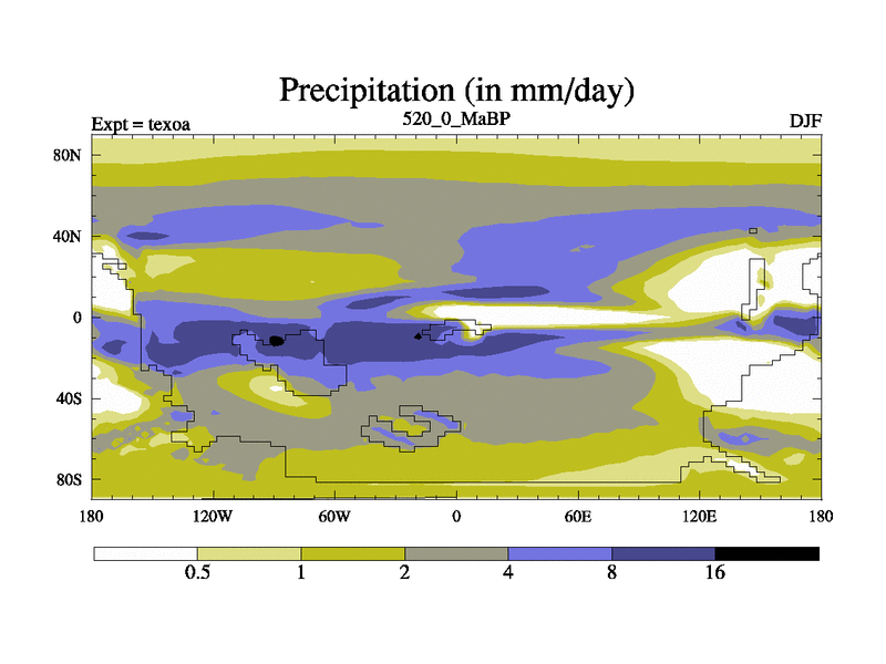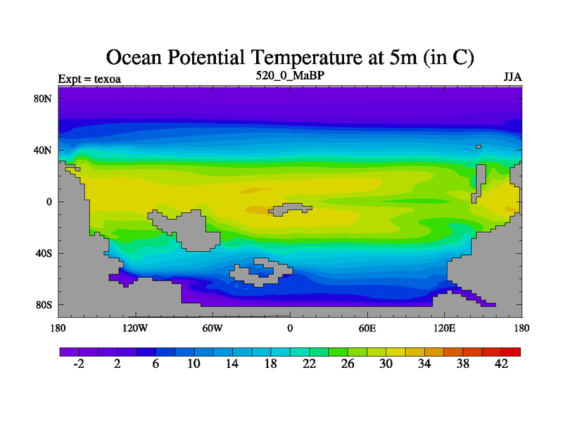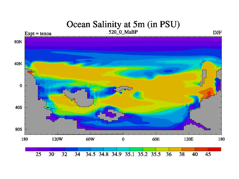 This is the 520.0 Ma simulation using the Scotese palaeogeographies. High output extension of the 5000 year spinup.