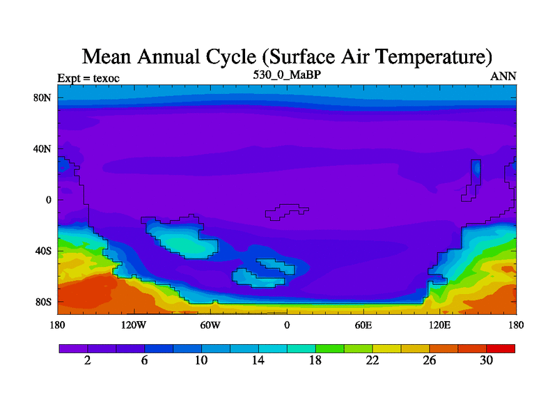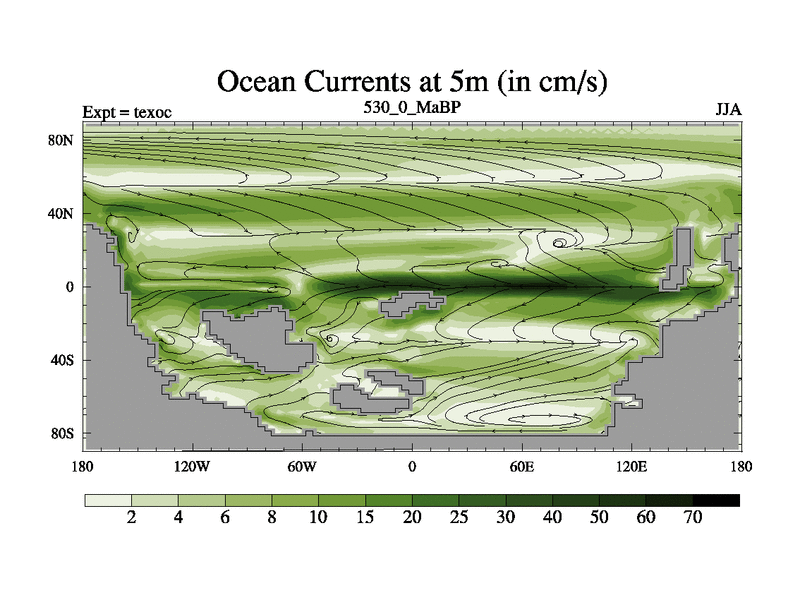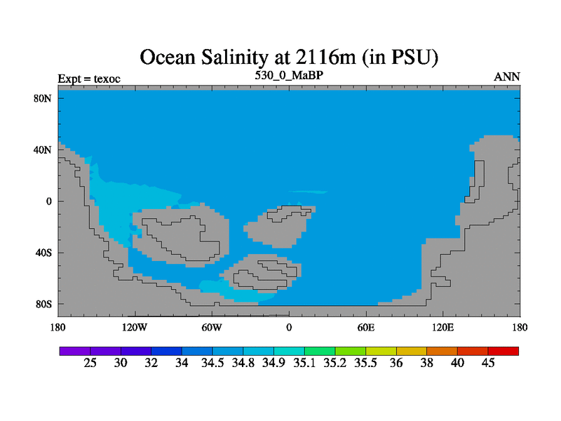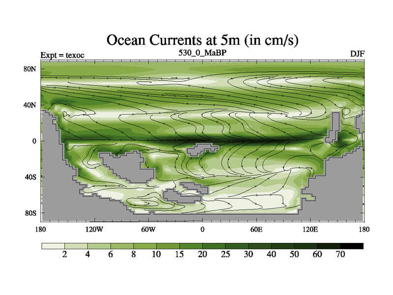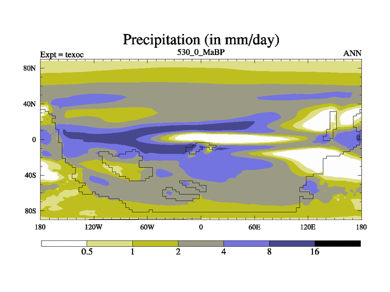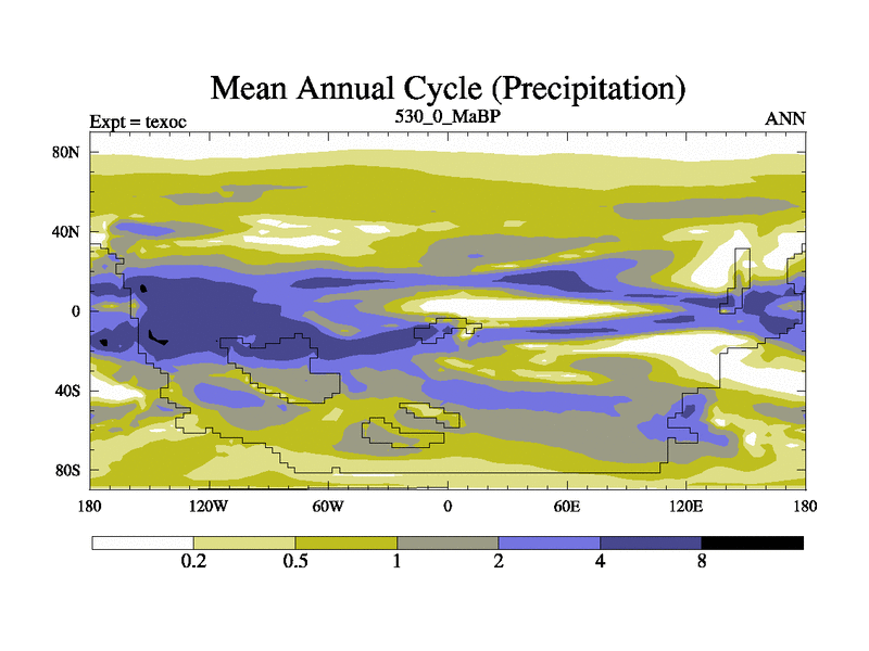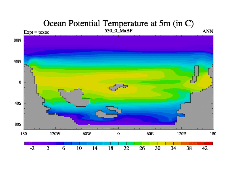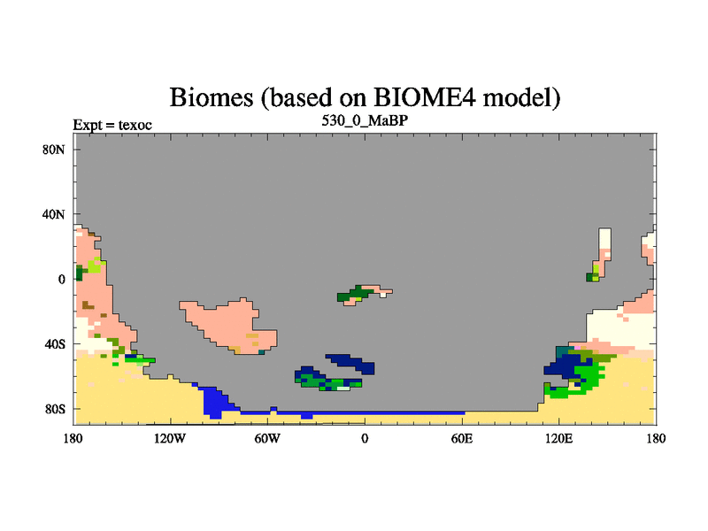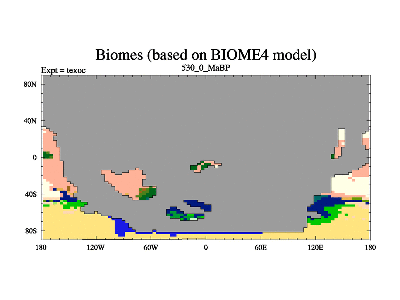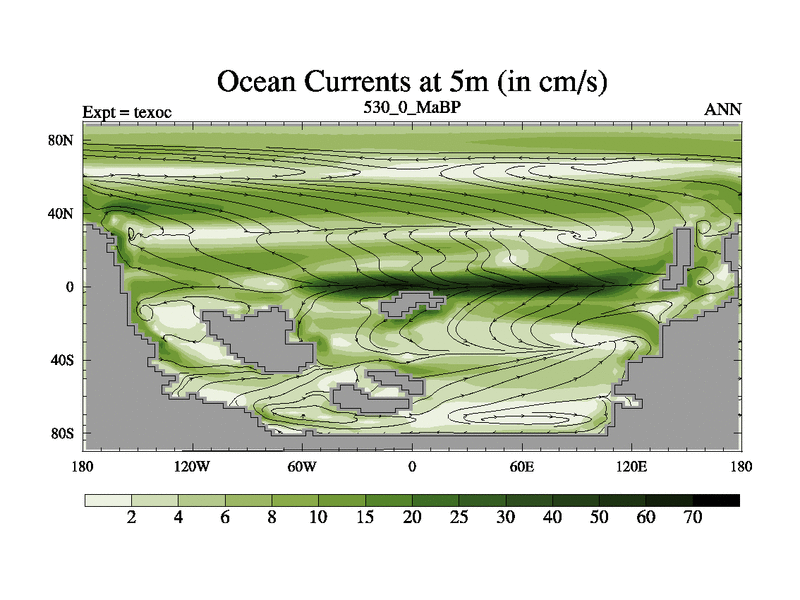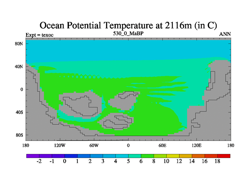 This is the 530.0 Ma simulation using the Scotese palaeogeographies. High output extension of the 5000 year spinup.