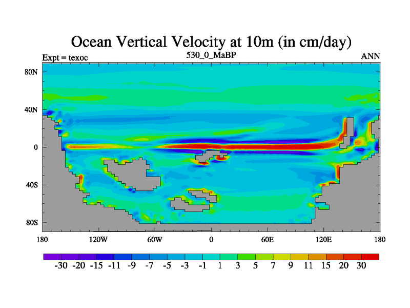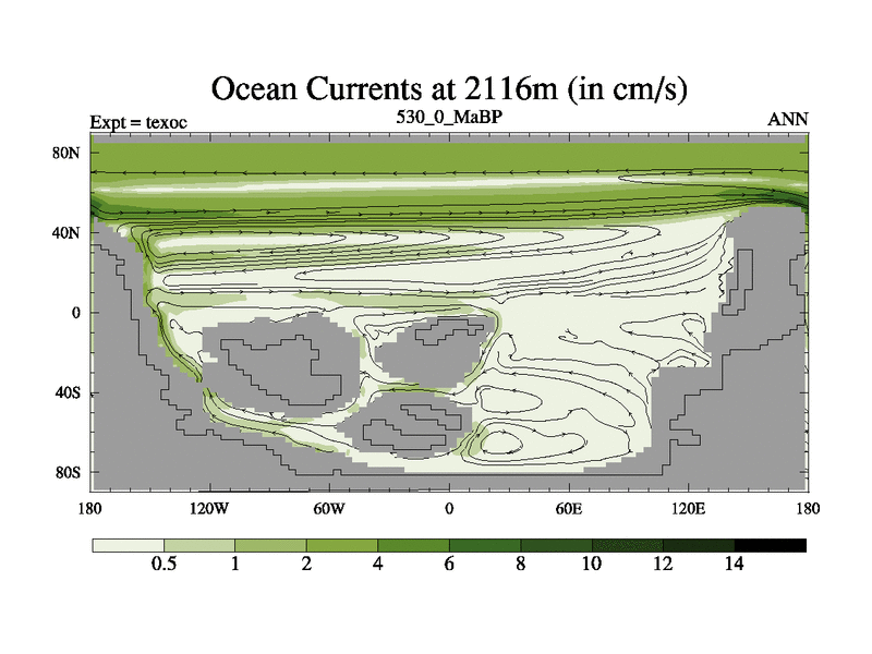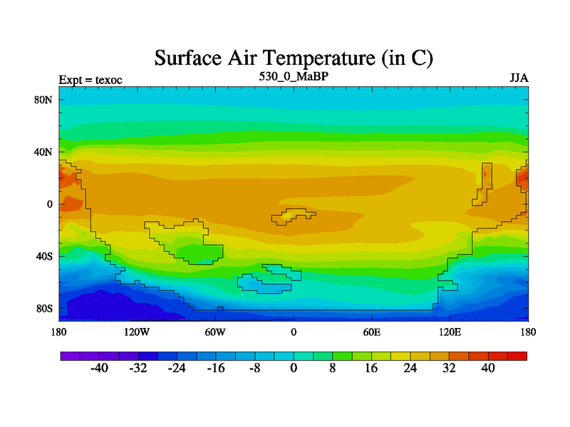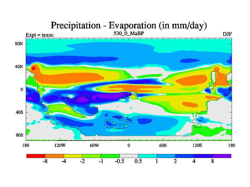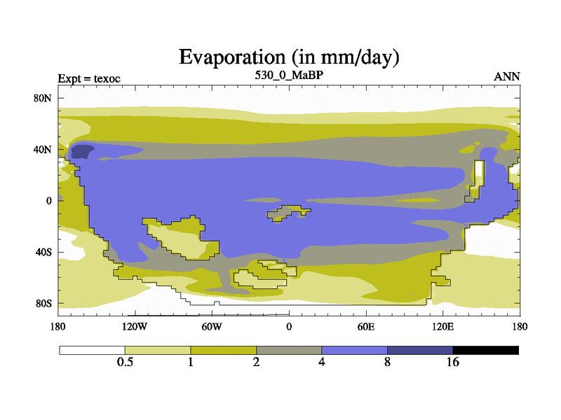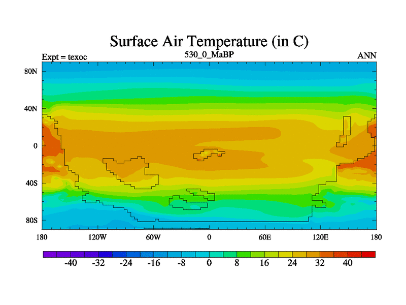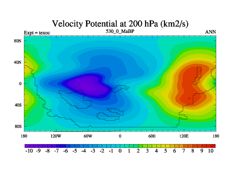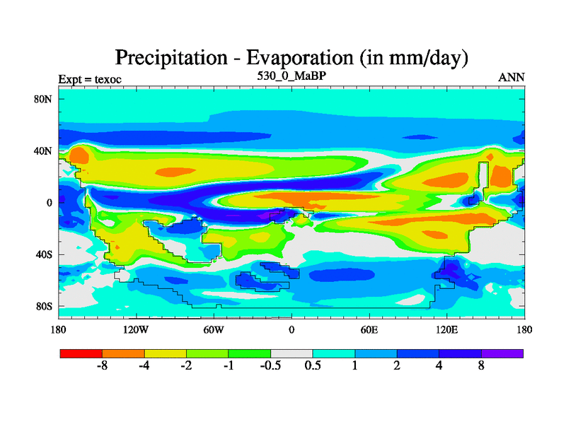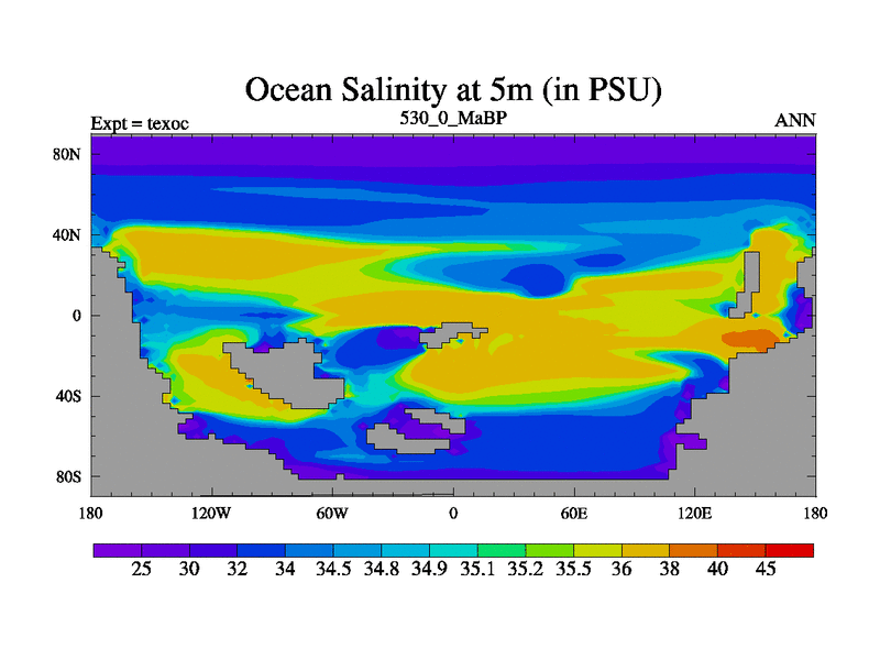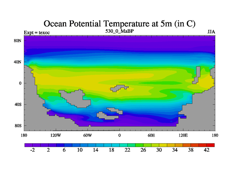 This is the 530.0 Ma simulation using the Scotese palaeogeographies. High output extension of the 5000 year spinup.
