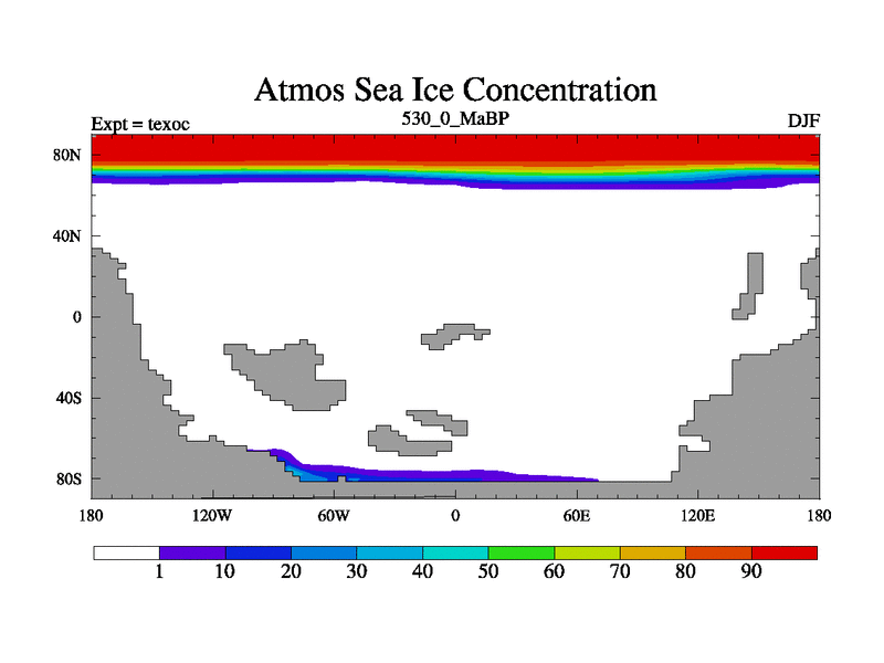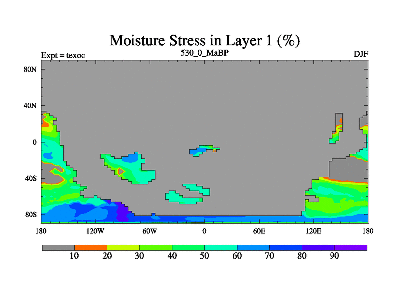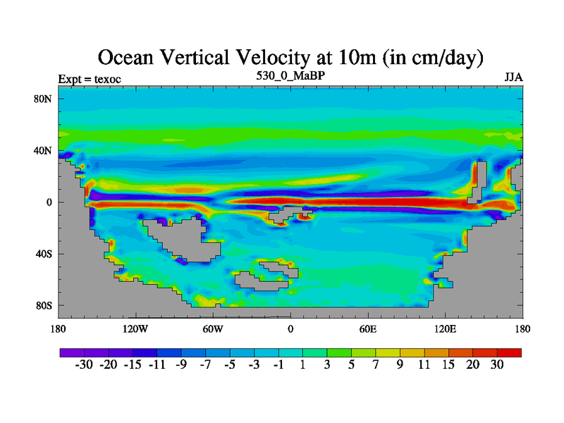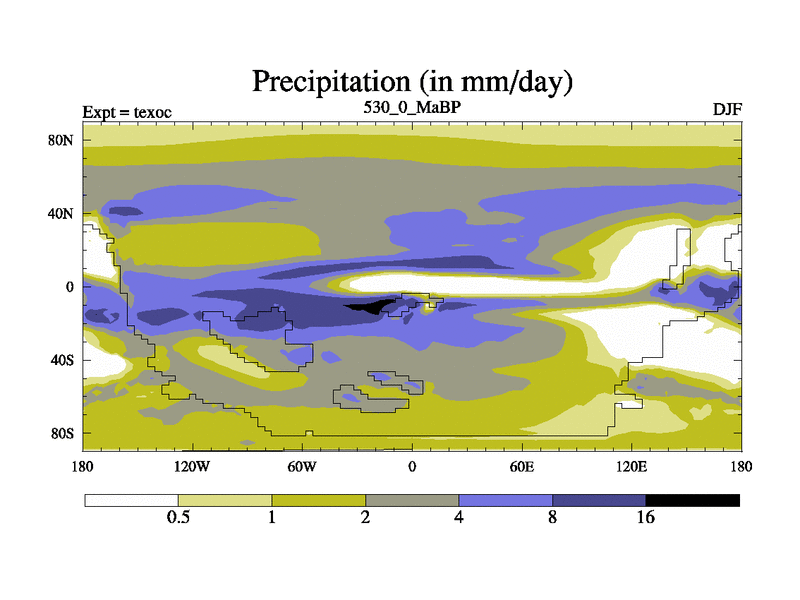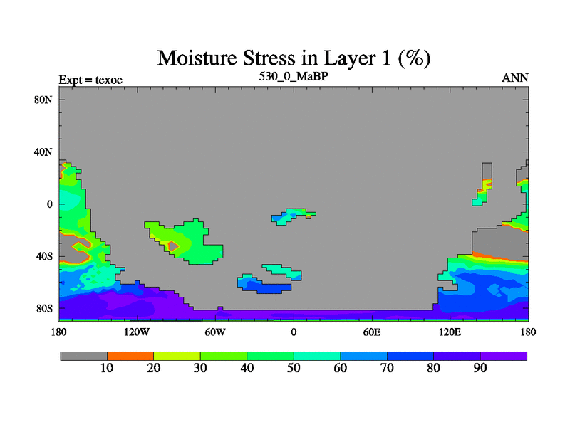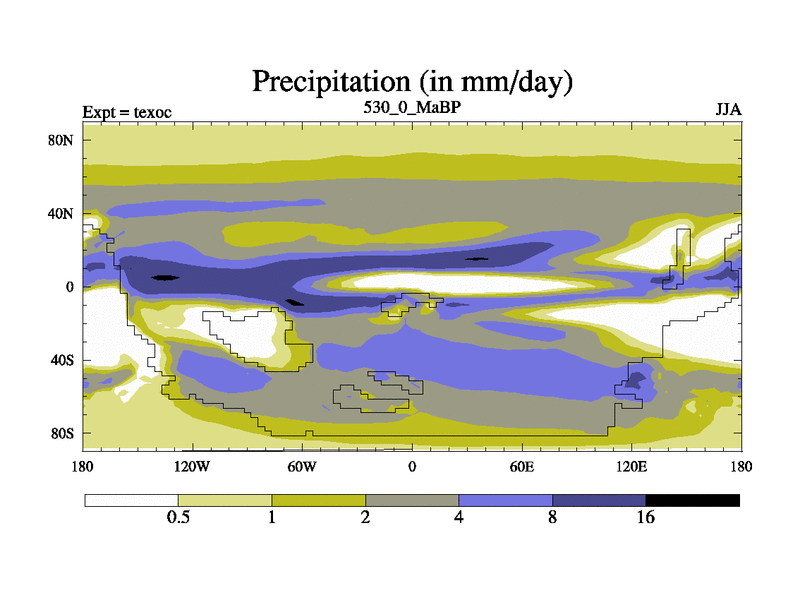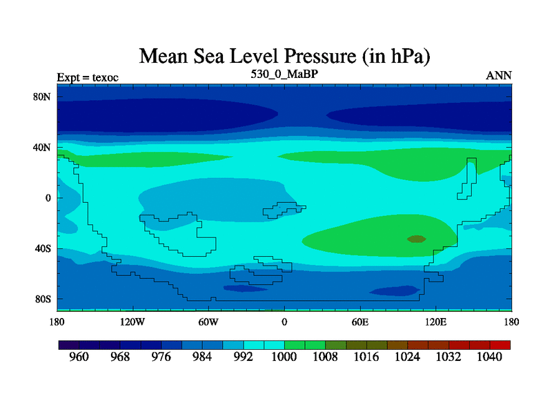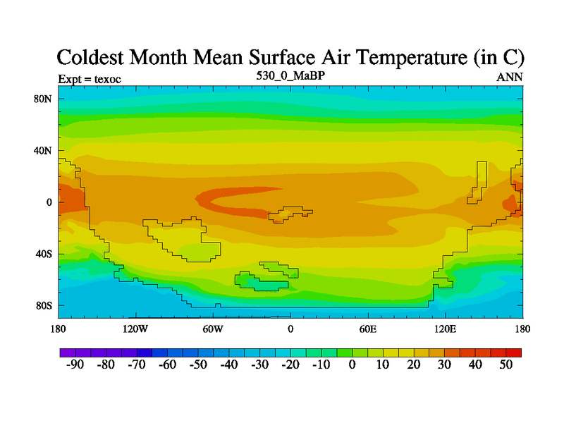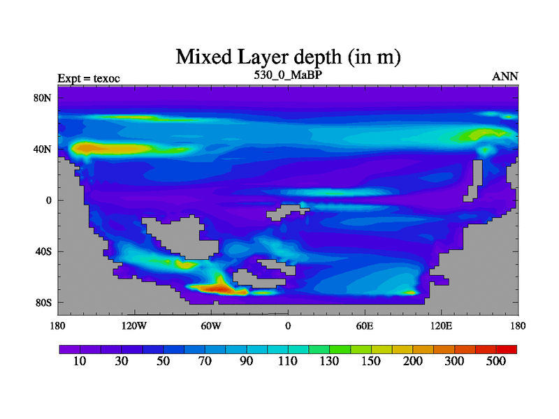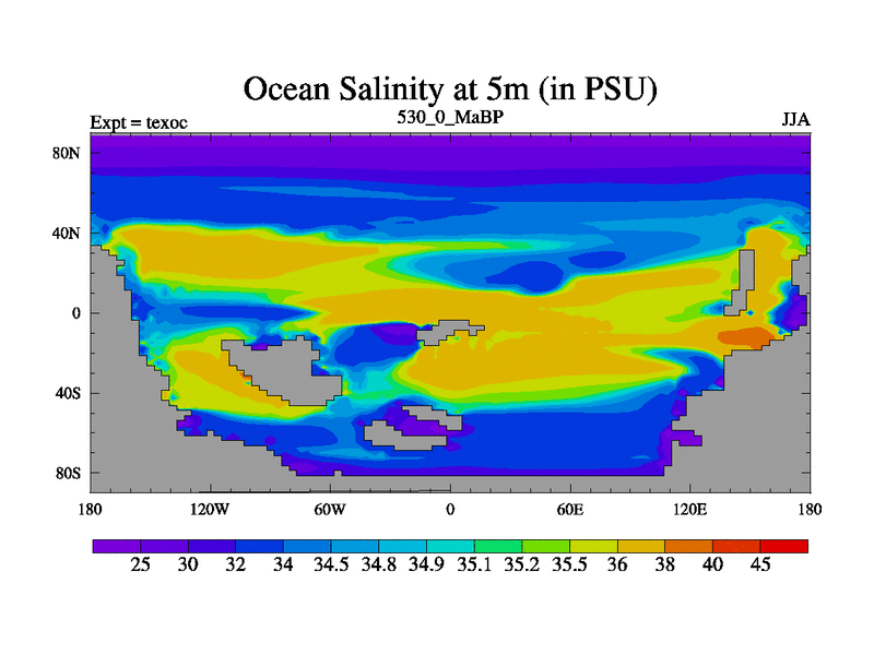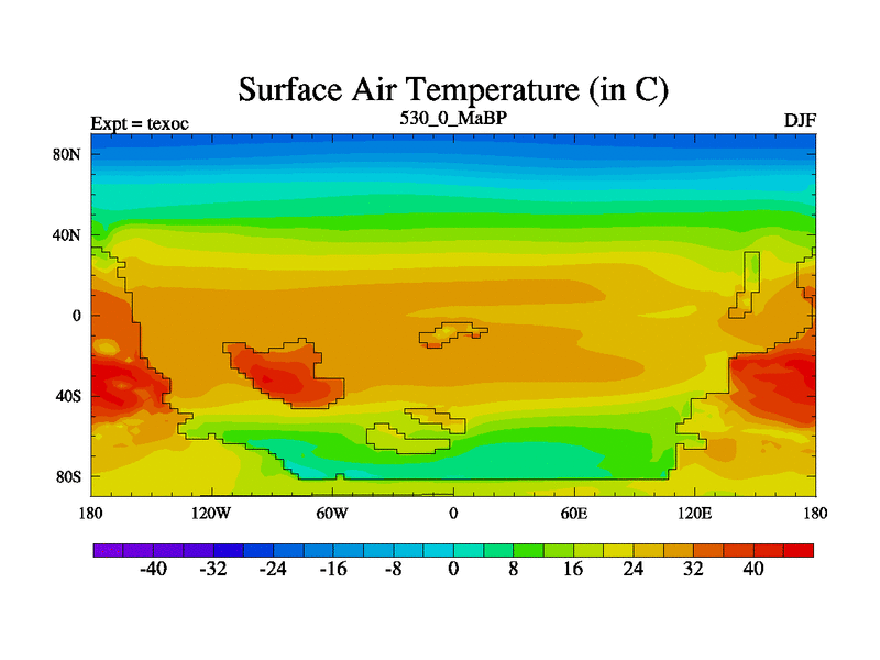 This is the 530.0 Ma simulation using the Scotese palaeogeographies. High output extension of the 5000 year spinup.
