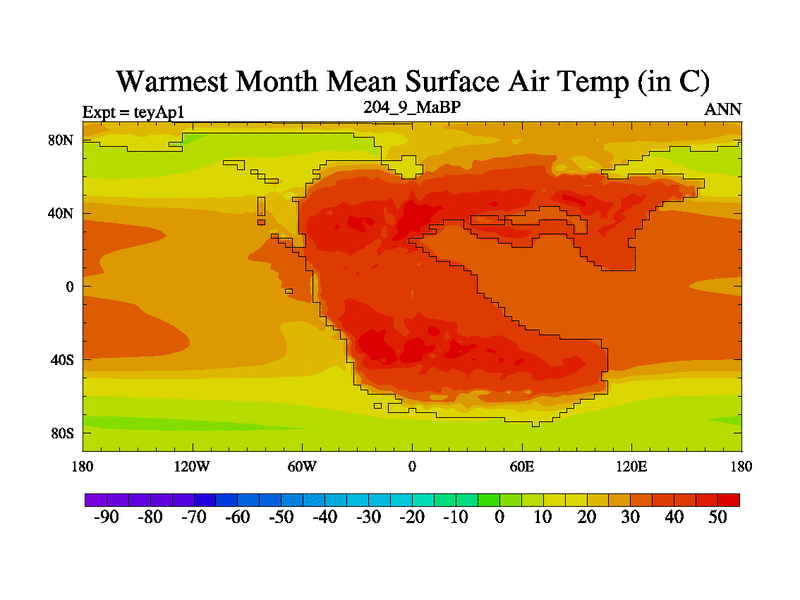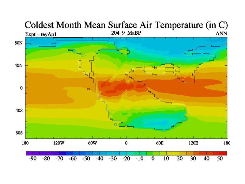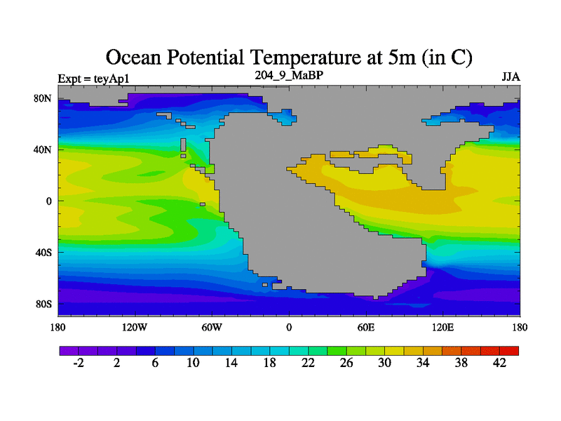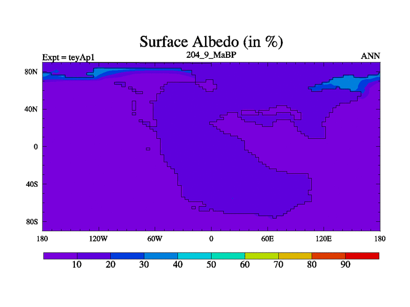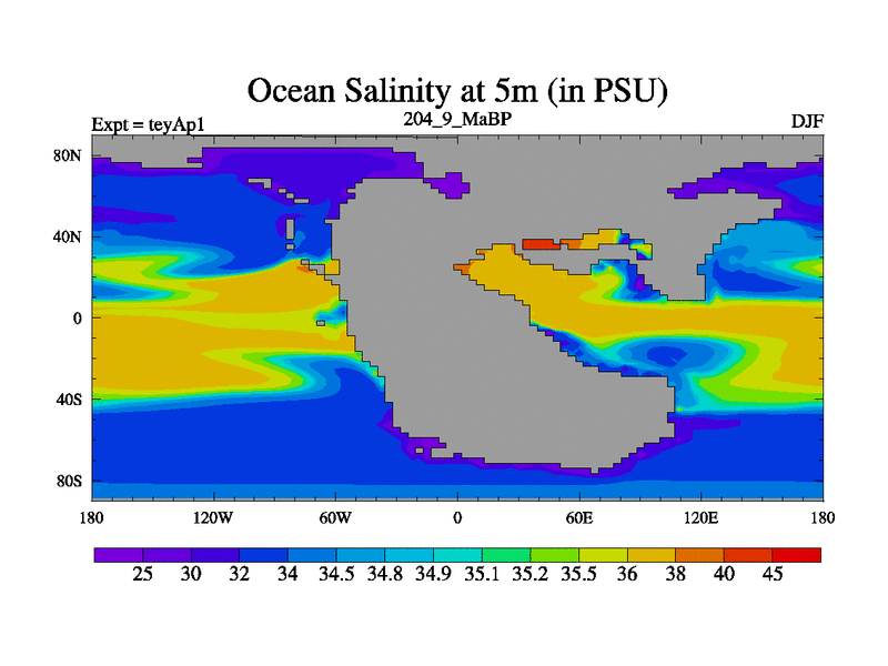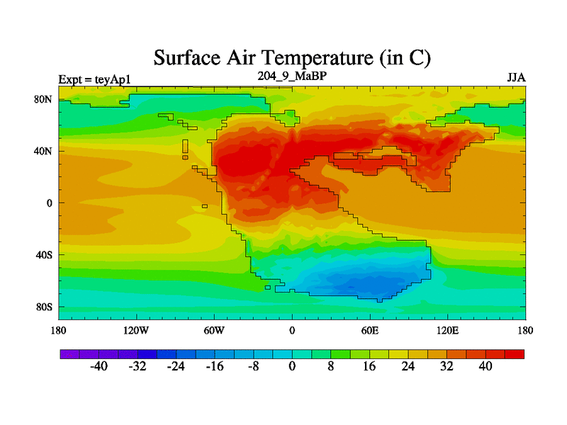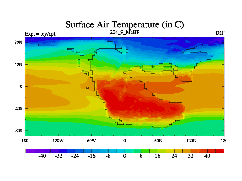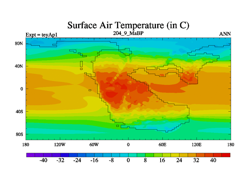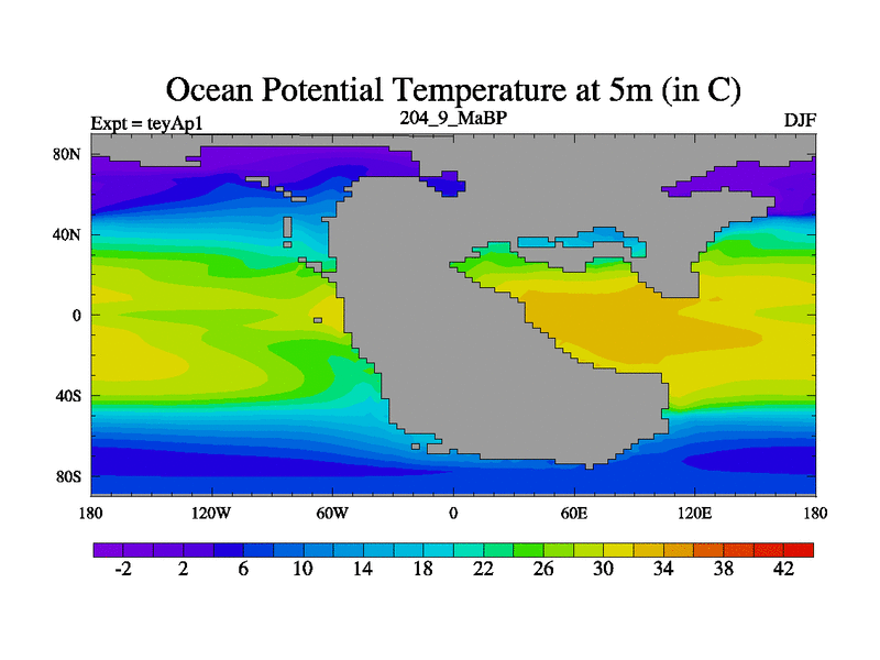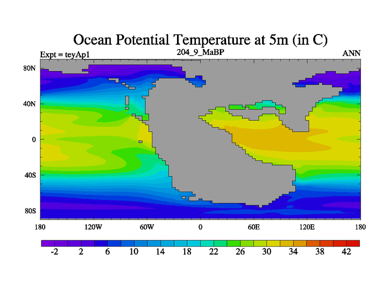 This is the 204.9 Ma simulation using the Scotese palaeogeographies. Extension of the tex[f..j] series.