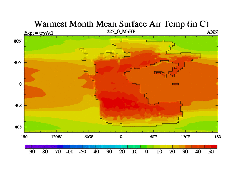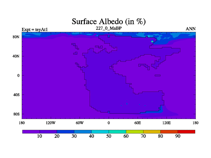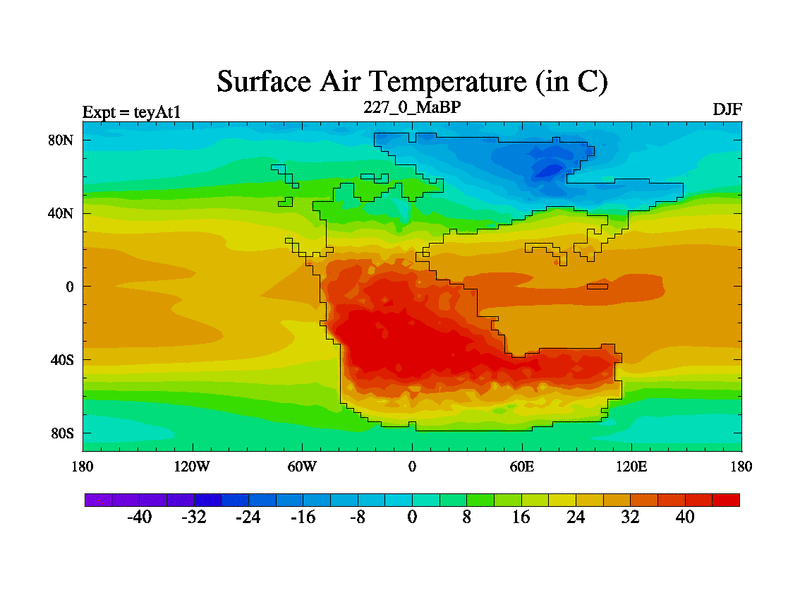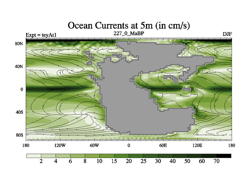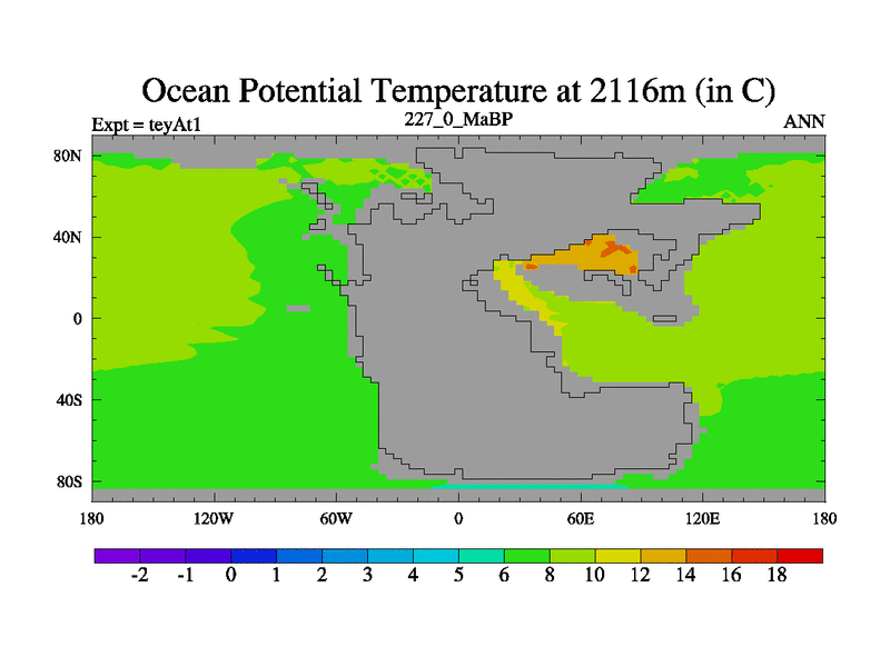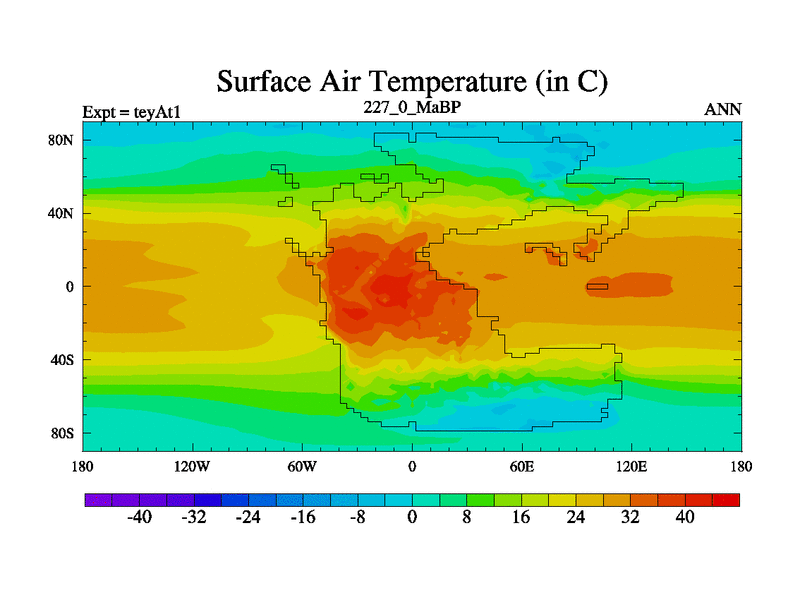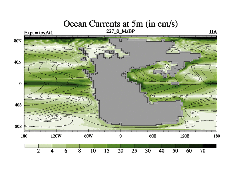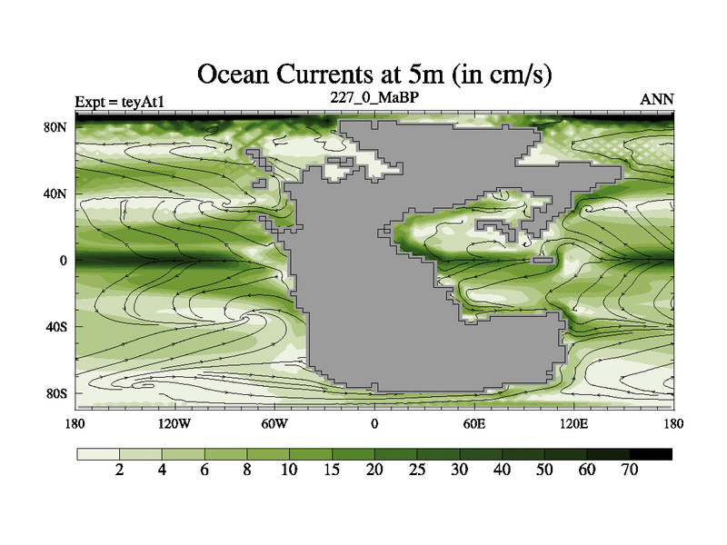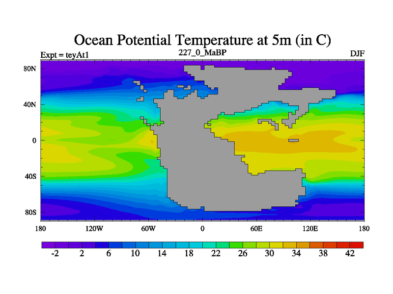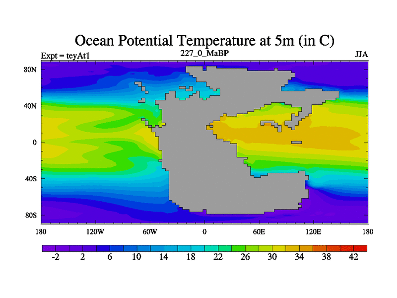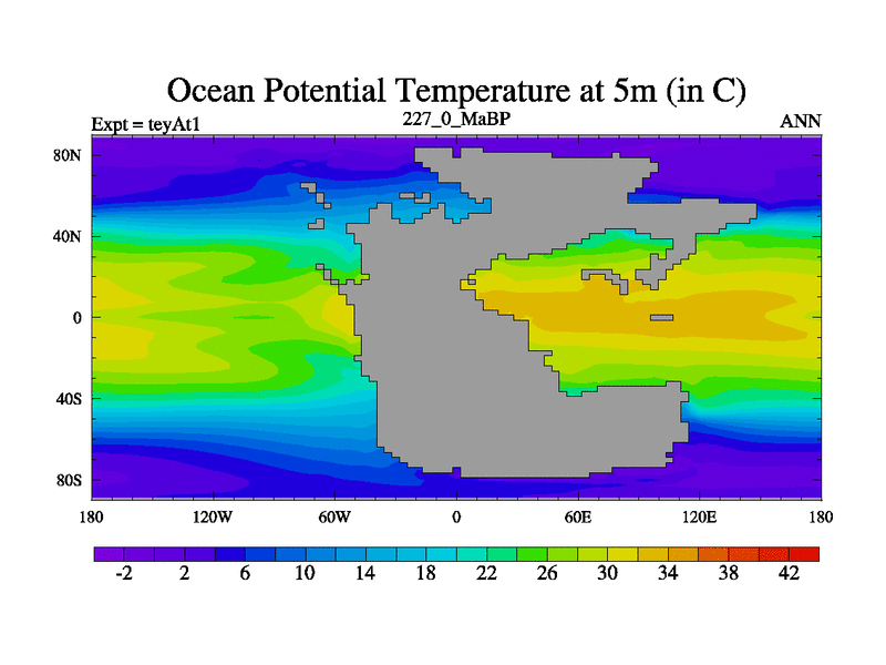 This is the 227.0 Ma simulation using the Scotese palaeogeographies. Extension of the tex[f..j] series.