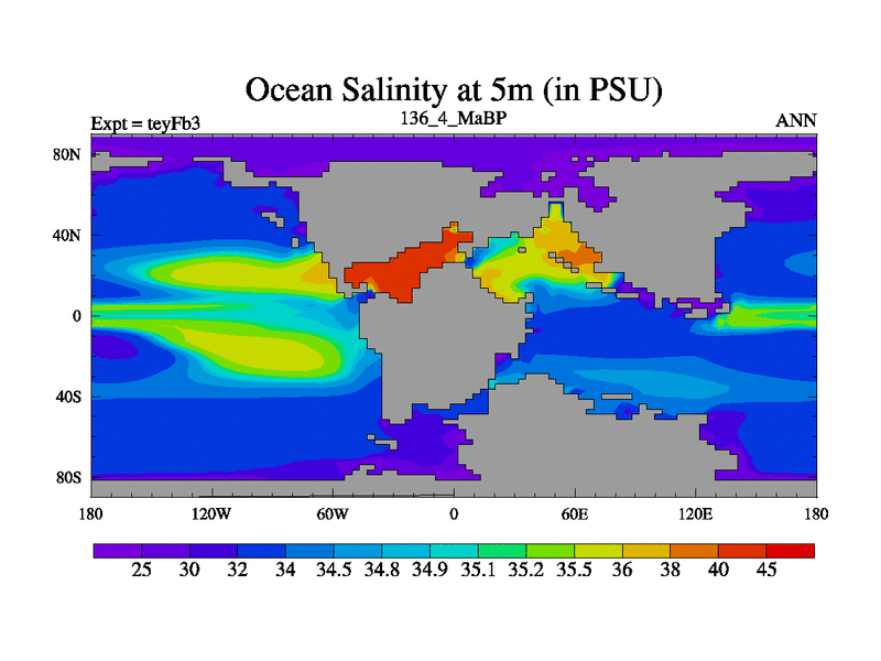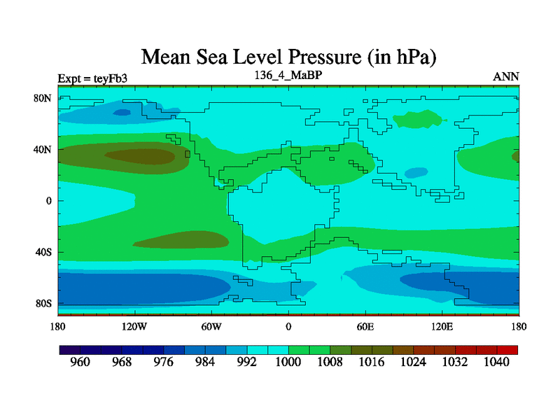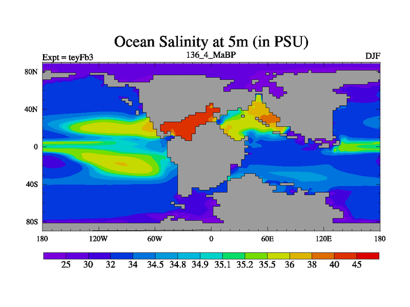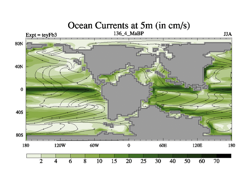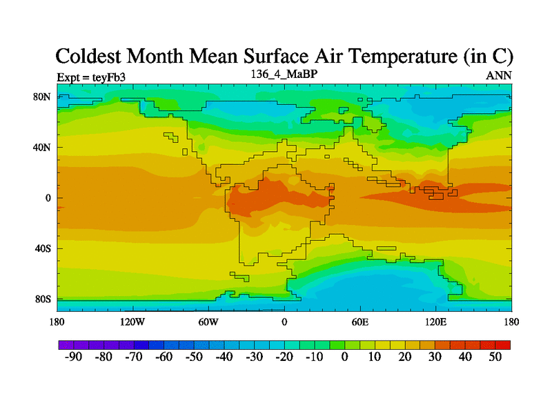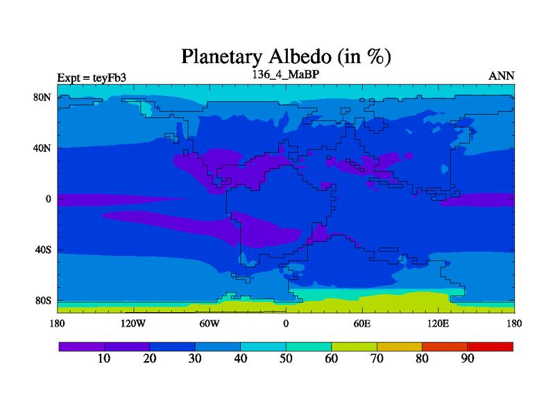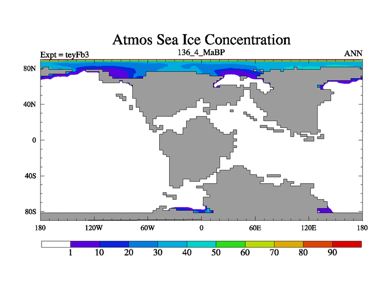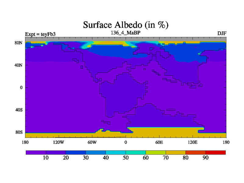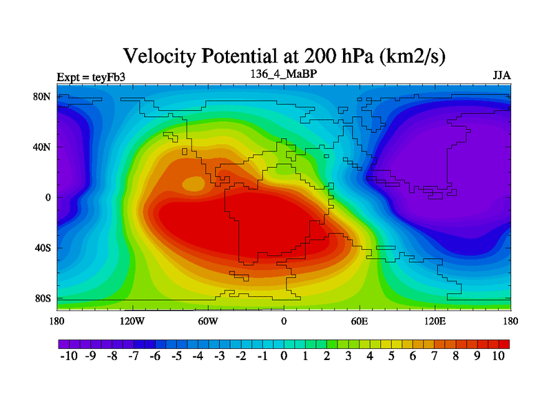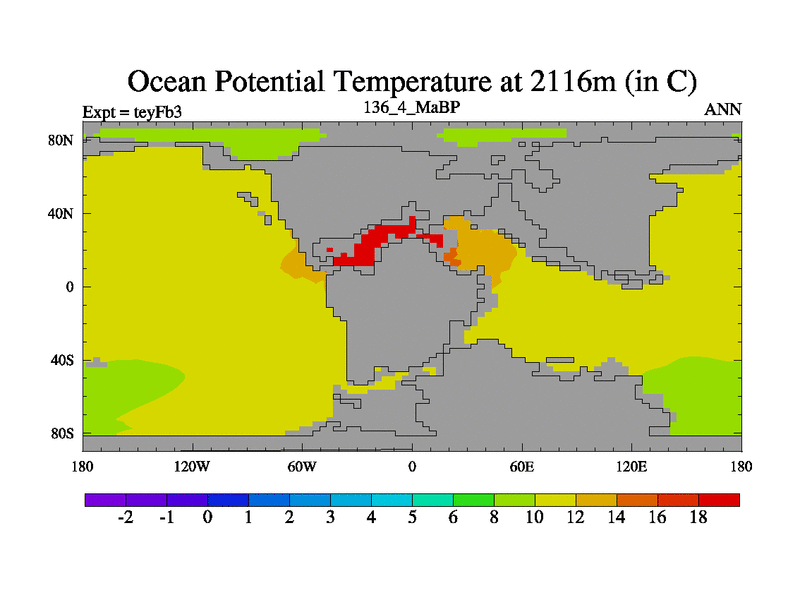 This is the 136.4 Ma simulation using the Scotese palaeogeographies and revised CCN etc. Updated HadCM3L ocean parameters and soil parameters. Also made sure orography gravity wave drag was consistent.