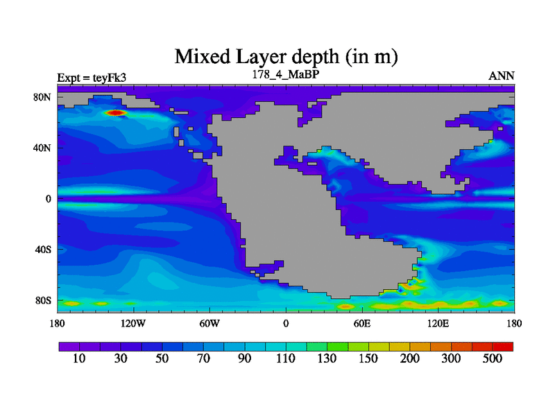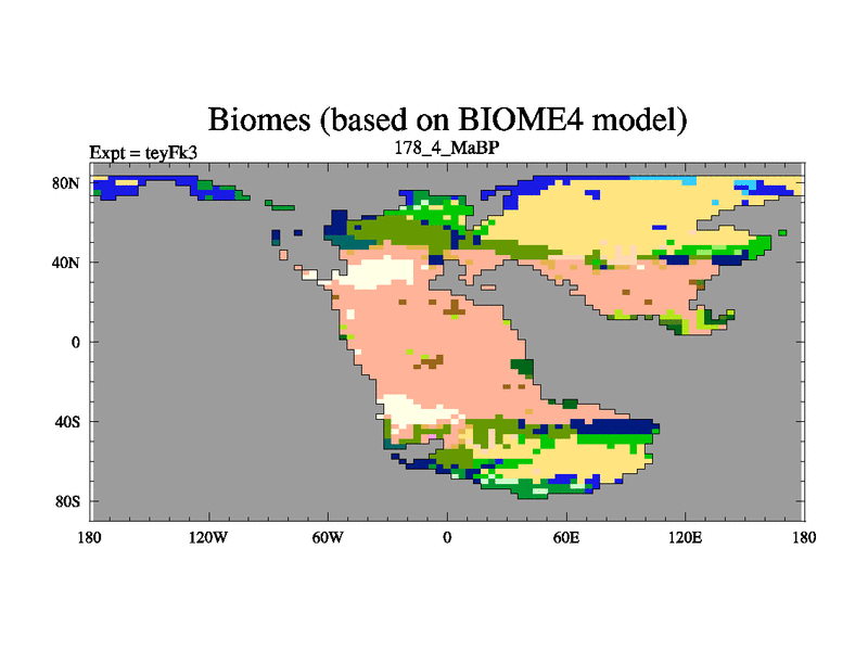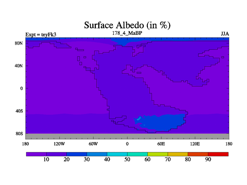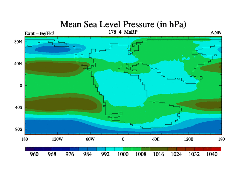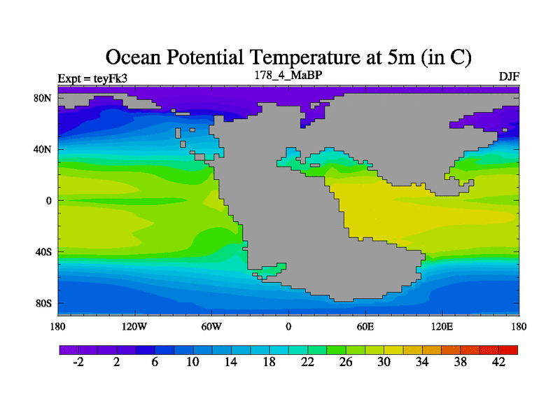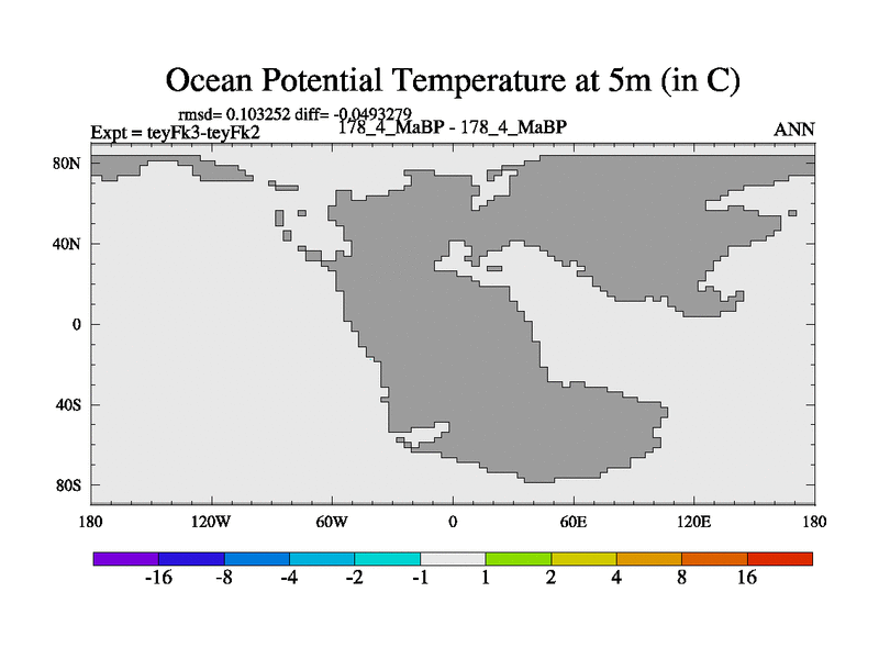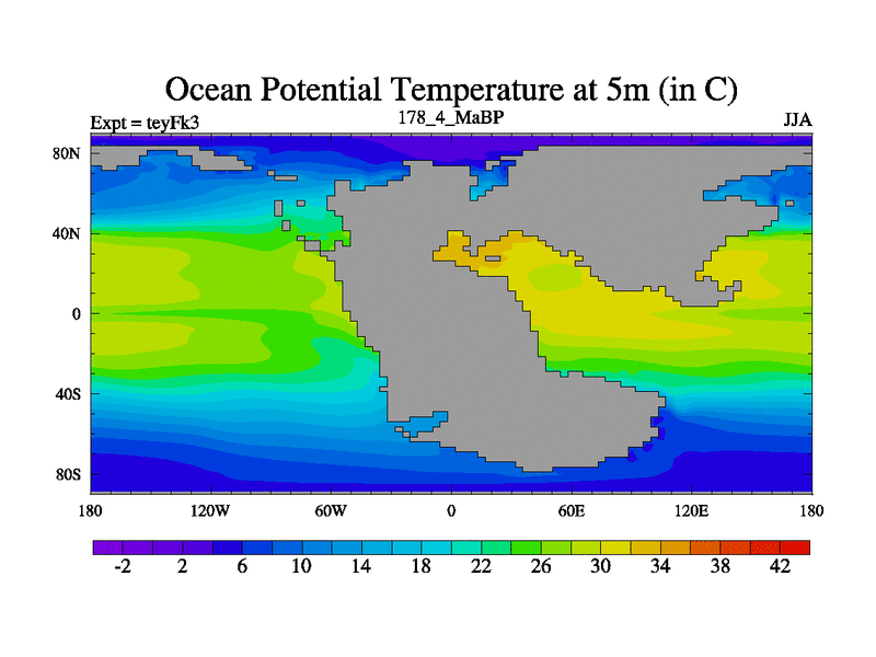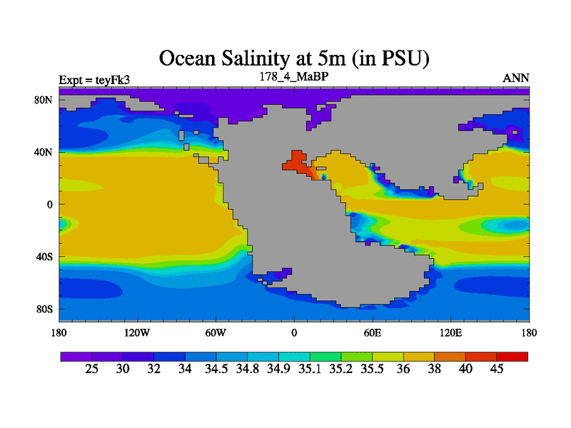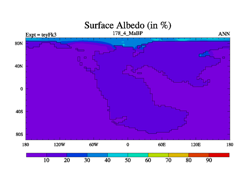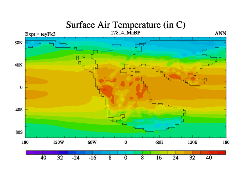 This is the 178.4 Ma simulation using the Scotese palaeogeographies and revised CCN etc. Updated HadCM3L ocean parameters and soil parameters. Also made sure orography gravity wave drag was consistent.
