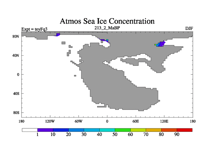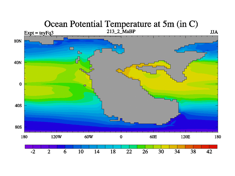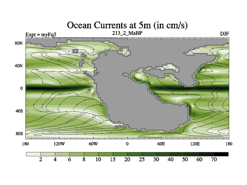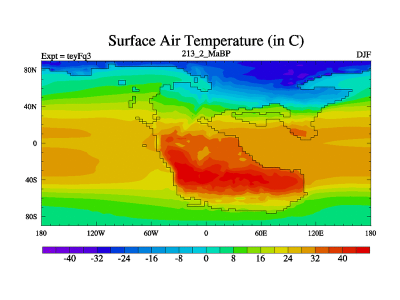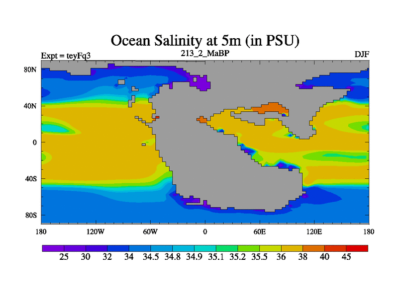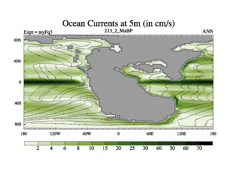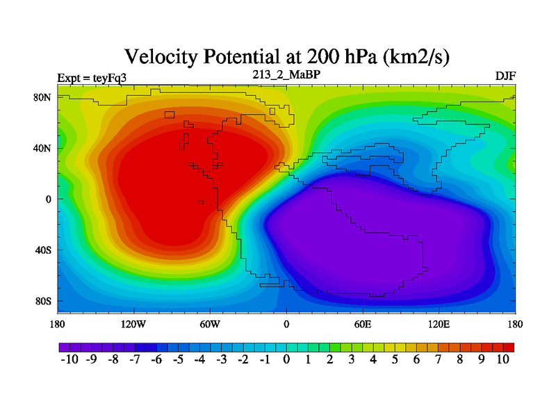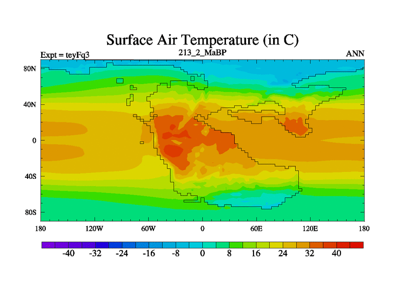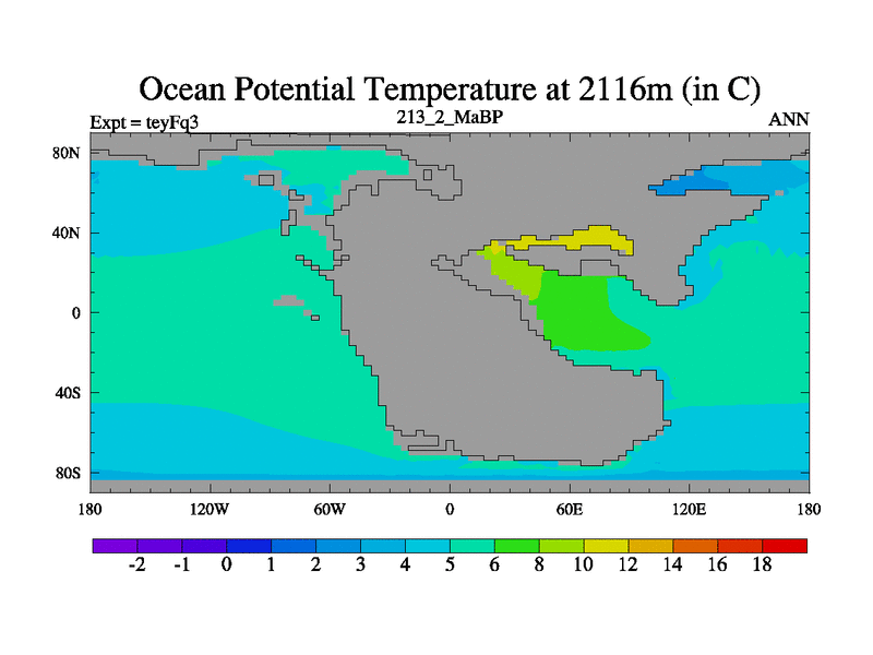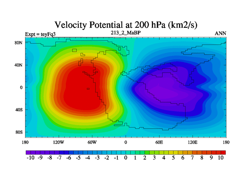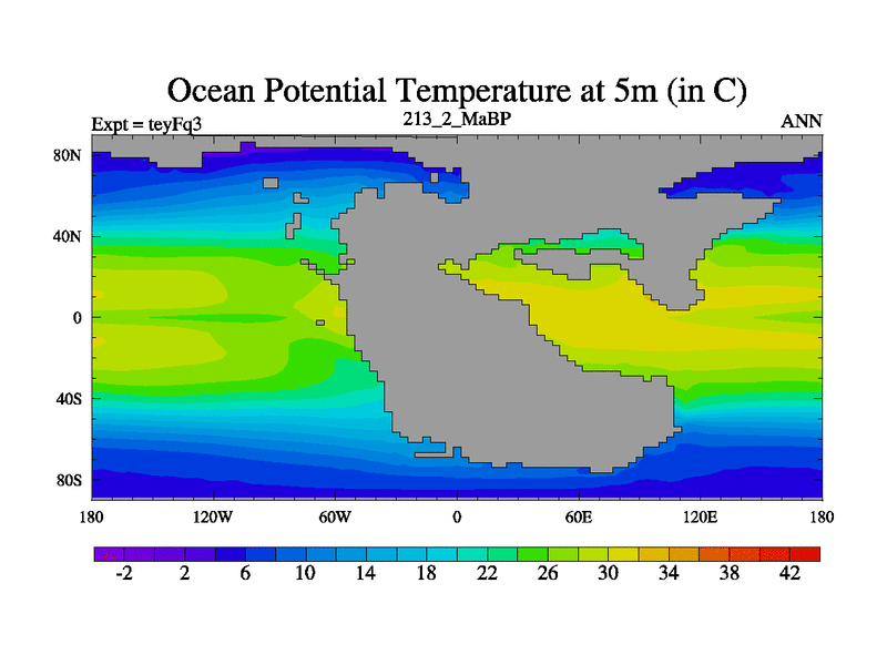 This is the 213.2 Ma simulation using the Scotese palaeogeographies and revised CCN etc. Updated HadCM3L ocean parameters and soil parameters. Also made sure orography gravity wave drag was consistent.