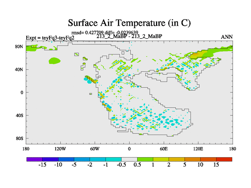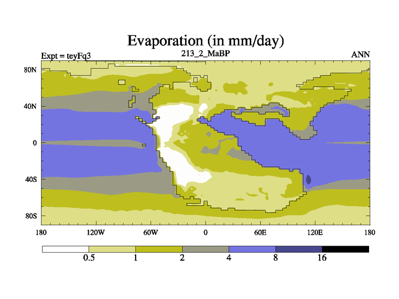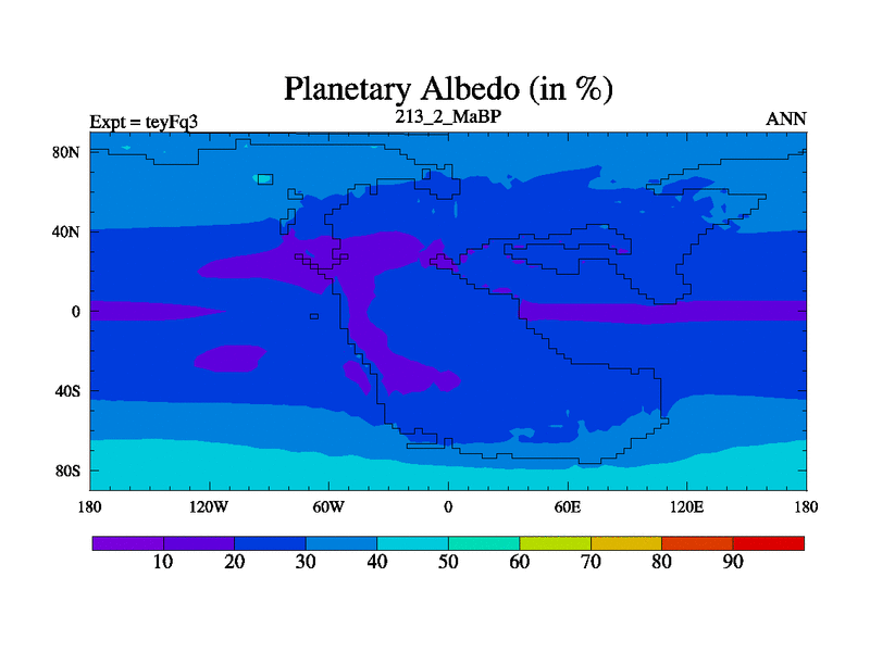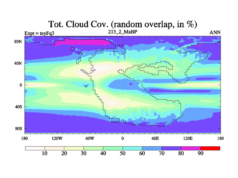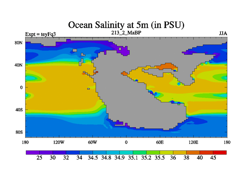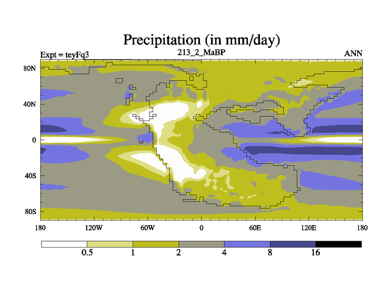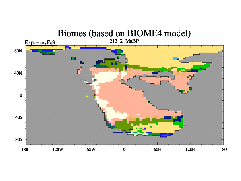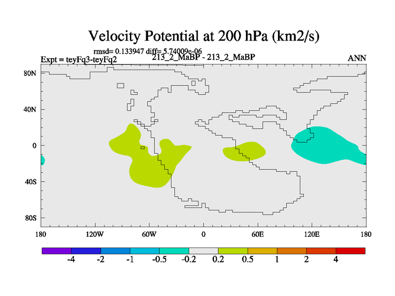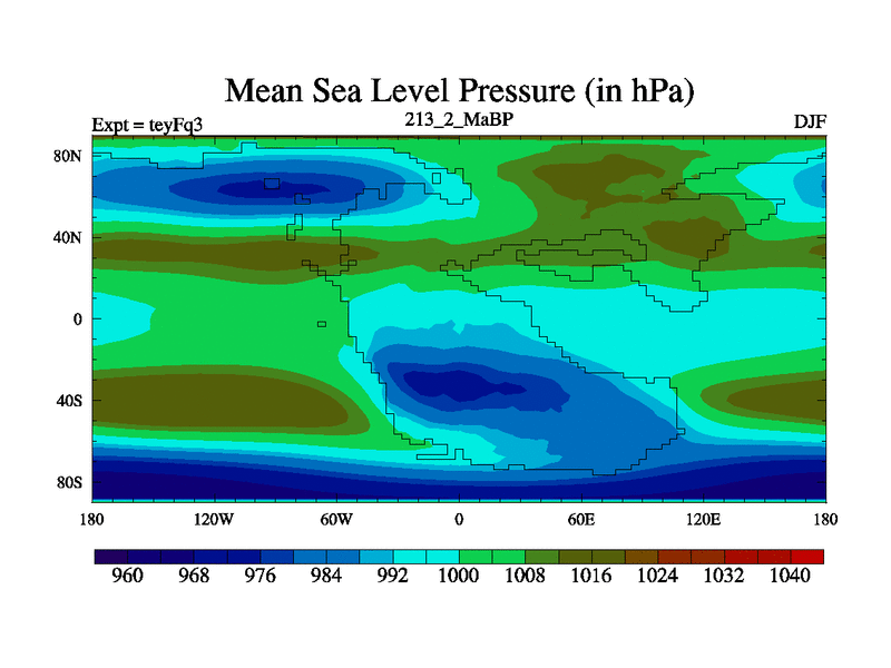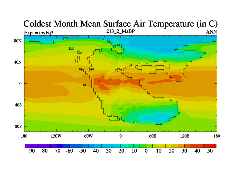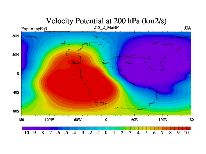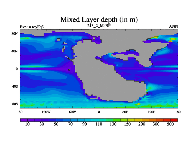This is the 213.2 Ma simulation using the Scotese palaeogeographies and revised CCN etc. Updated HadCM3L ocean parameters and soil parameters. Also made sure orography gravity wave drag was consistent.