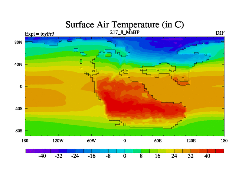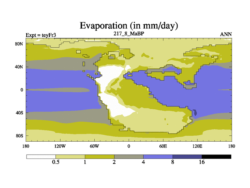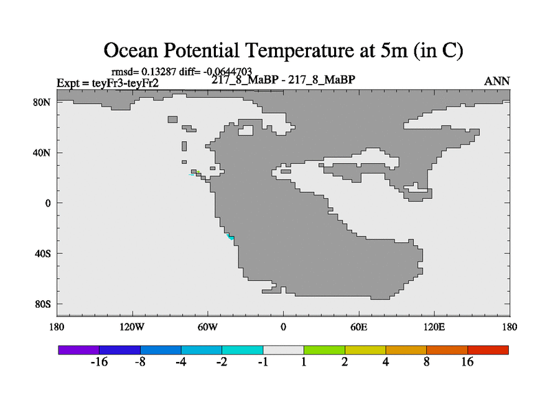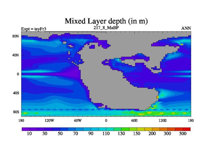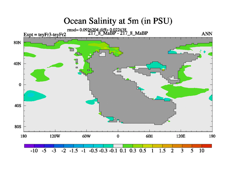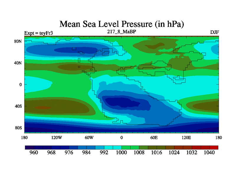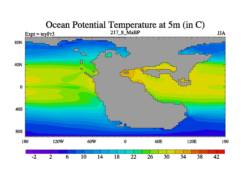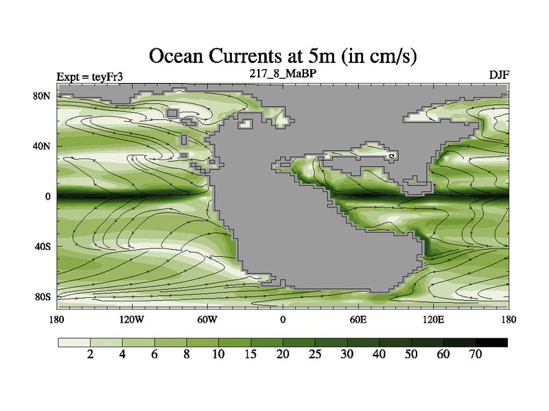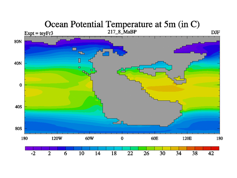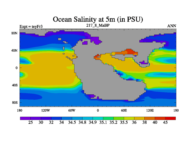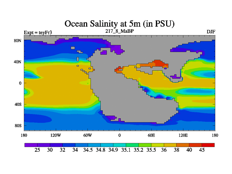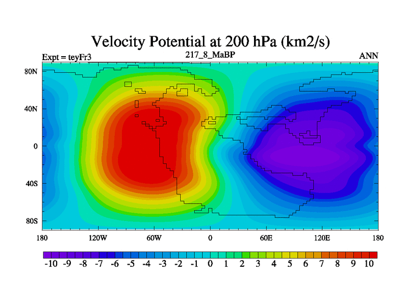 This is the 217.8 Ma simulation using the Scotese palaeogeographies and revised CCN etc. Updated HadCM3L ocean parameters and soil parameters. Also made sure orography gravity wave drag was consistent.