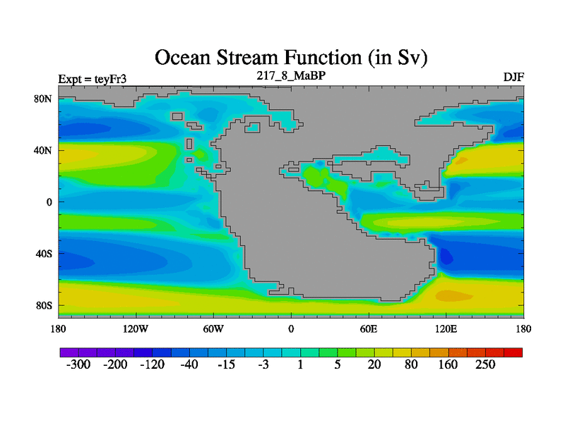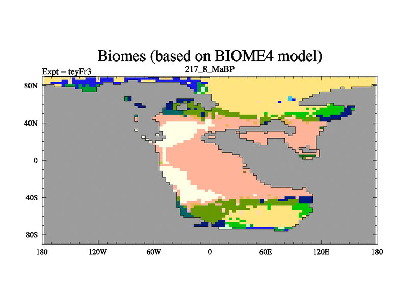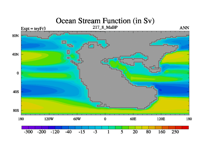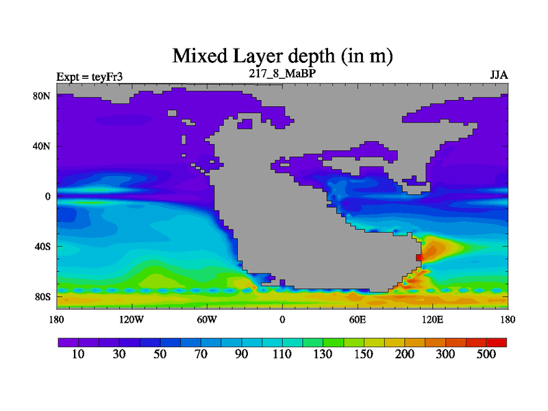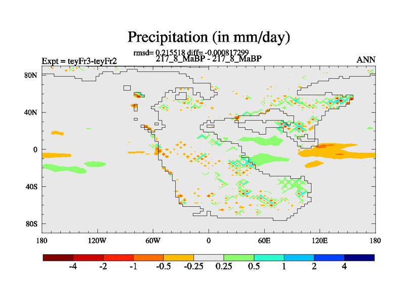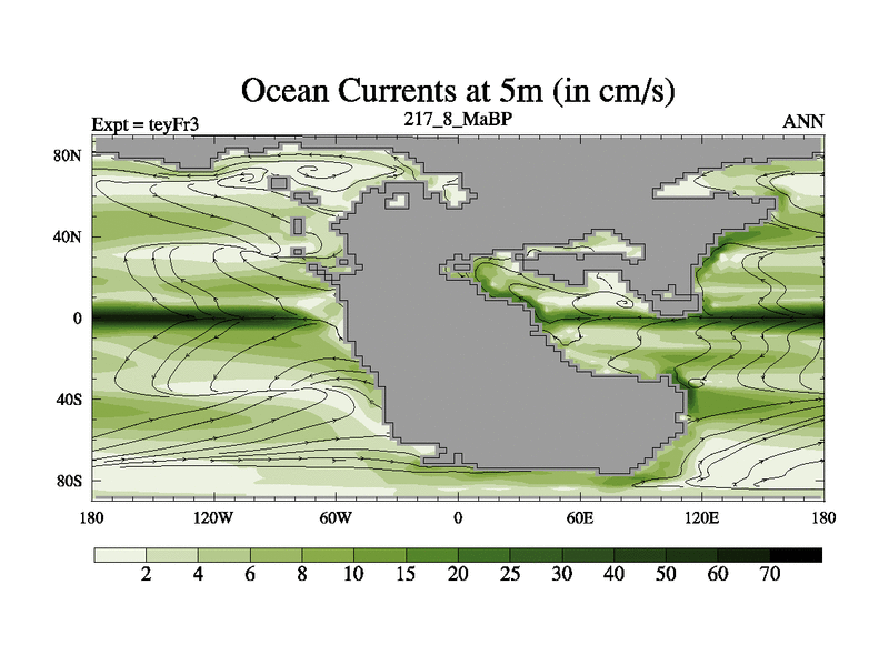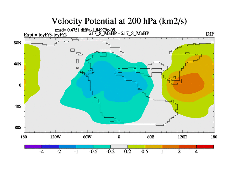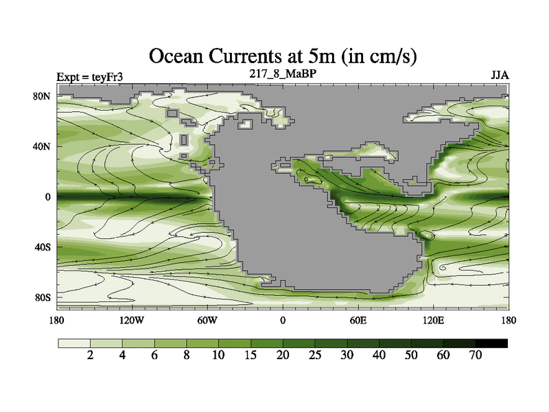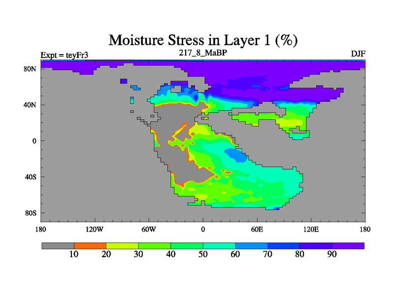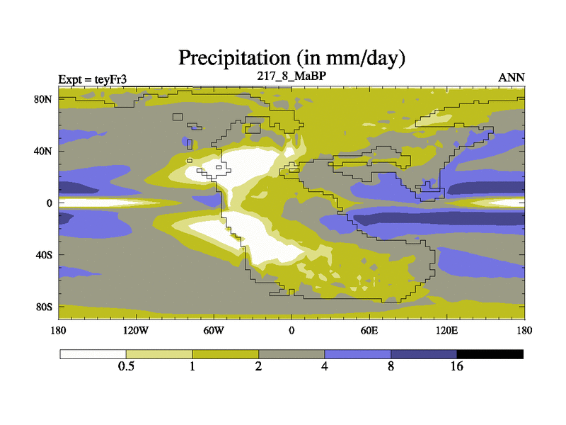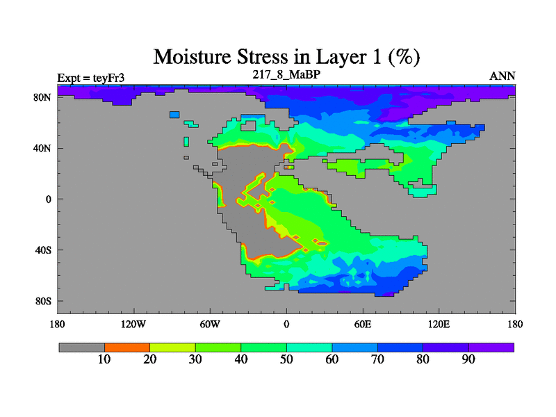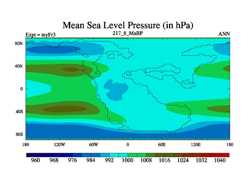 This is the 217.8 Ma simulation using the Scotese palaeogeographies and revised CCN etc. Updated HadCM3L ocean parameters and soil parameters. Also made sure orography gravity wave drag was consistent.