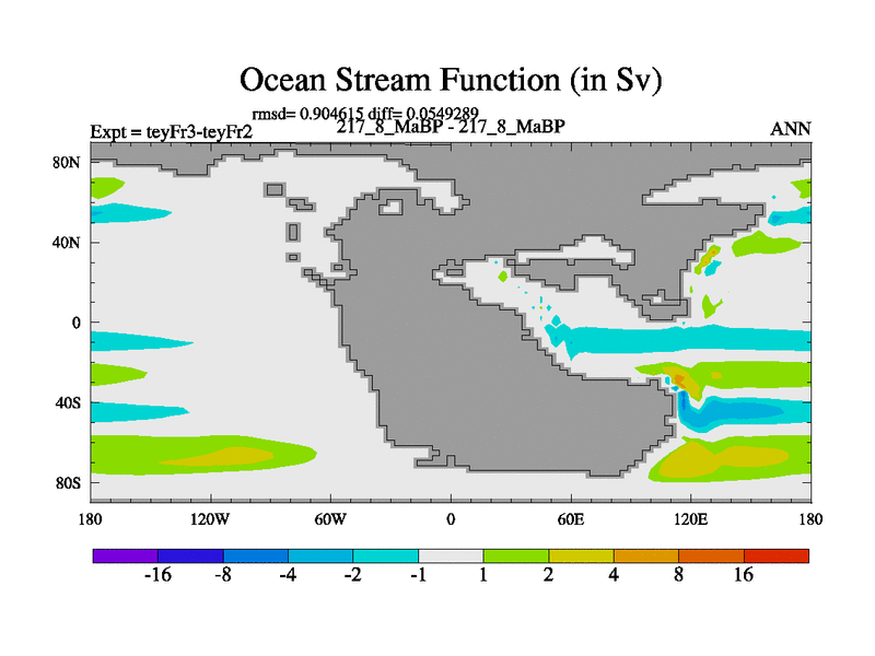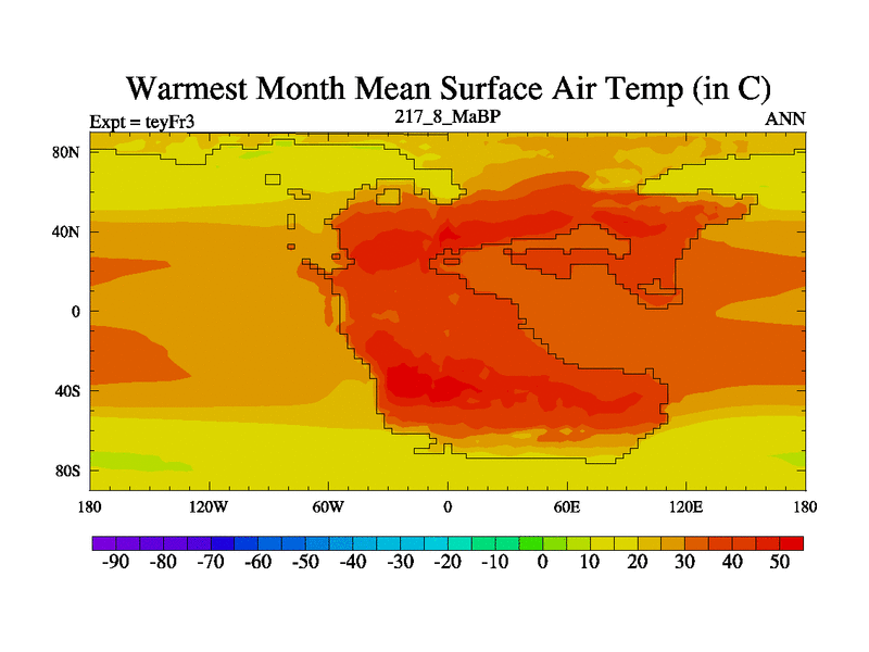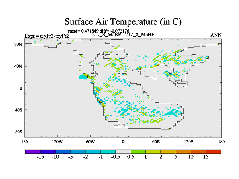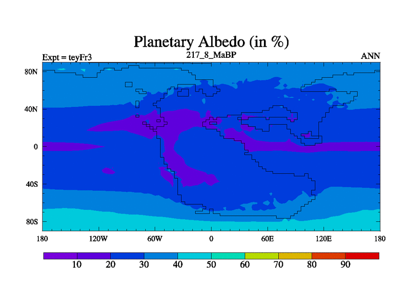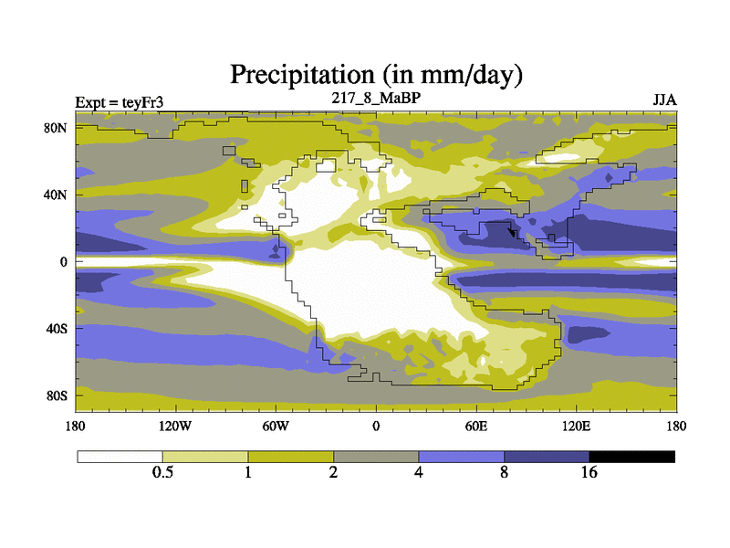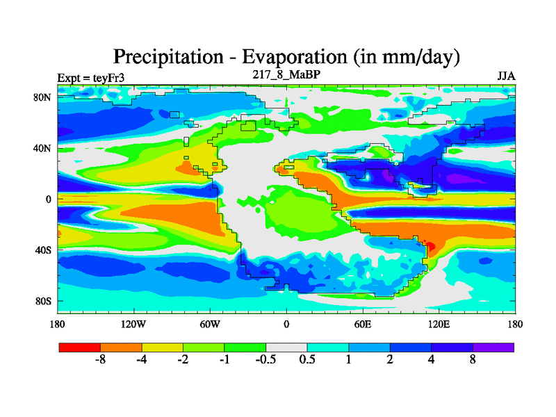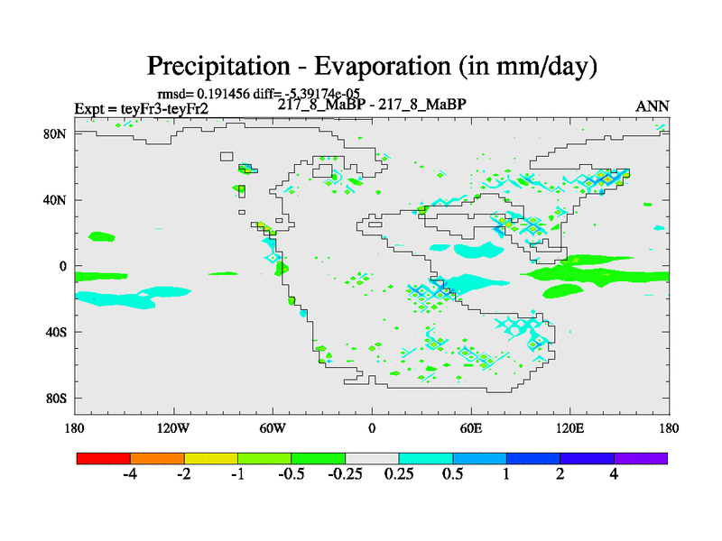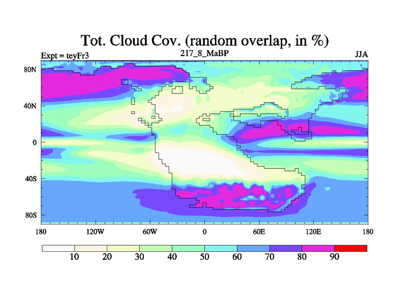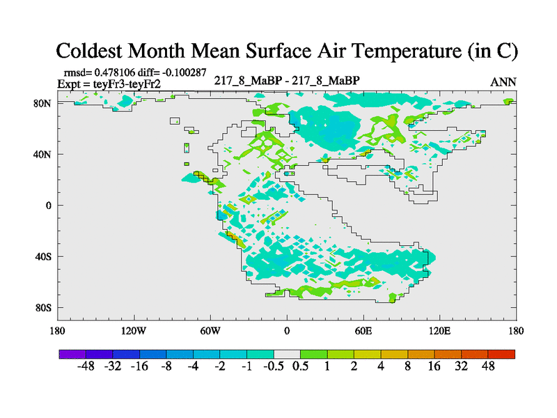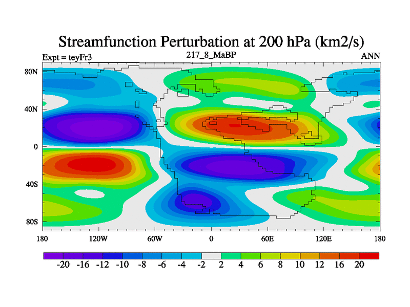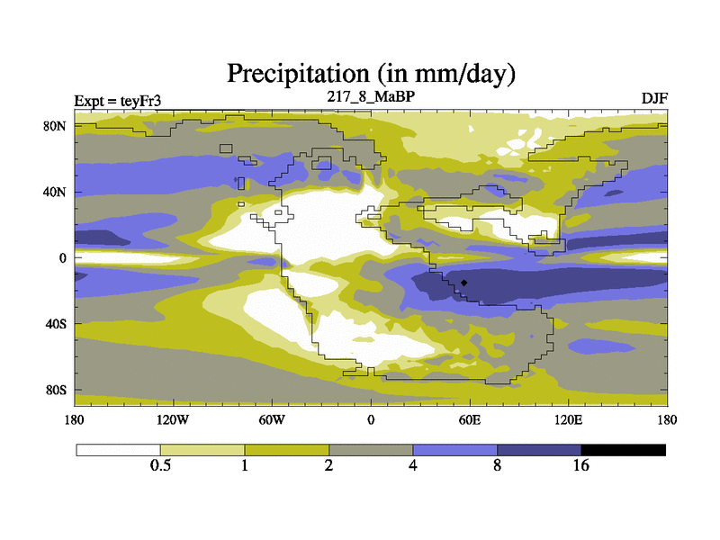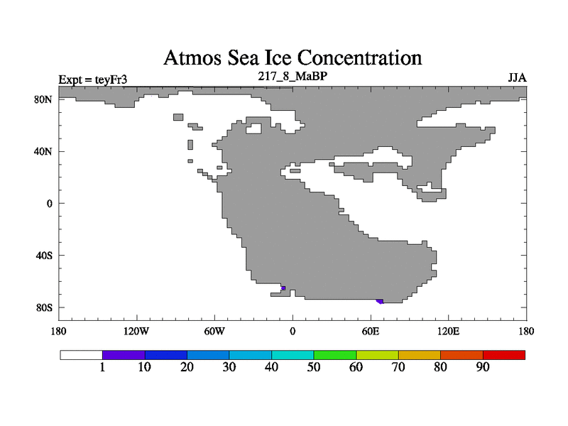 This is the 217.8 Ma simulation using the Scotese palaeogeographies and revised CCN etc. Updated HadCM3L ocean parameters and soil parameters. Also made sure orography gravity wave drag was consistent.