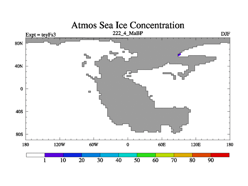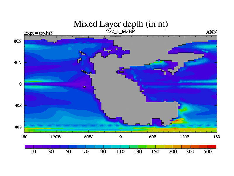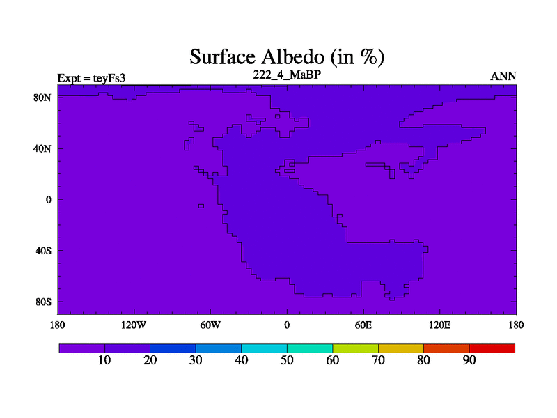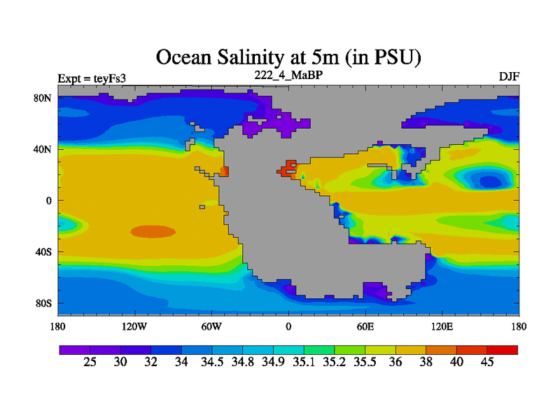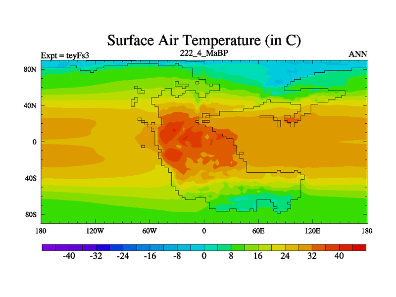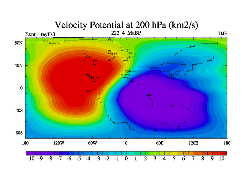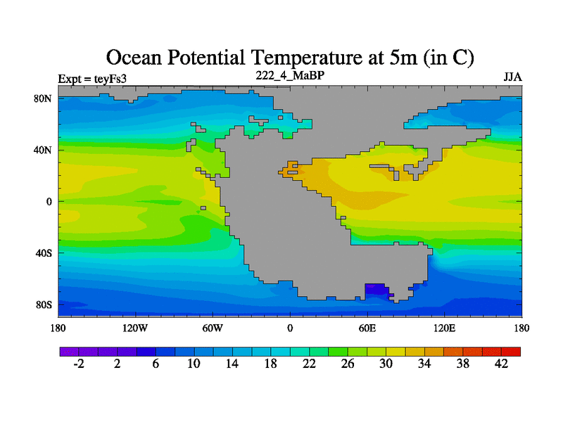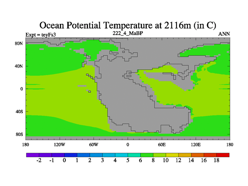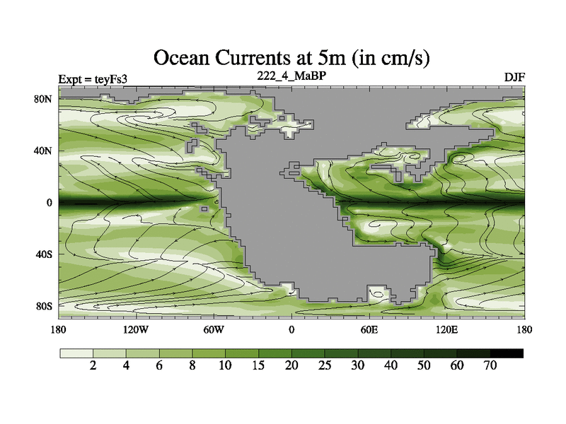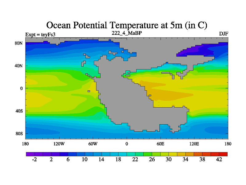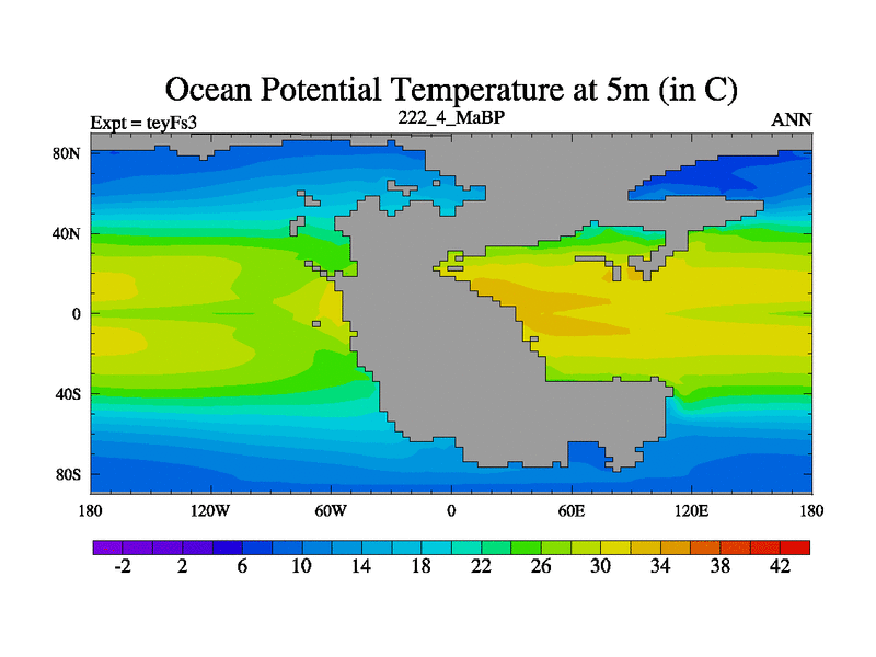 This is the 222.4 Ma simulation using the Scotese palaeogeographies and revised CCN etc. Updated HadCM3L ocean parameters and soil parameters. Also made sure orography gravity wave drag was consistent.