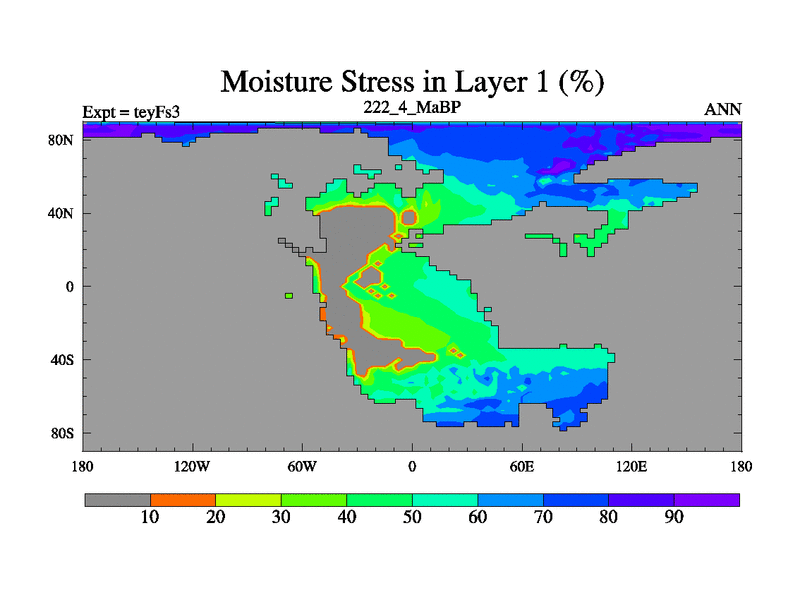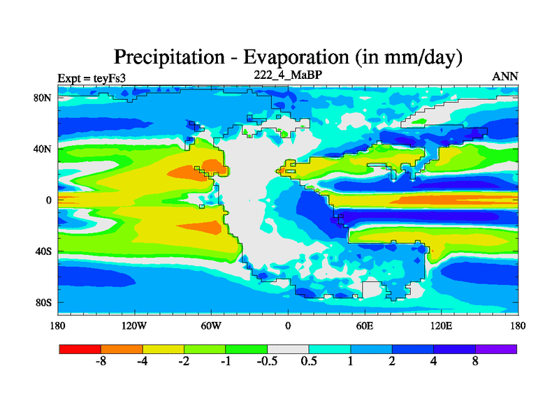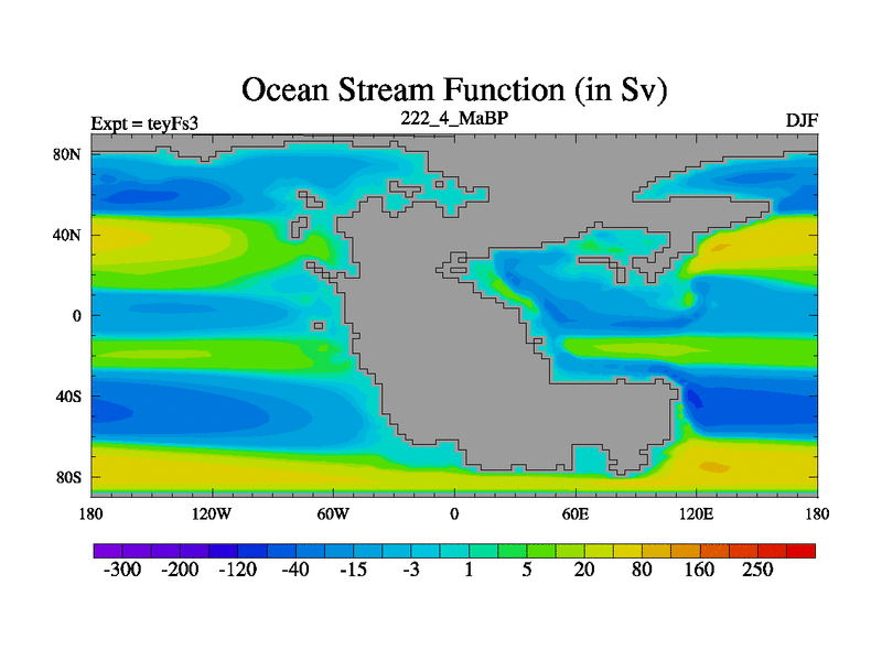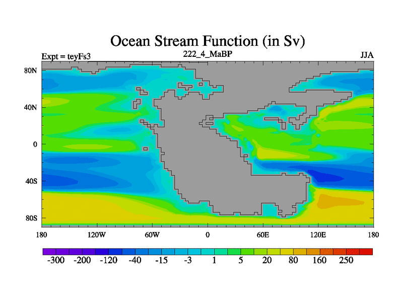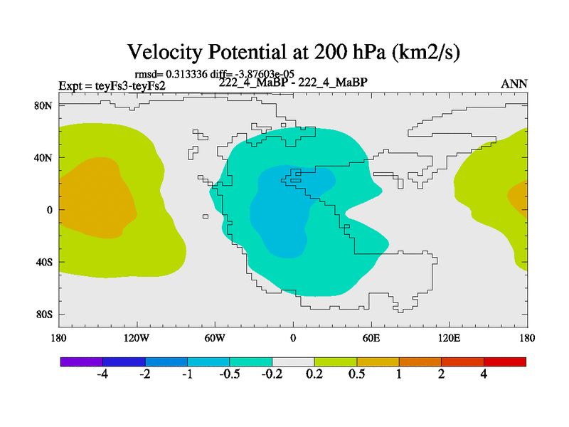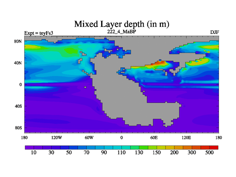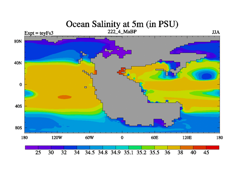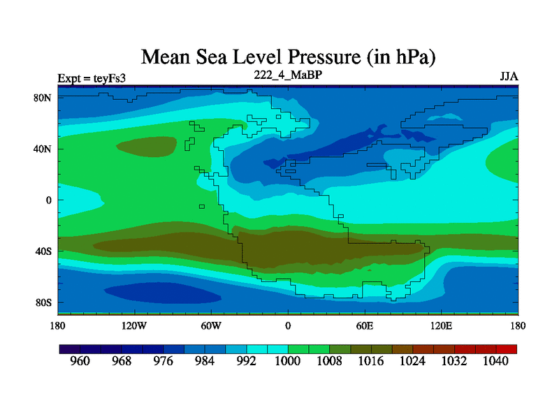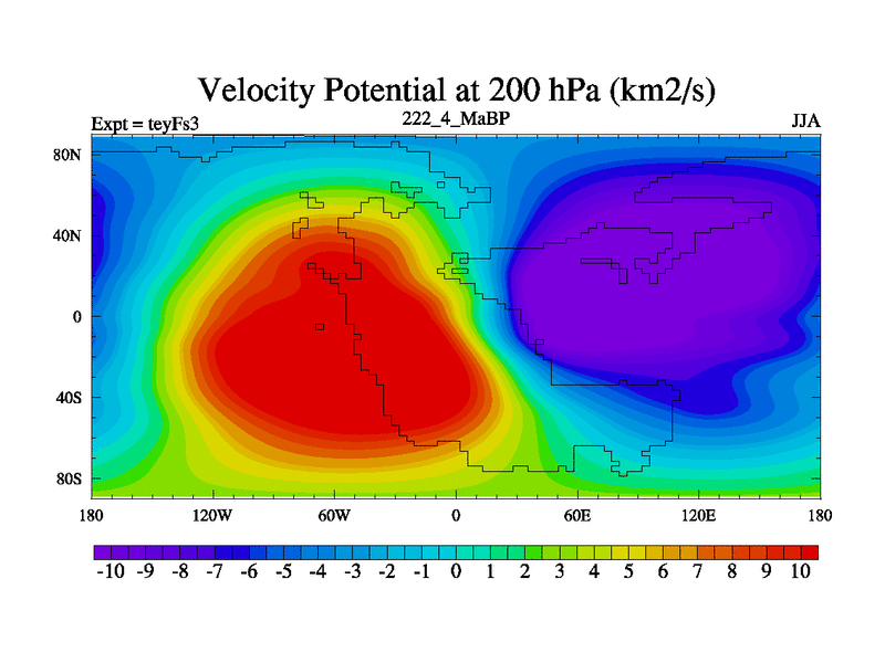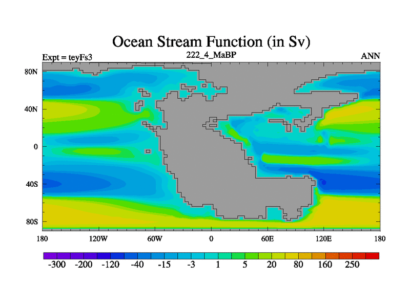 This is the 222.4 Ma simulation using the Scotese palaeogeographies and revised CCN etc. Updated HadCM3L ocean parameters and soil parameters. Also made sure orography gravity wave drag was consistent.
