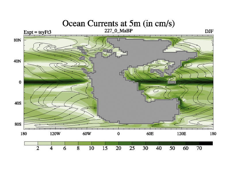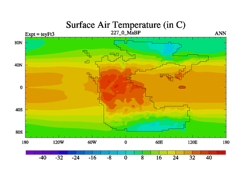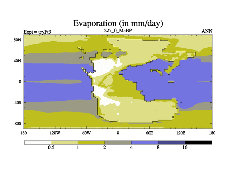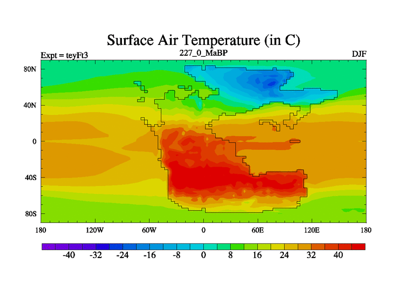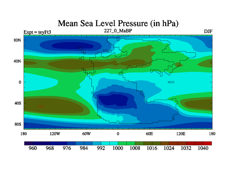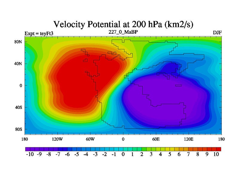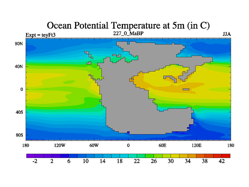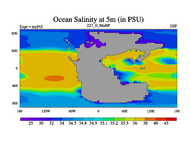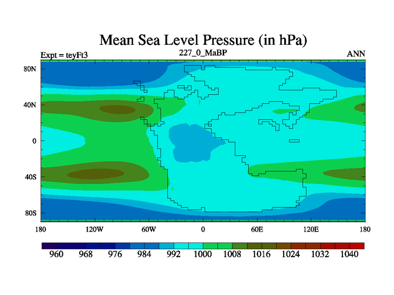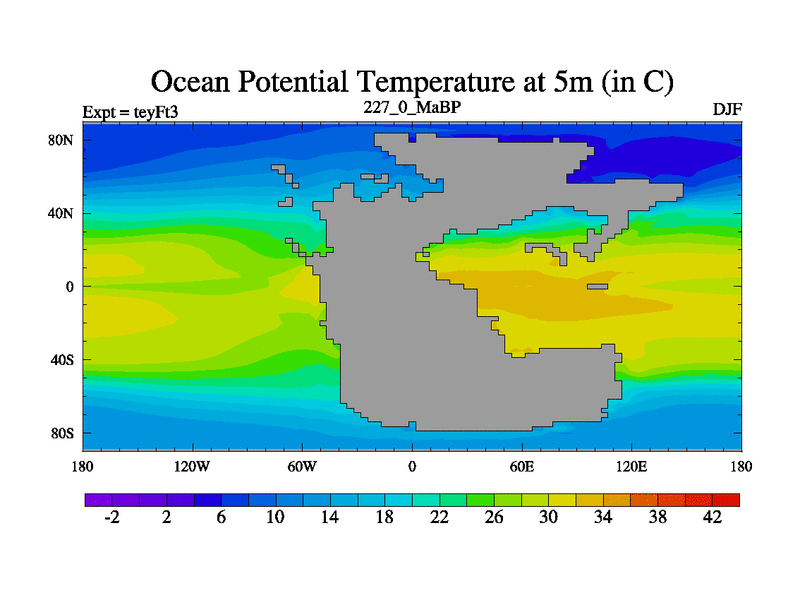 This is the 227.0 Ma simulation using the Scotese palaeogeographies and revised CCN etc. Updated HadCM3L ocean parameters and soil parameters. Also made sure orography gravity wave drag was consistent.