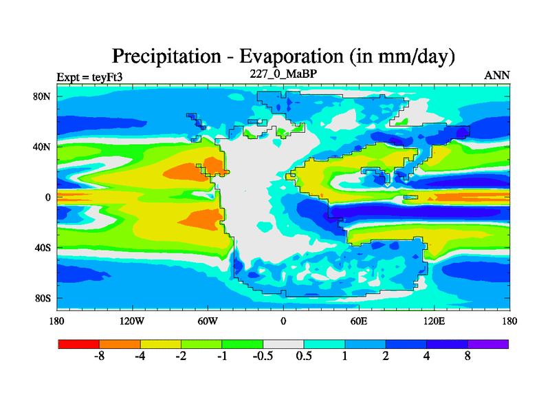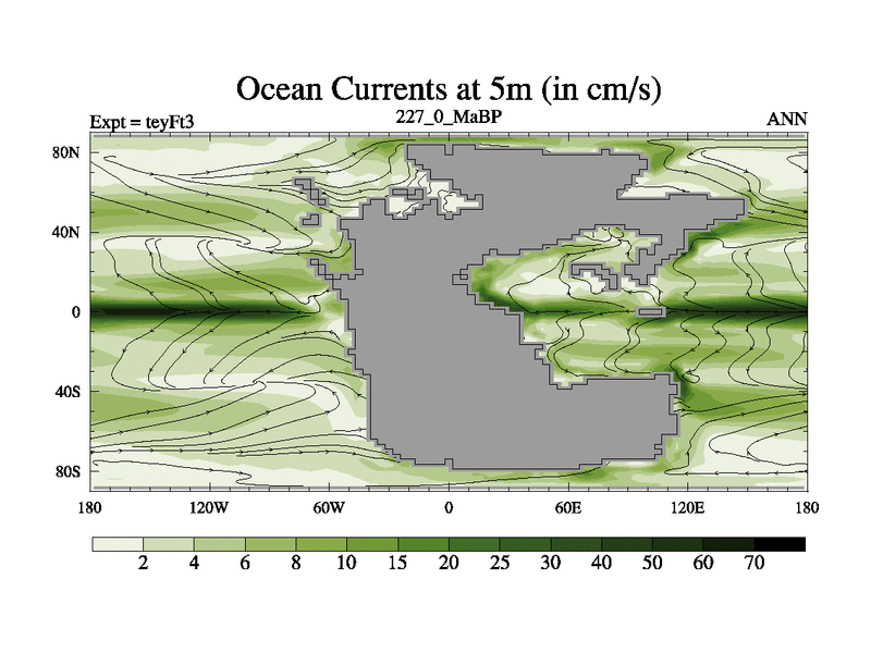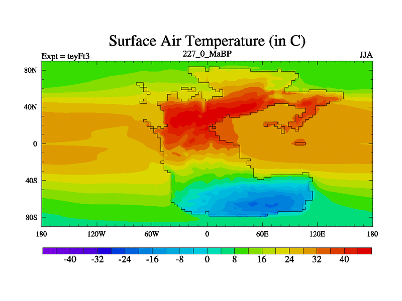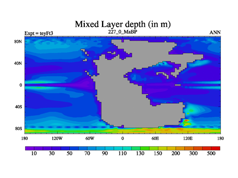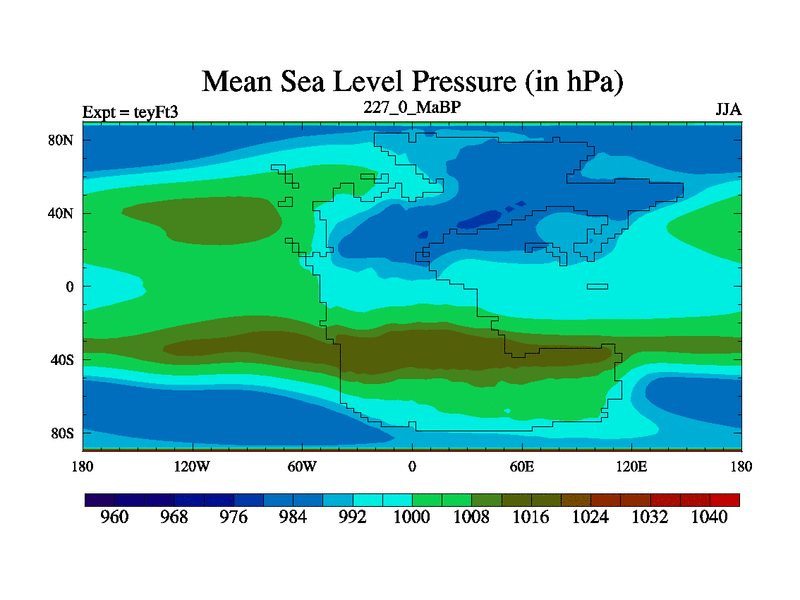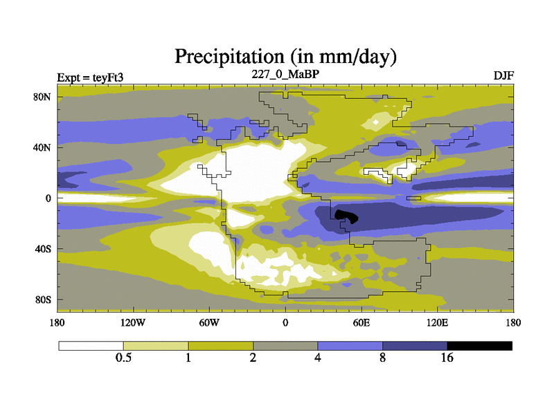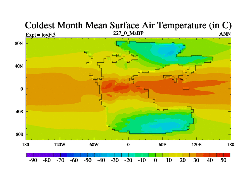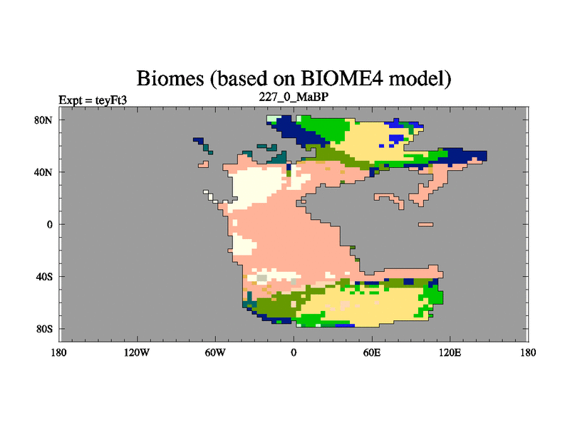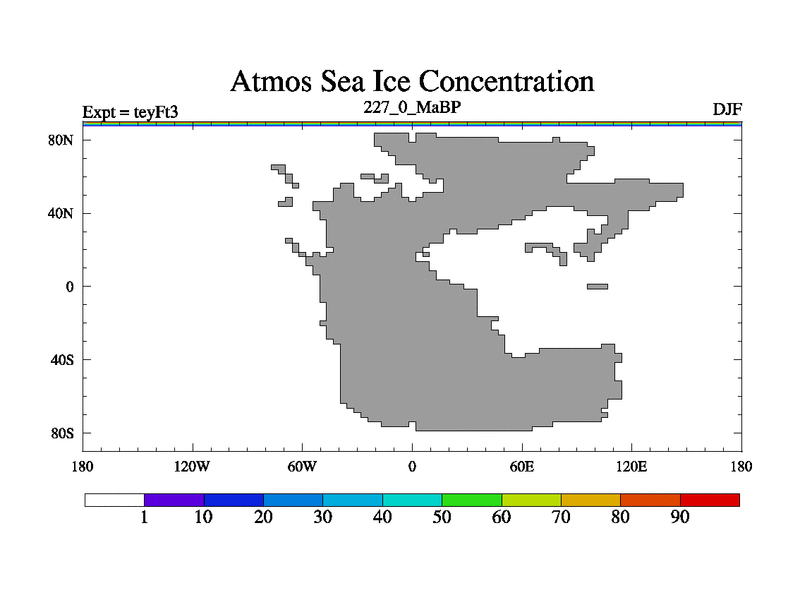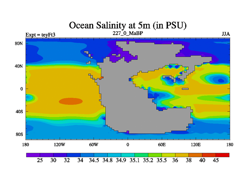 This is the 227.0 Ma simulation using the Scotese palaeogeographies and revised CCN etc. Updated HadCM3L ocean parameters and soil parameters. Also made sure orography gravity wave drag was consistent.
