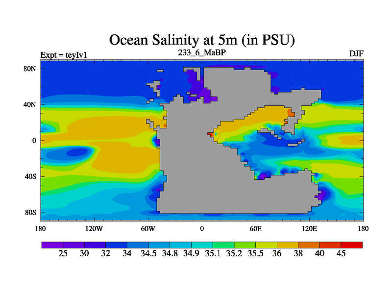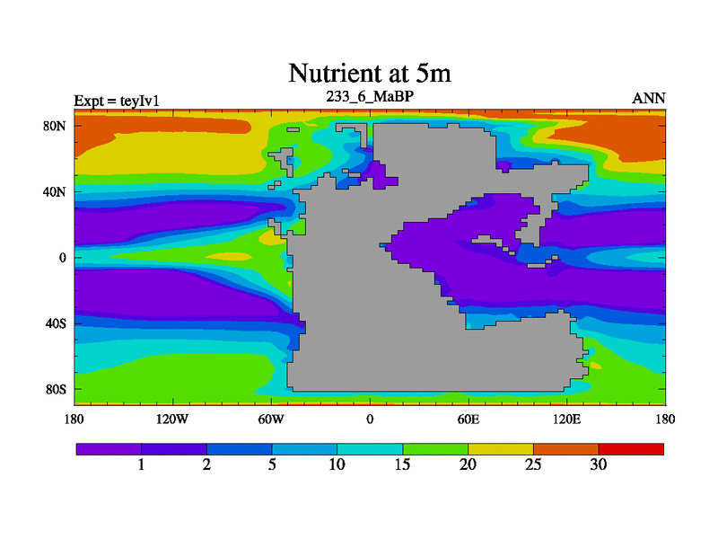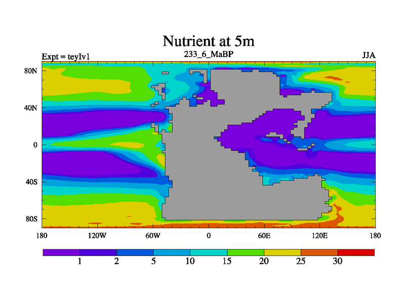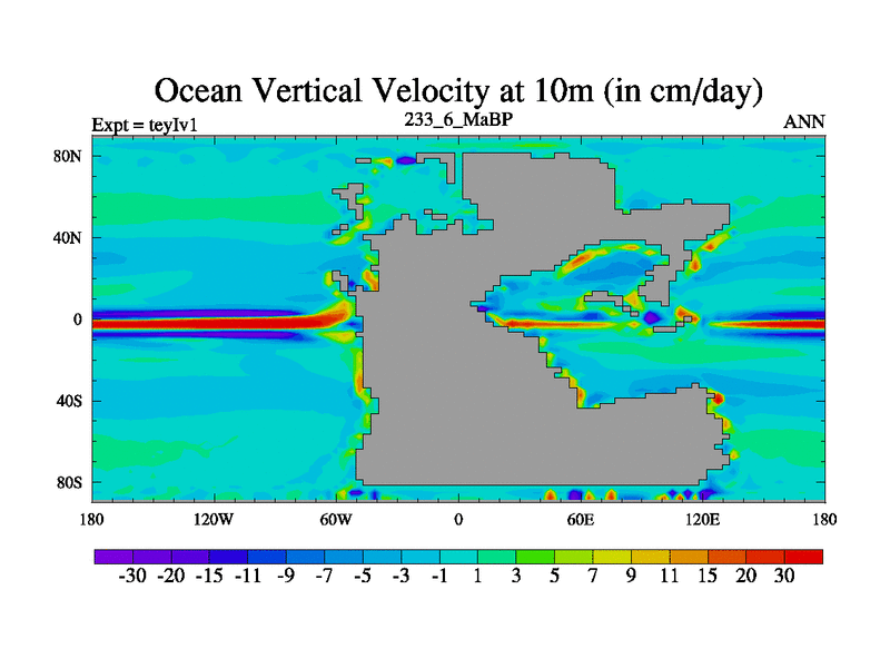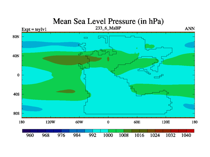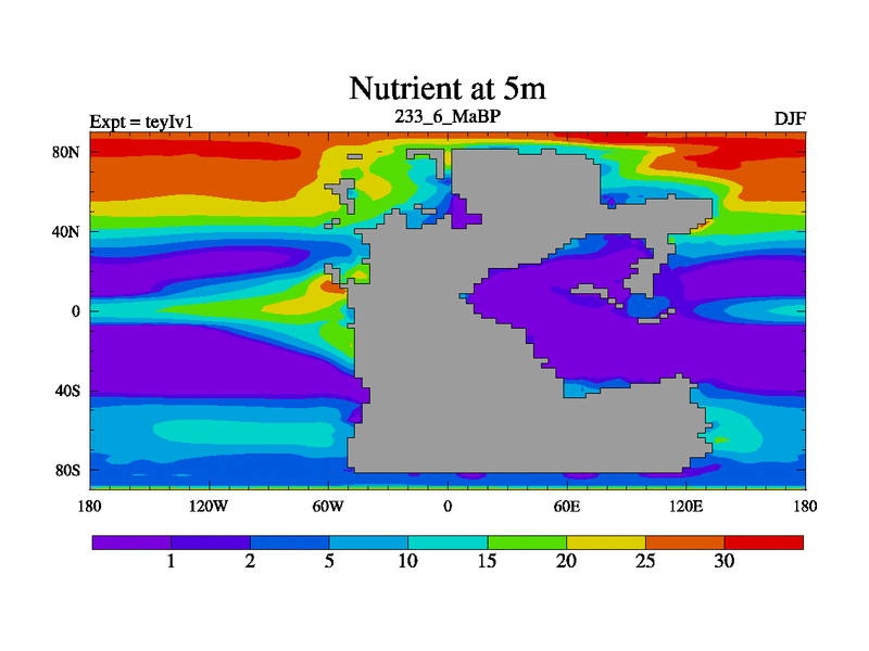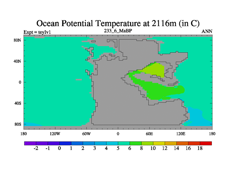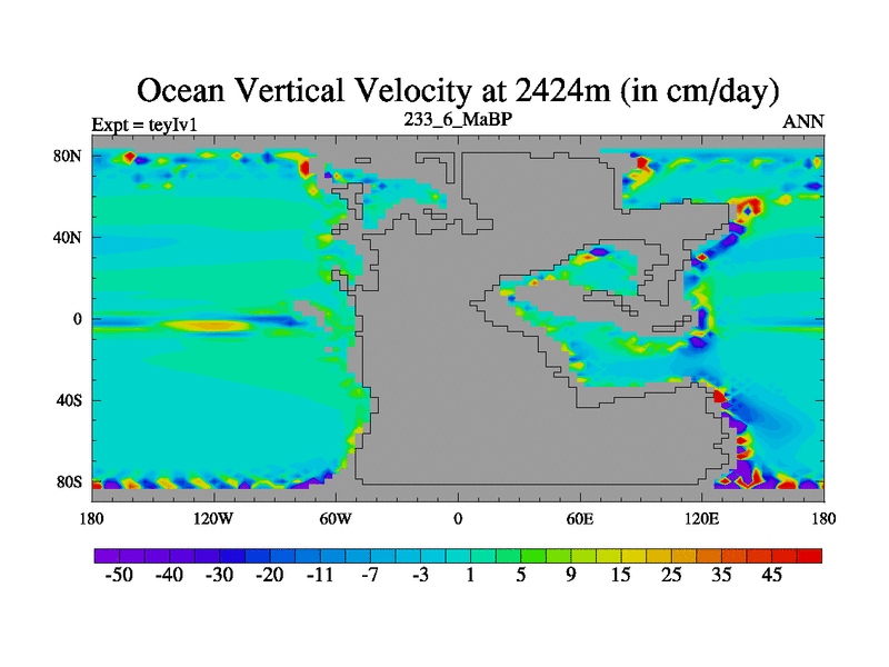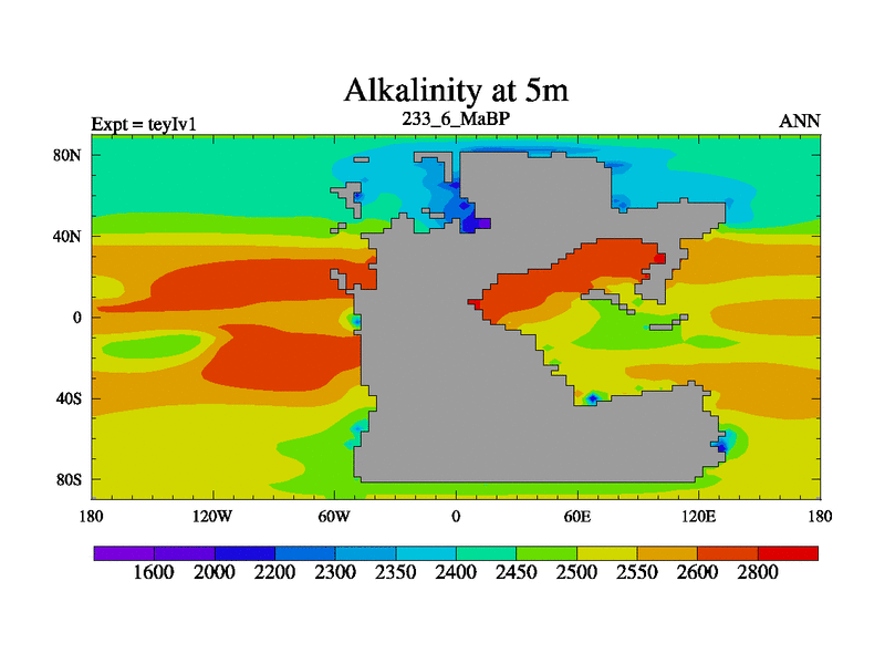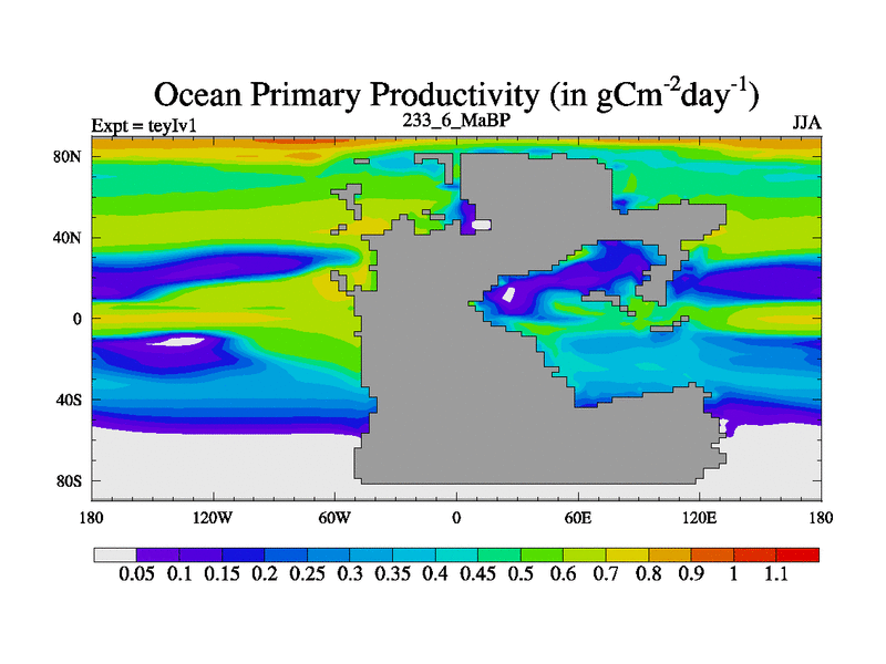 This is the 233.6 Ma simulation using the Scotese palaeogeographies and revised CCN etc. Now includes ocean biogeochemistry