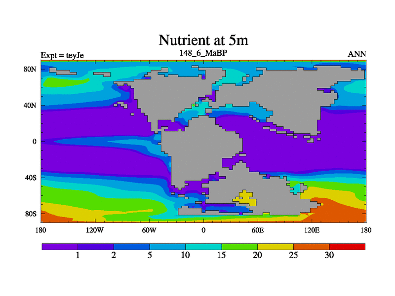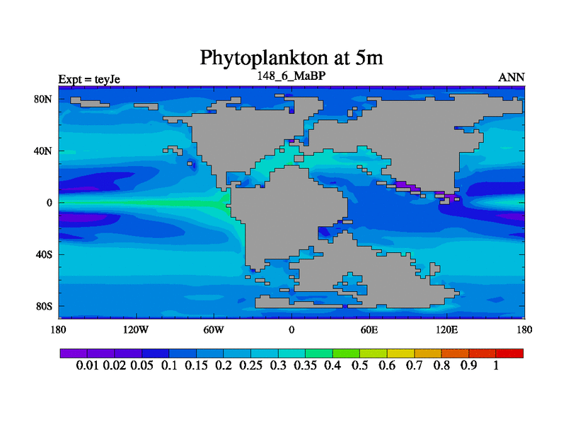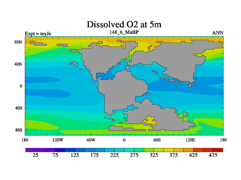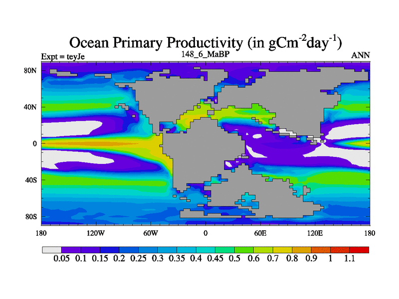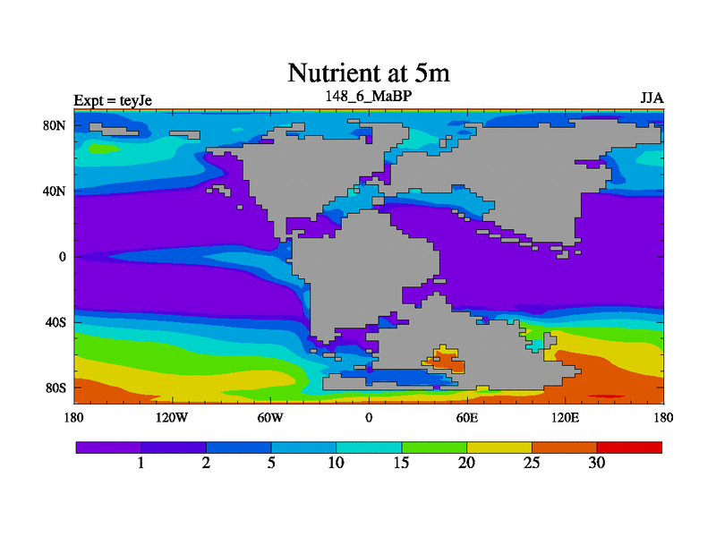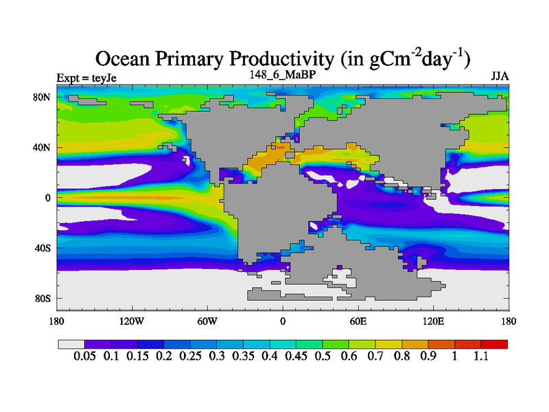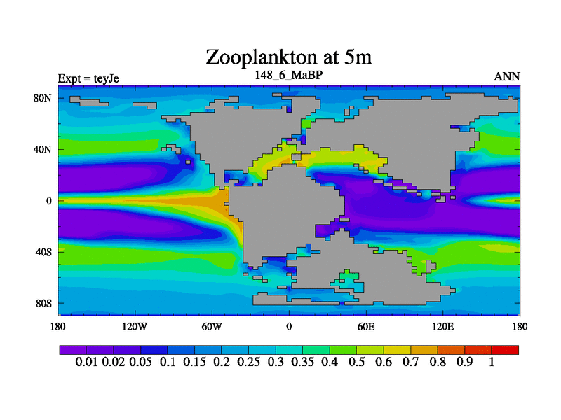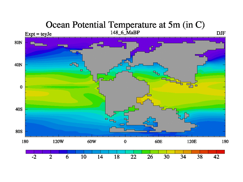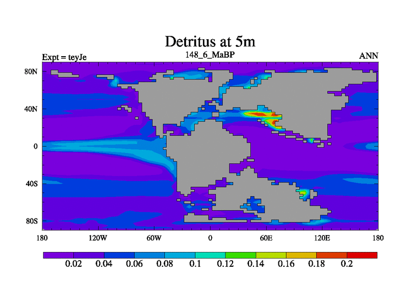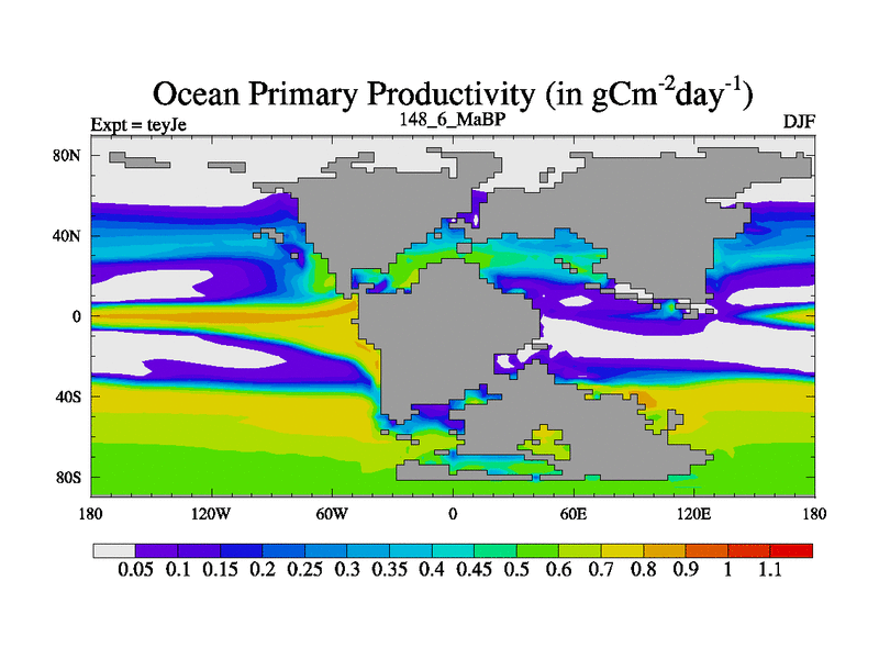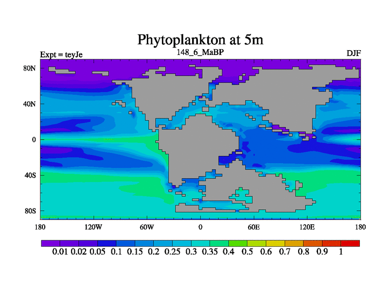 This is the 148.6 Ma simulation using the Scotese palaeogeographies and revised CCN etc. As teyfa3 but corrected orography problem over Antartartica. Now includes ocean biogeochemistry