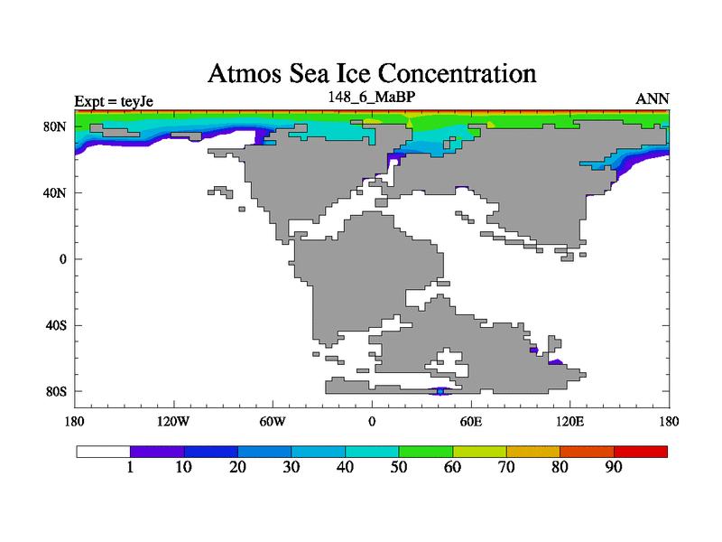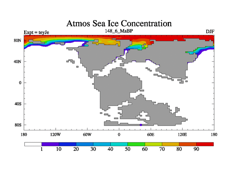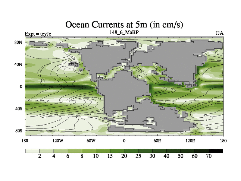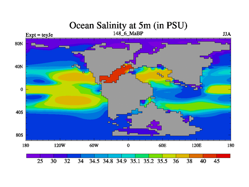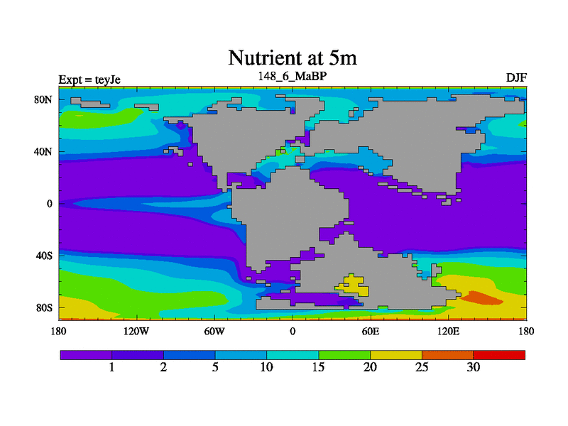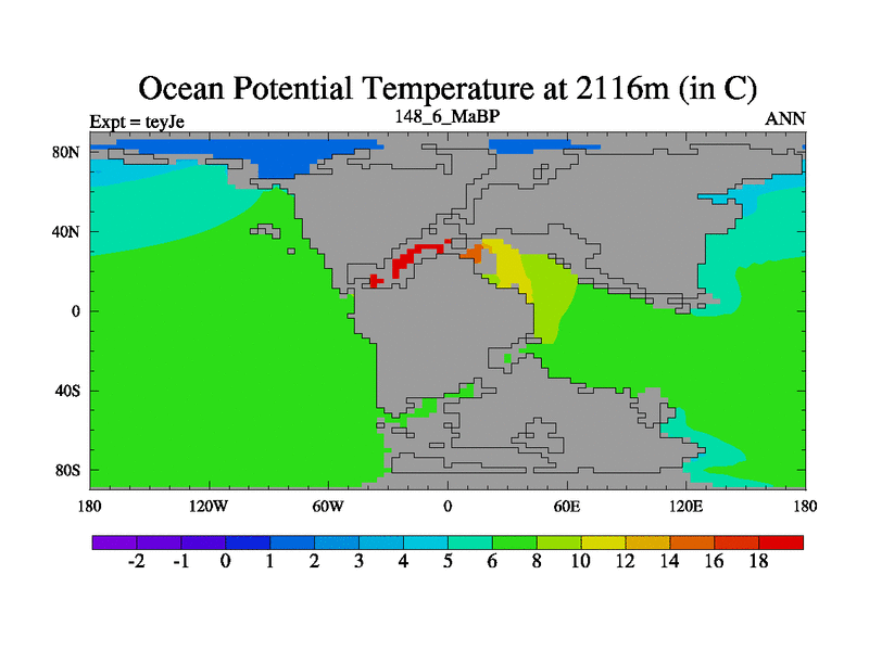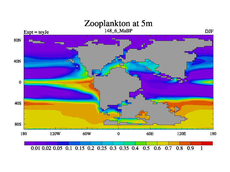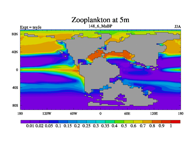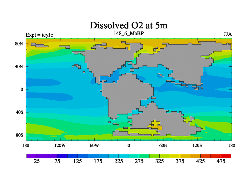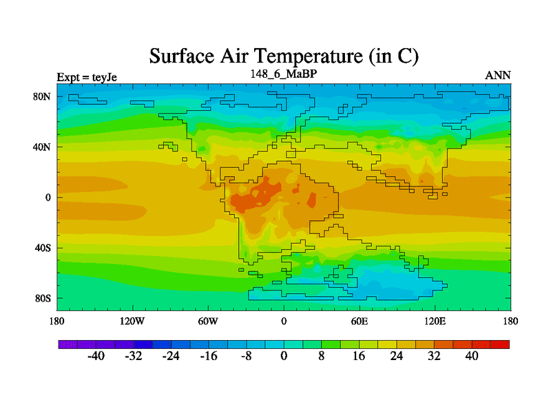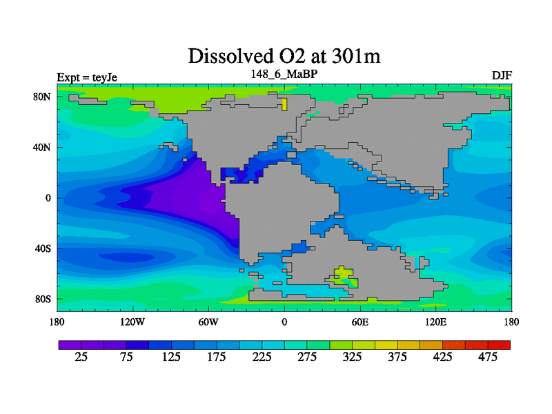 This is the 148.6 Ma simulation using the Scotese palaeogeographies and revised CCN etc. As teyfa3 but corrected orography problem over Antartartica. Now includes ocean biogeochemistry