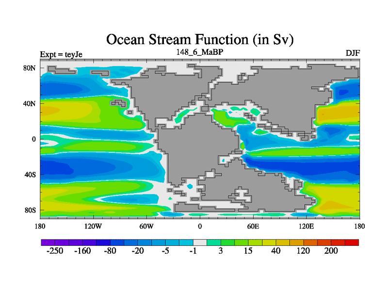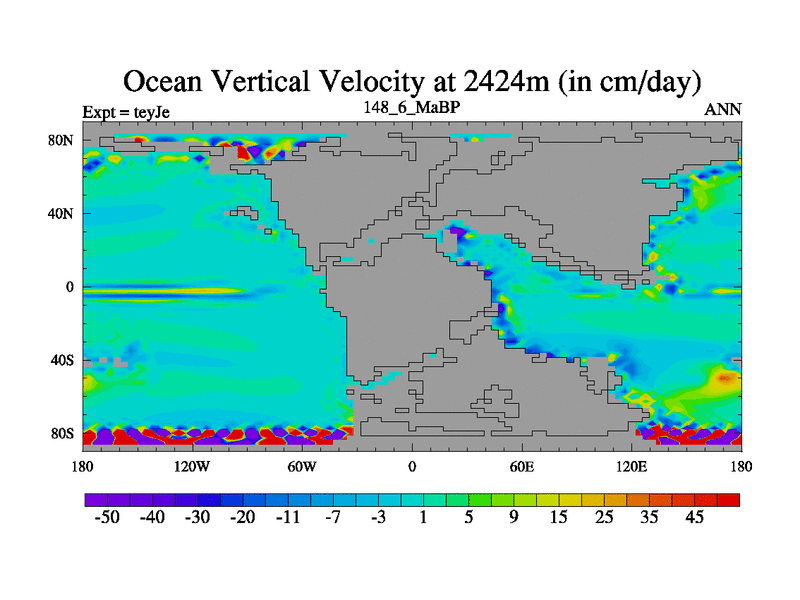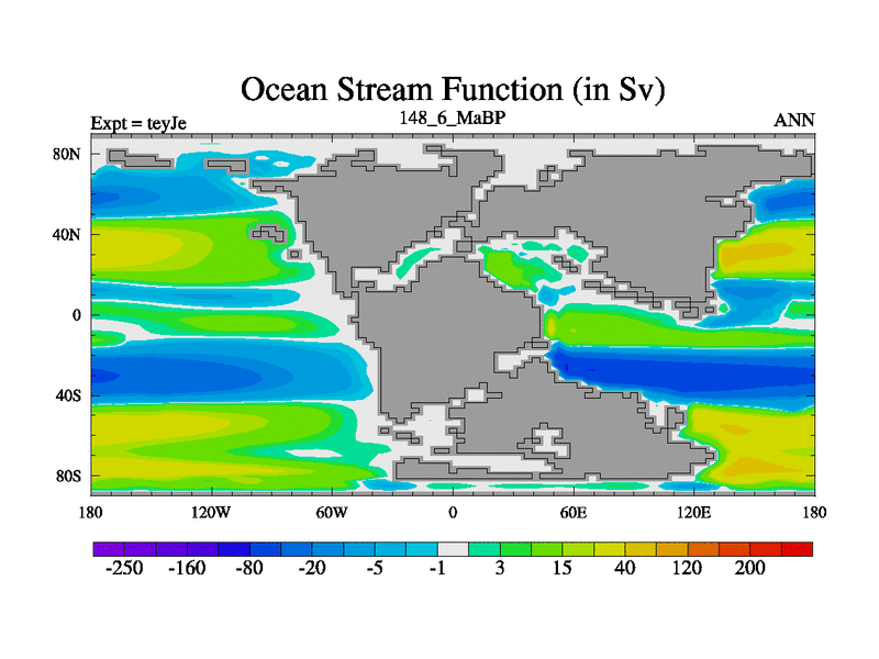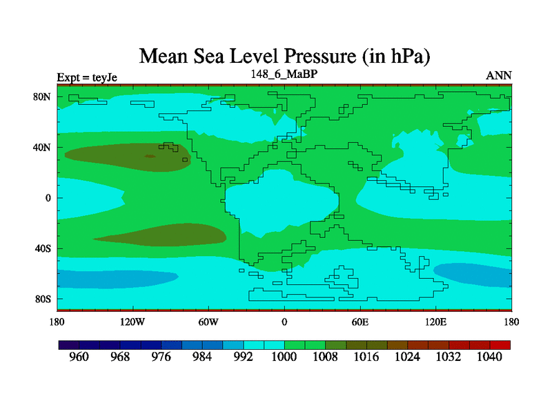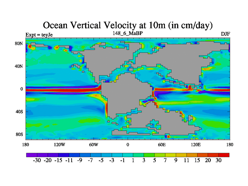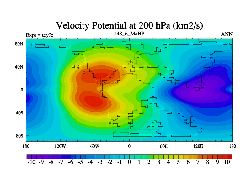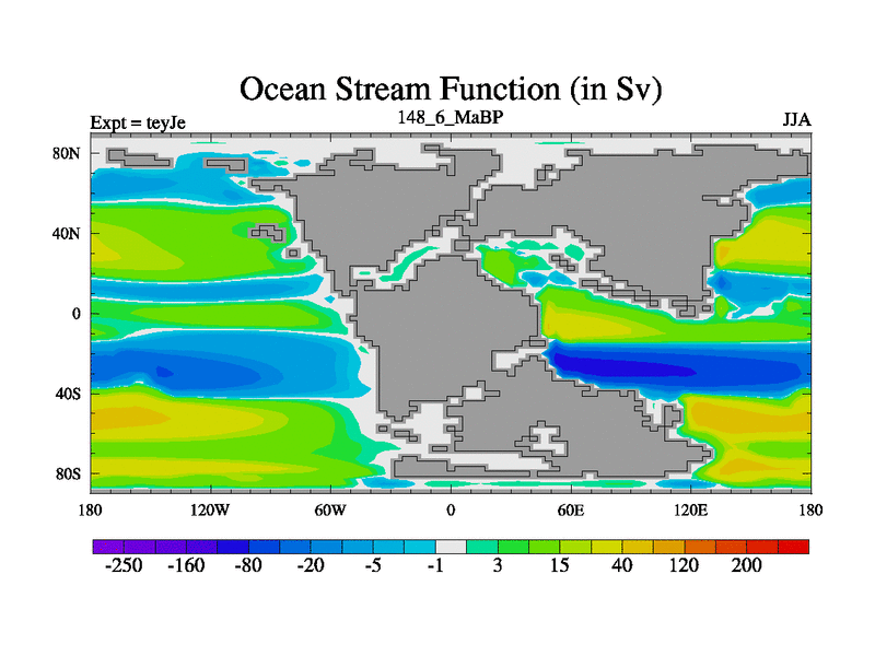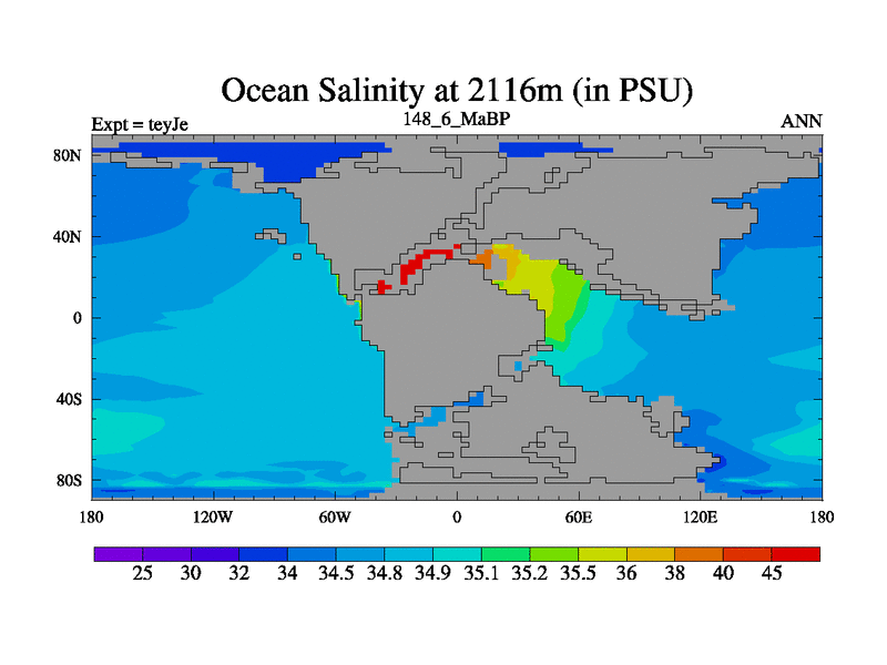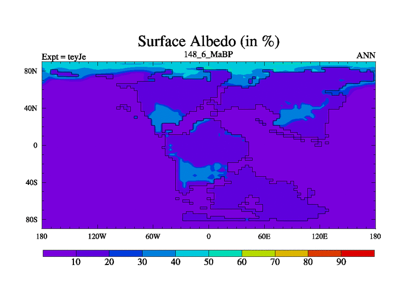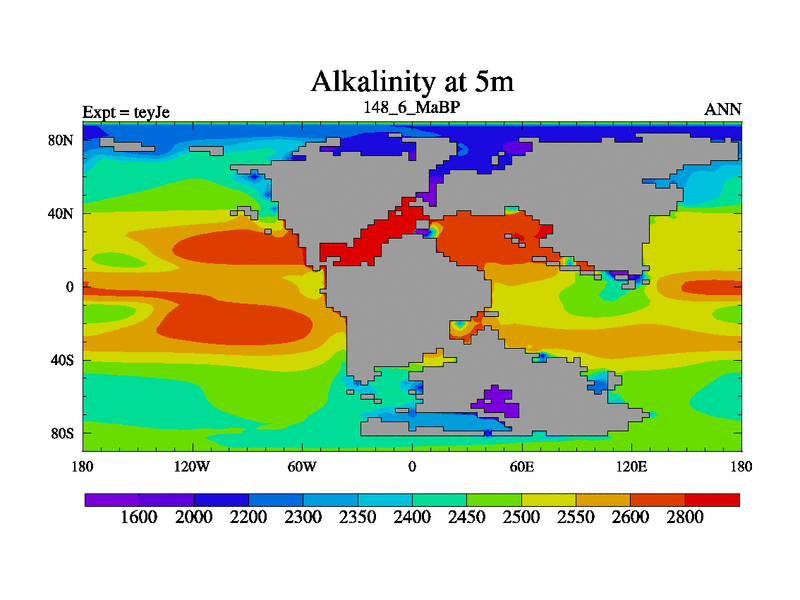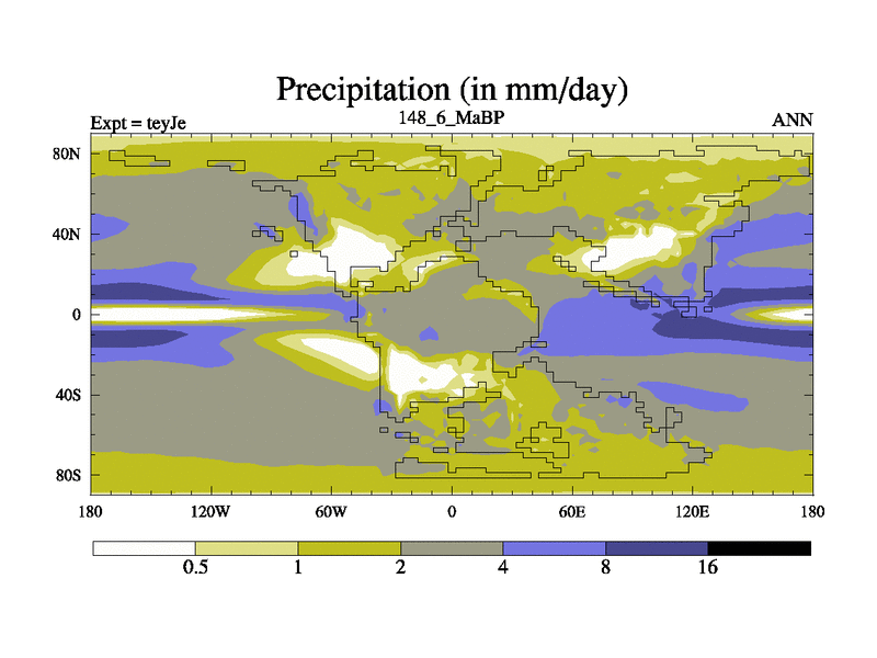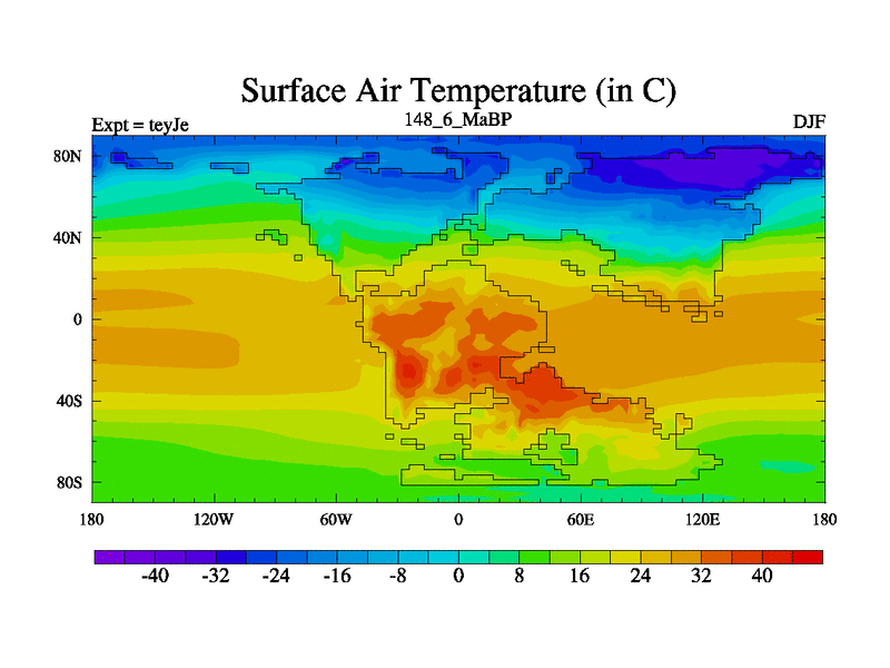 This is the 148.6 Ma simulation using the Scotese palaeogeographies and revised CCN etc. As teyfa3 but corrected orography problem over Antartartica. Now includes ocean biogeochemistry