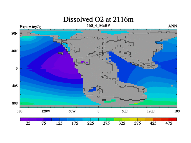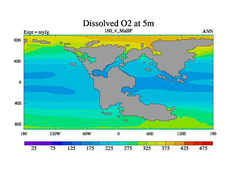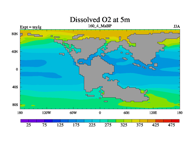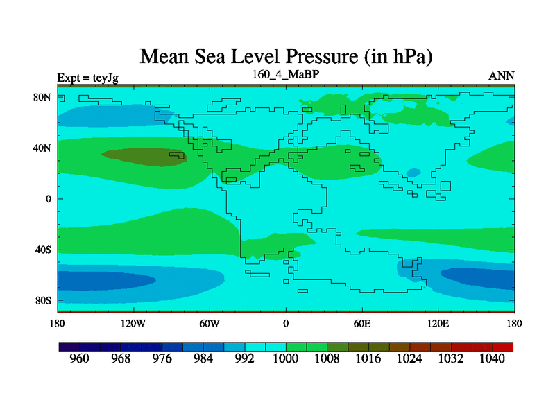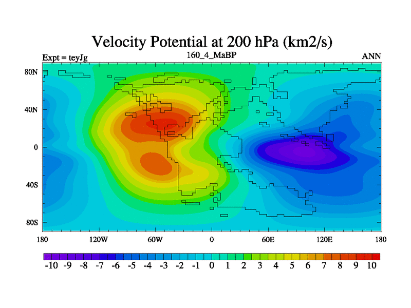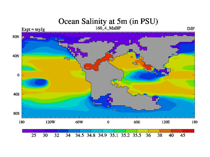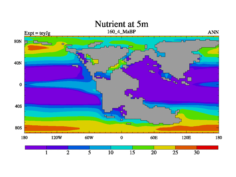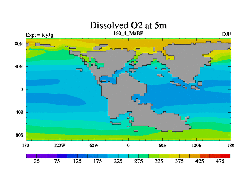 This is the 160.4 Ma simulation using the Scotese palaeogeographies and revised CCN etc. As teyfa3 but corrected orography problem over Antartartica. Now includes ocean biogeochemistry