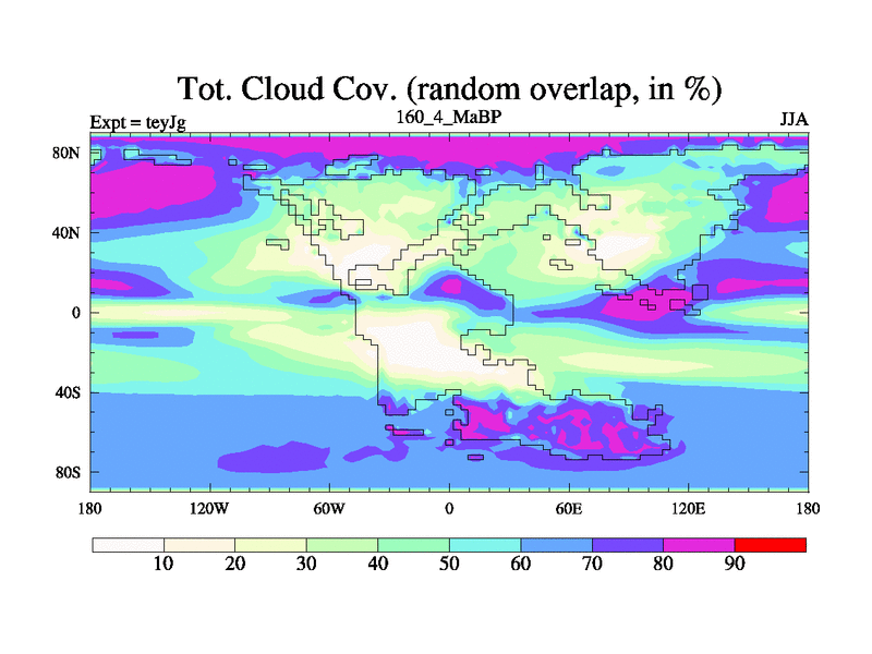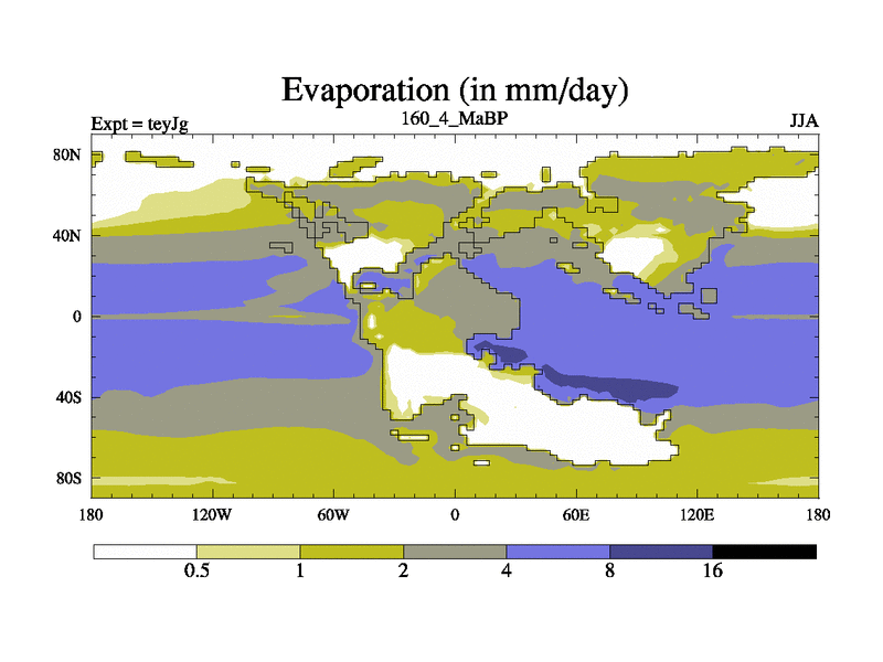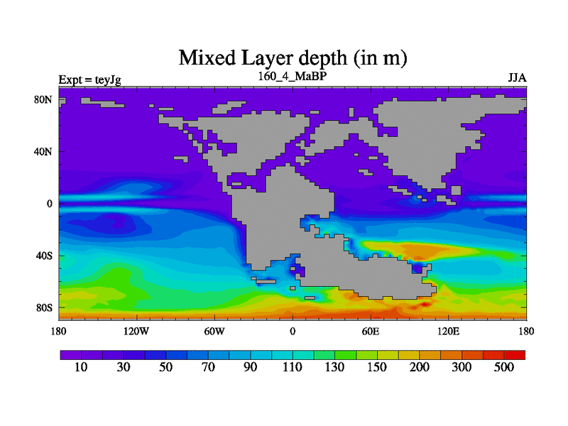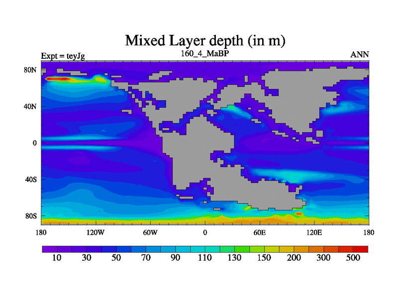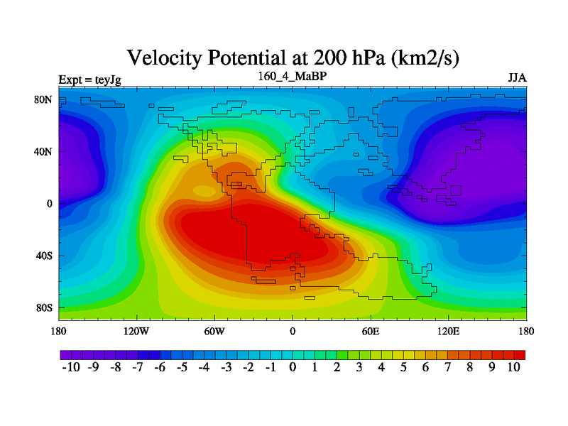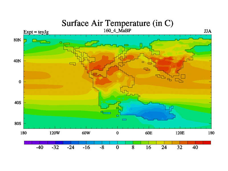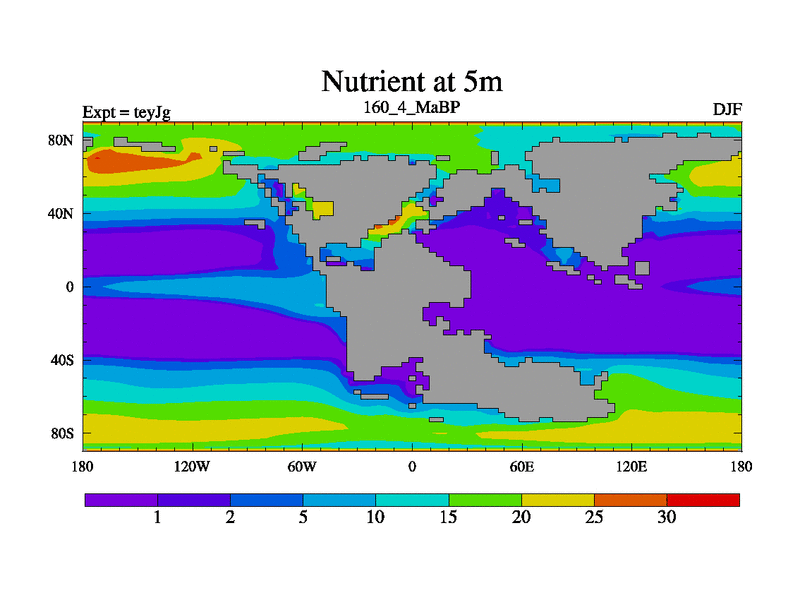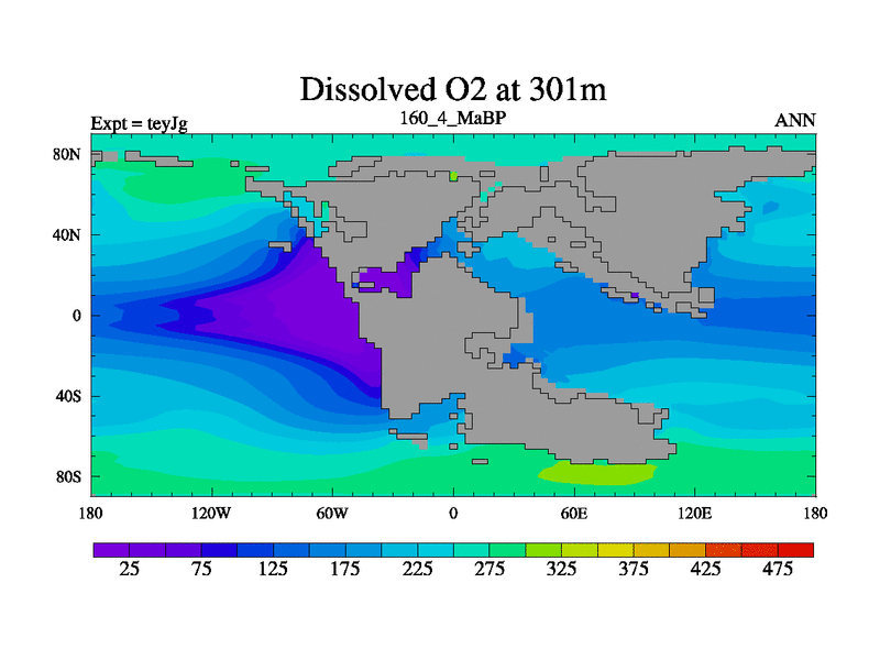 This is the 160.4 Ma simulation using the Scotese palaeogeographies and revised CCN etc. As teyfa3 but corrected orography problem over Antartartica. Now includes ocean biogeochemistry