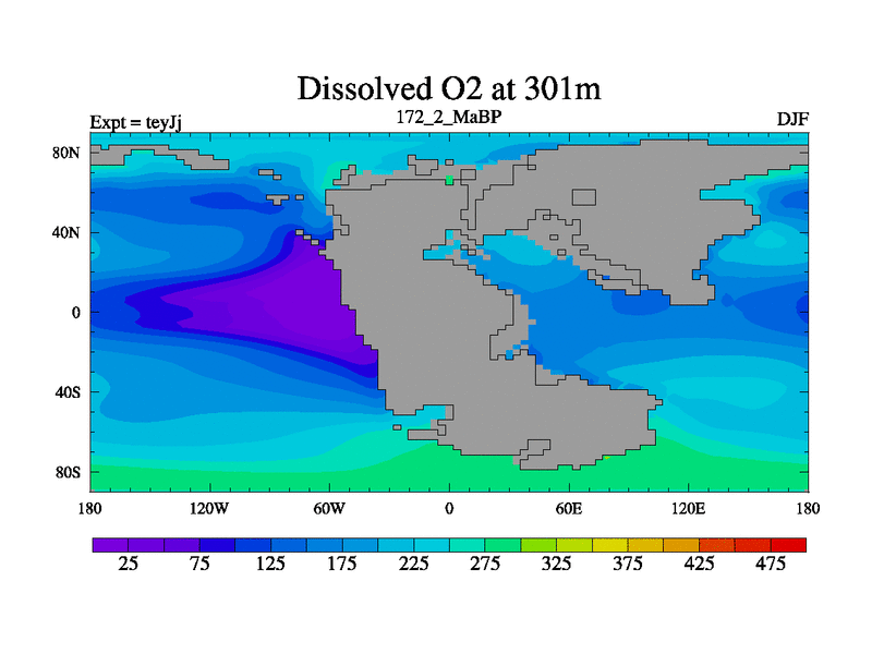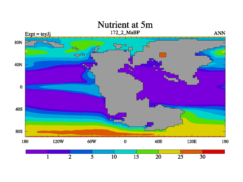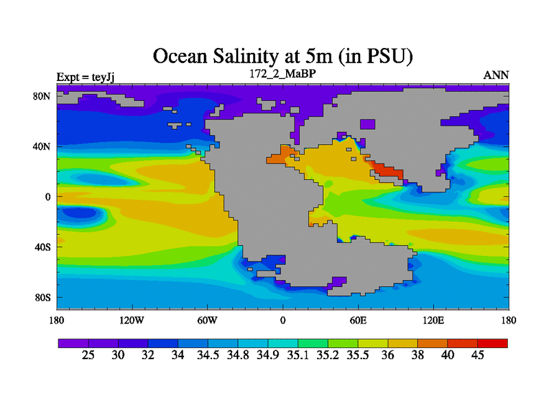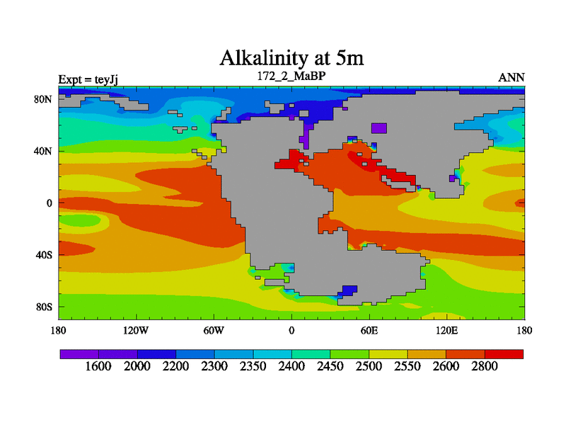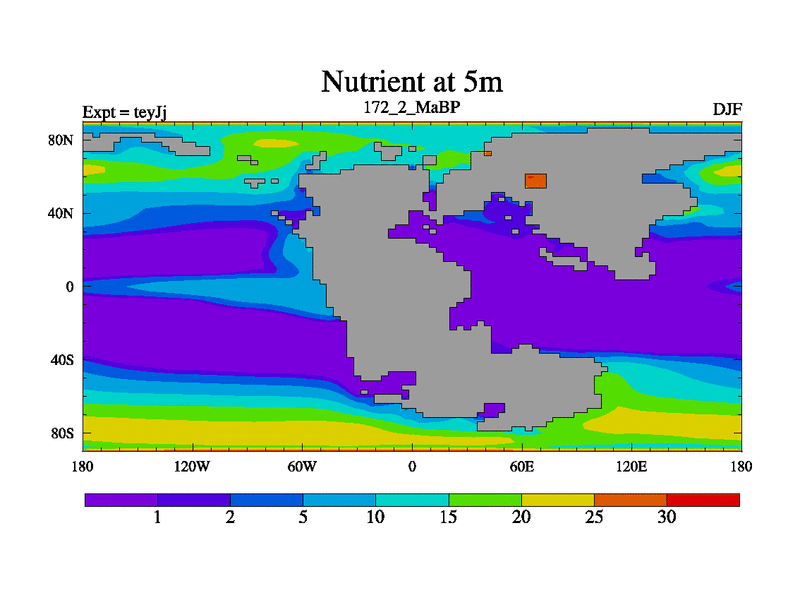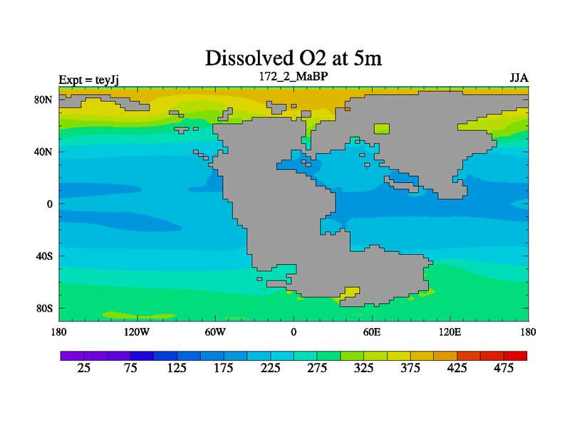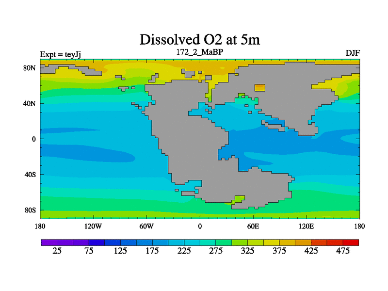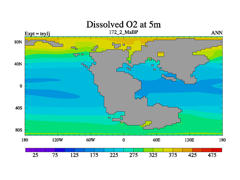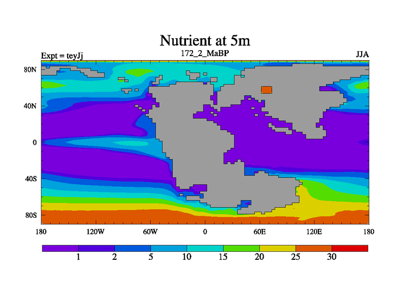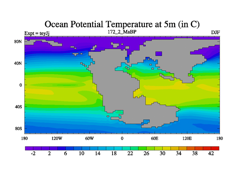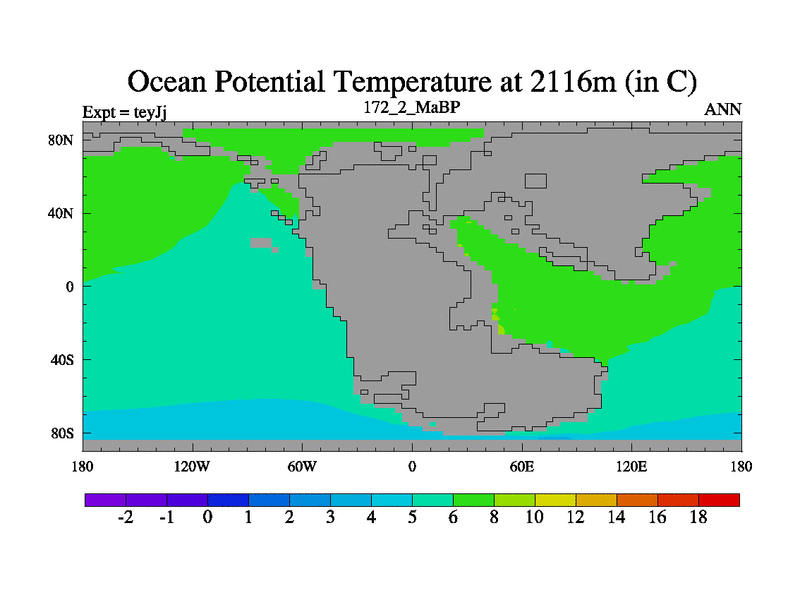 This is the 172.2 Ma simulation using the Scotese palaeogeographies and revised CCN etc. As teyfa3 but corrected orography problem over Antartartica. Now includes ocean biogeochemistry