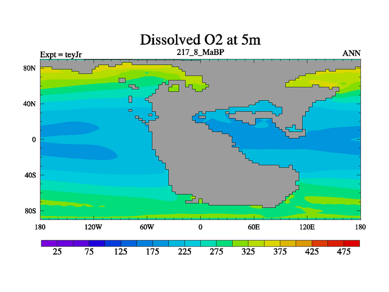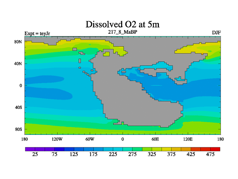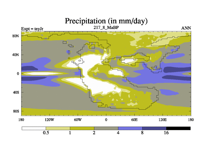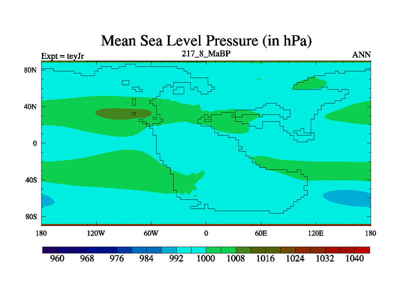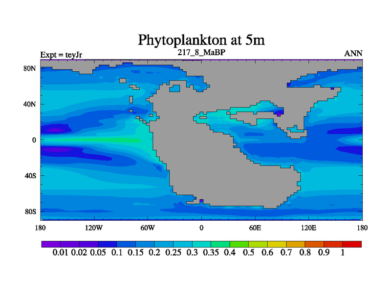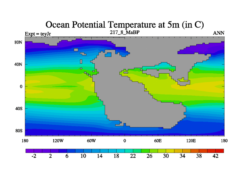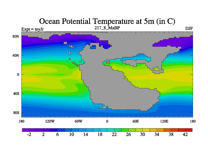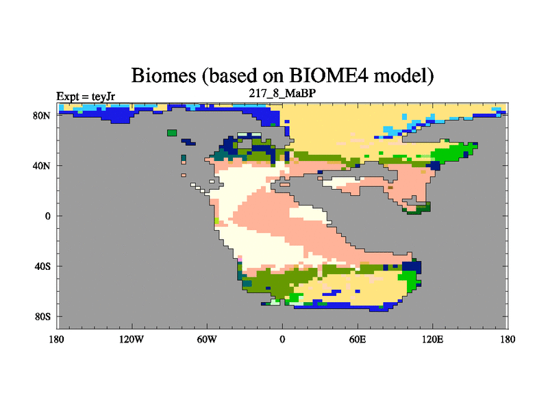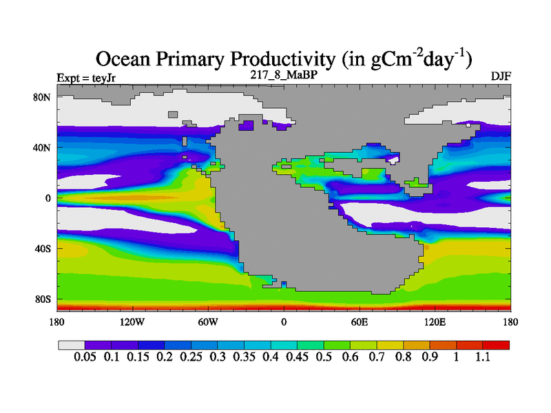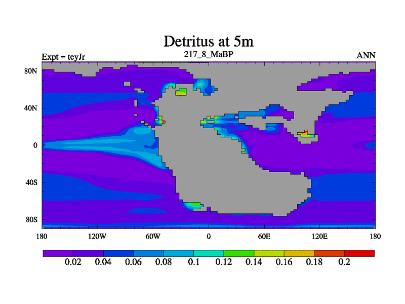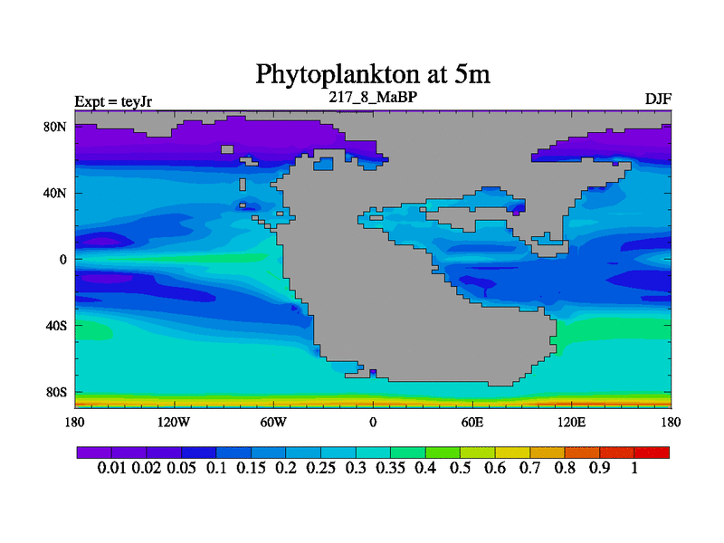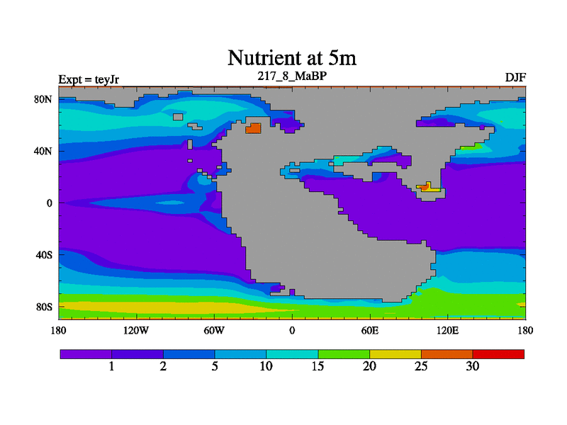 This is the 217.8 Ma simulation using the Scotese palaeogeographies and revised CCN etc. As teyfa3 but corrected orography problem over Antartartica. Now includes ocean biogeochemistry