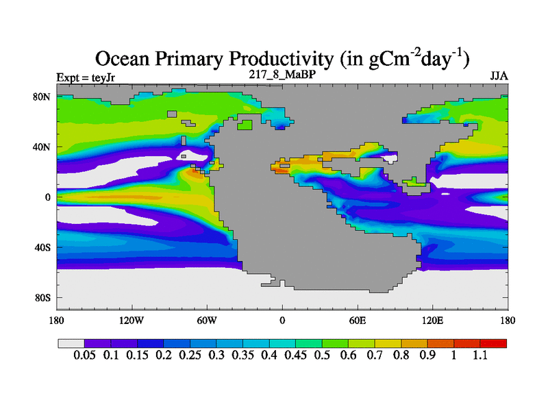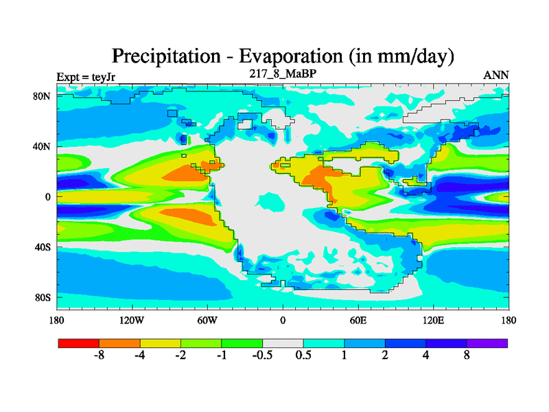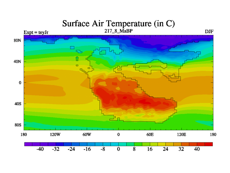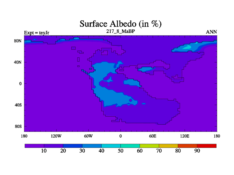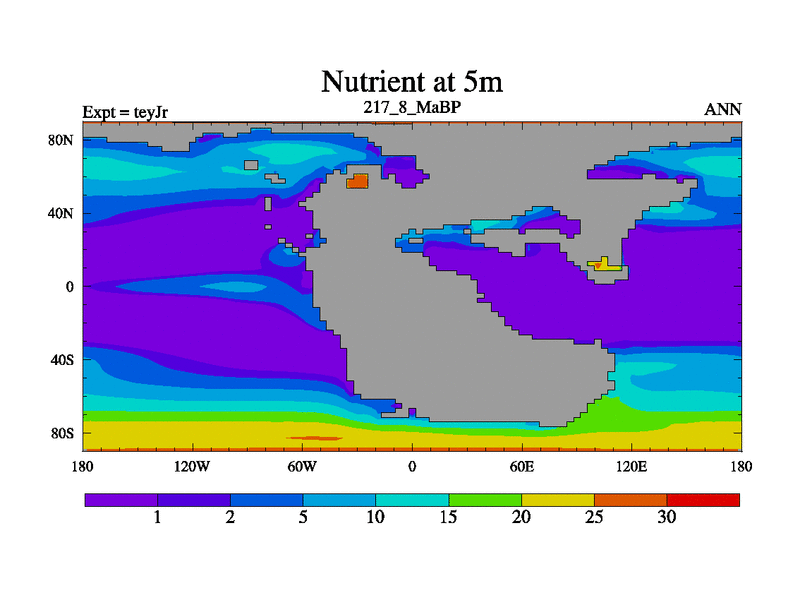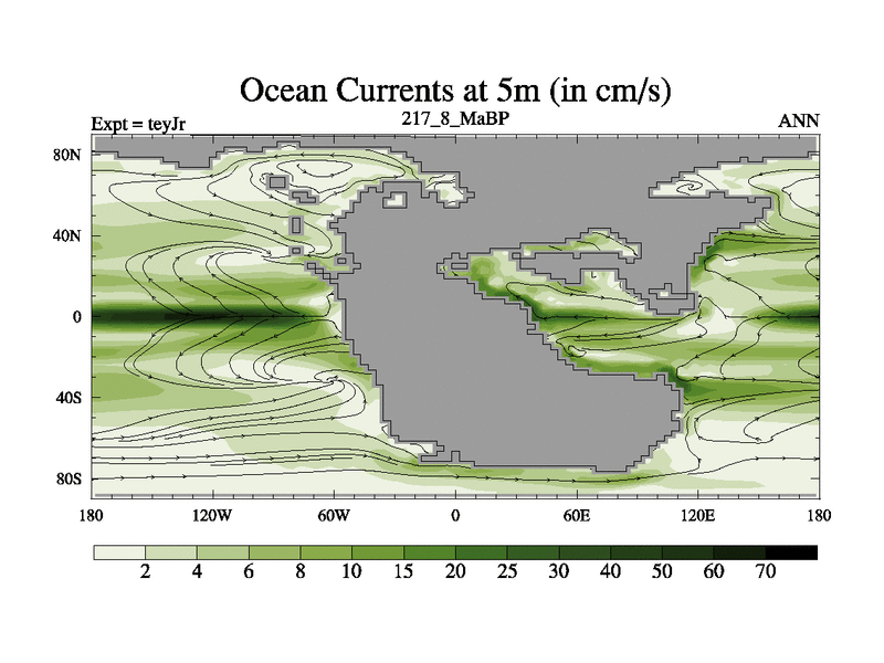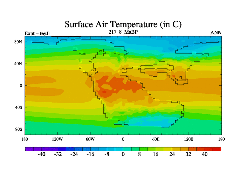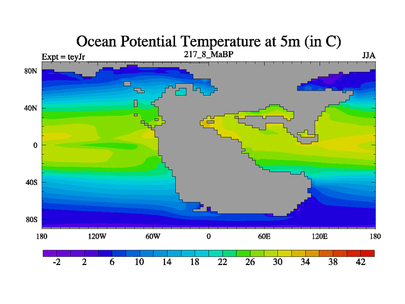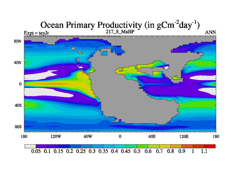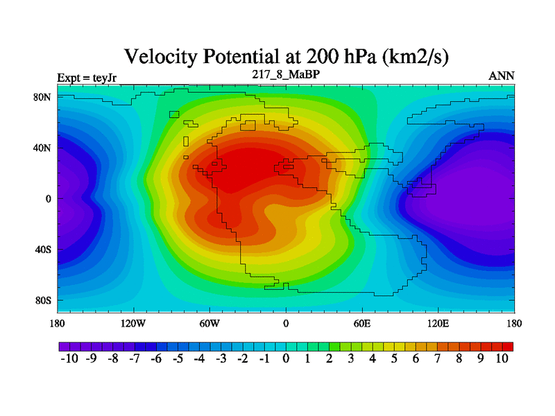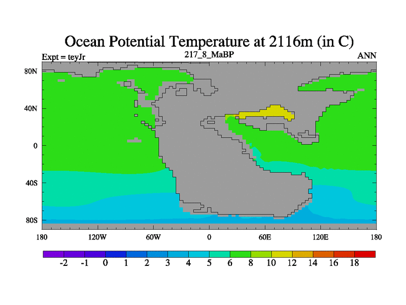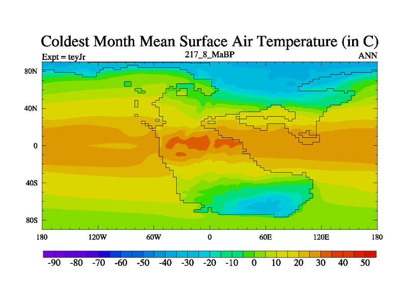 This is the 217.8 Ma simulation using the Scotese palaeogeographies and revised CCN etc. As teyfa3 but corrected orography problem over Antartartica. Now includes ocean biogeochemistry