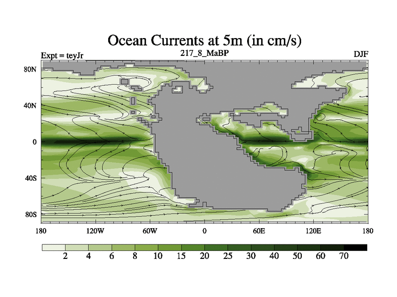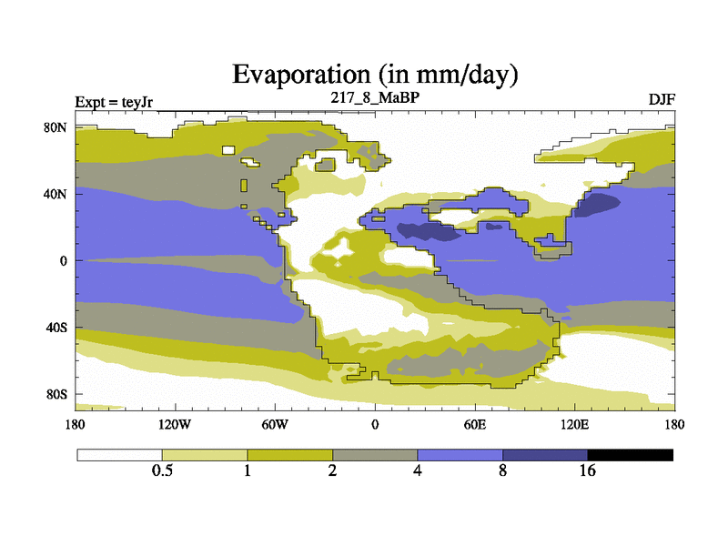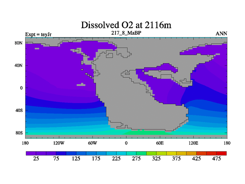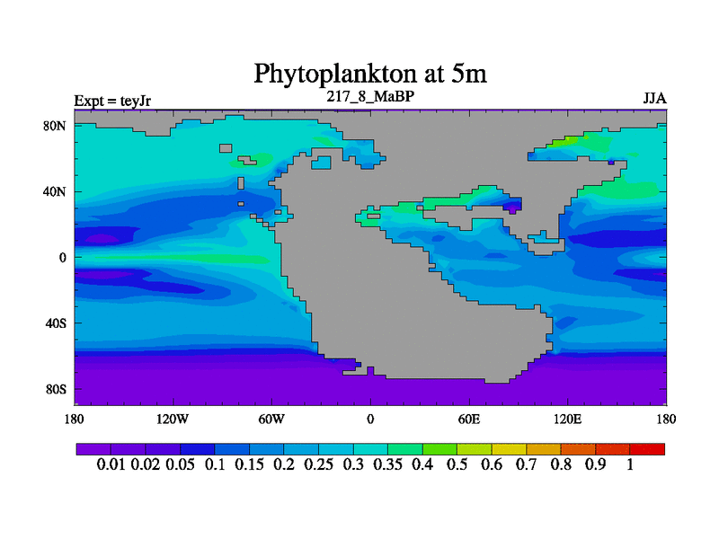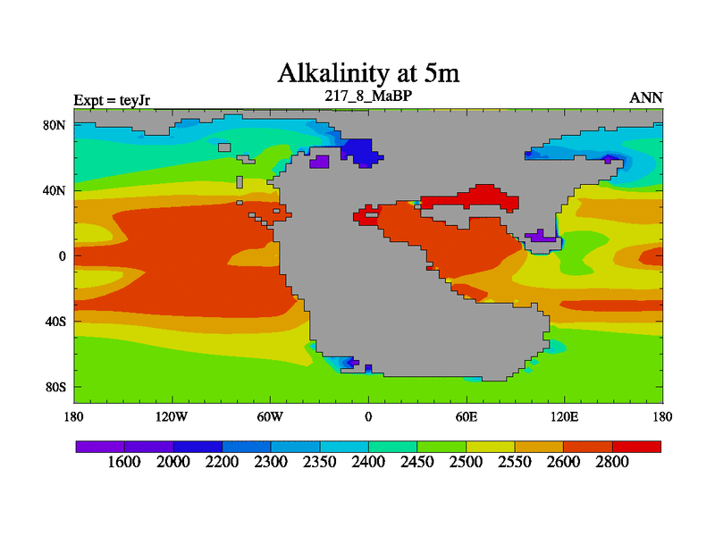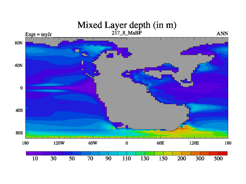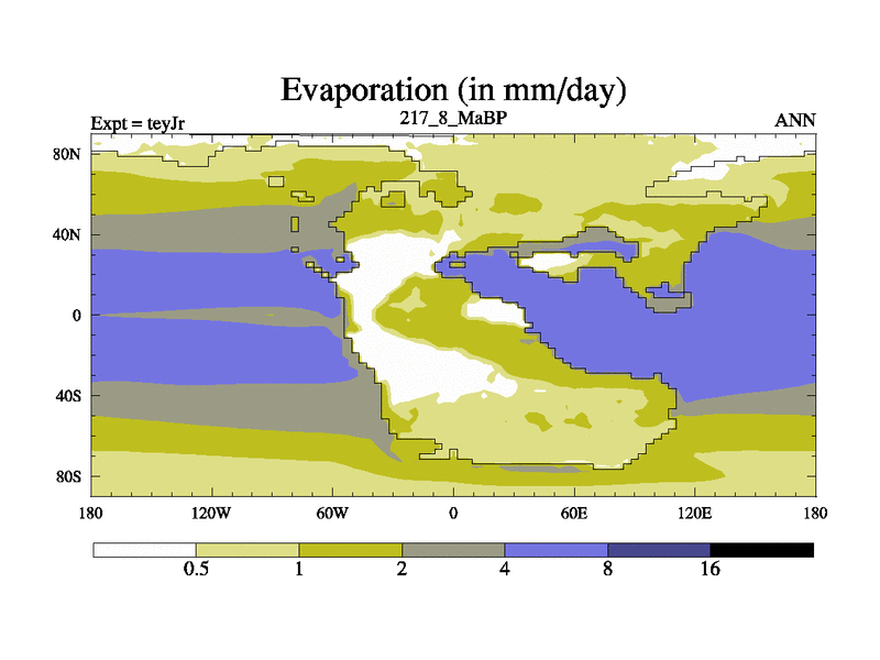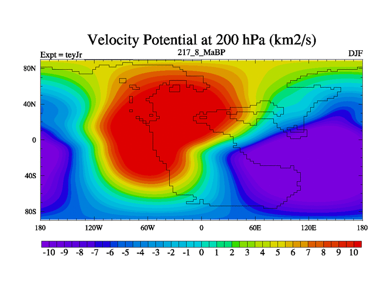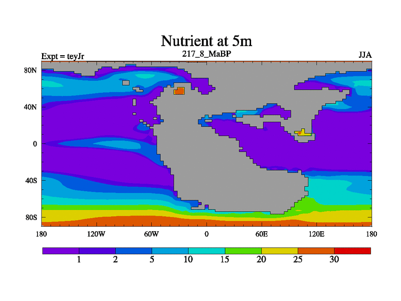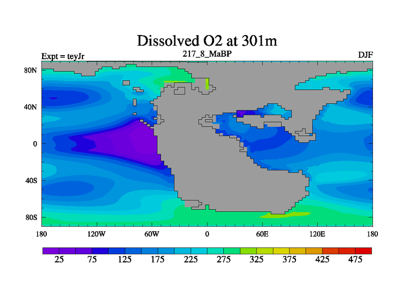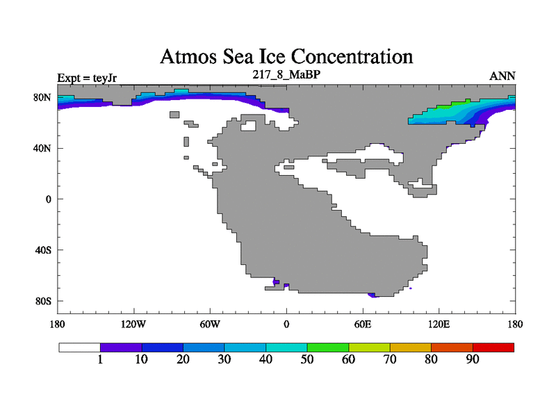 This is the 217.8 Ma simulation using the Scotese palaeogeographies and revised CCN etc. As teyfa3 but corrected orography problem over Antartartica. Now includes ocean biogeochemistry