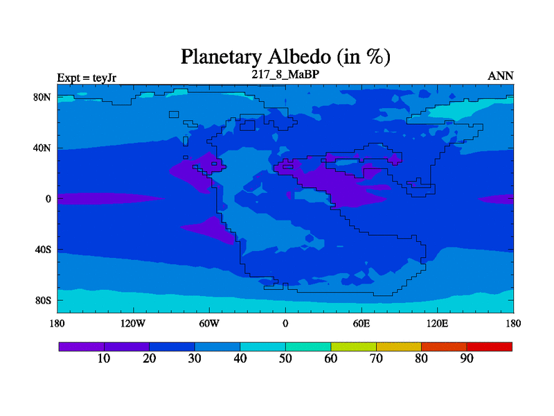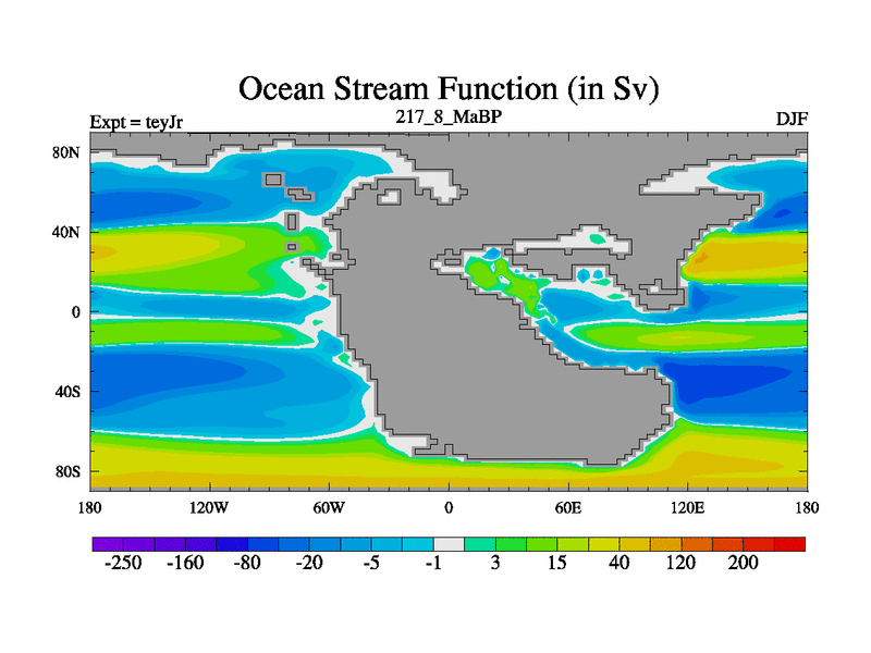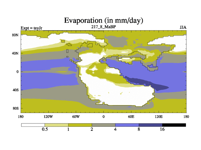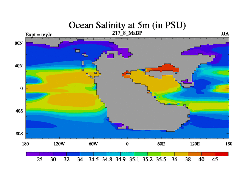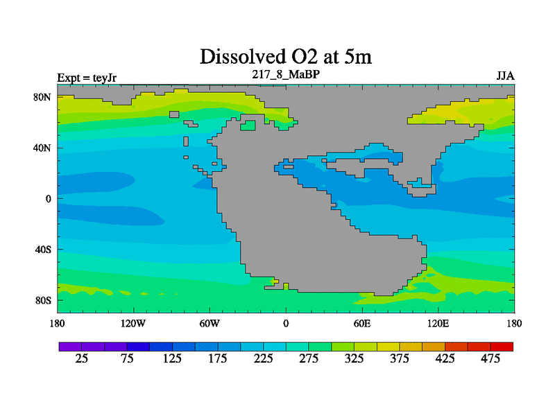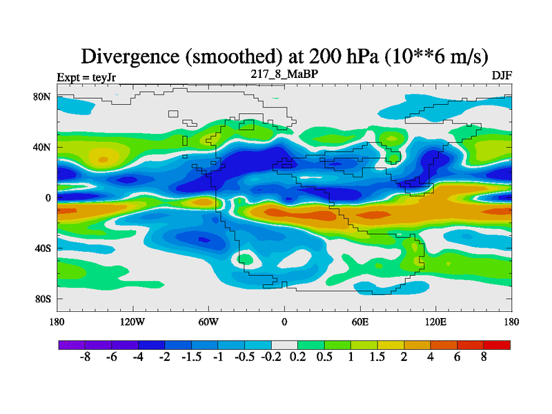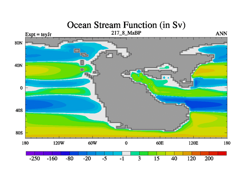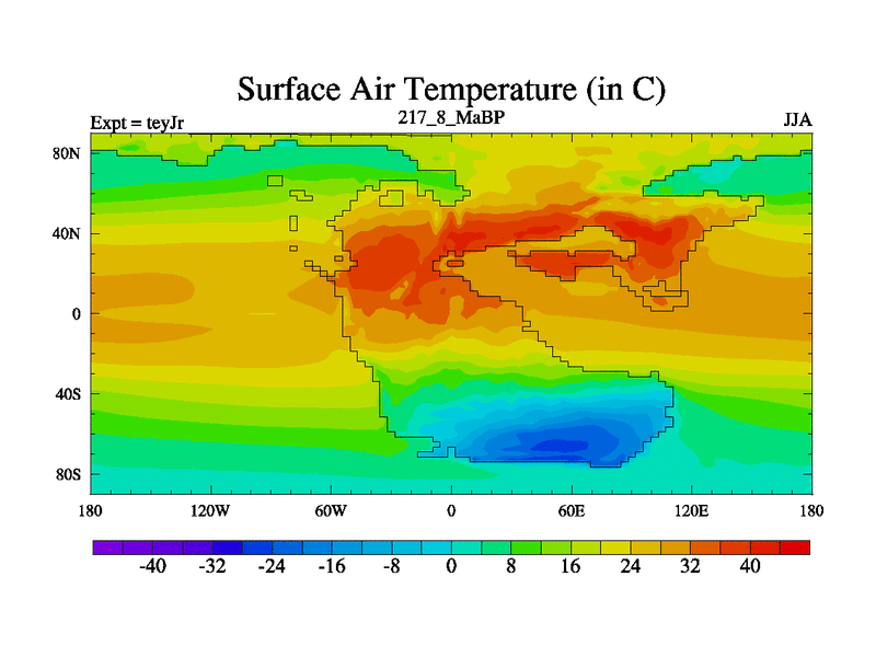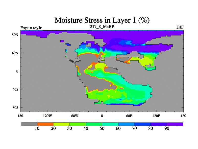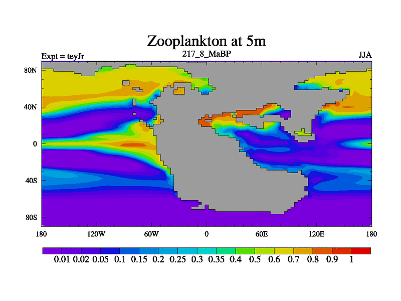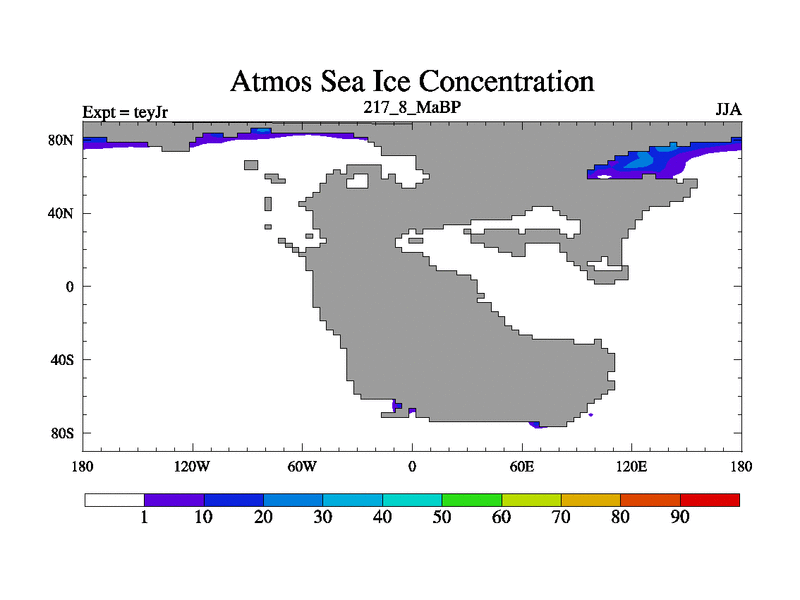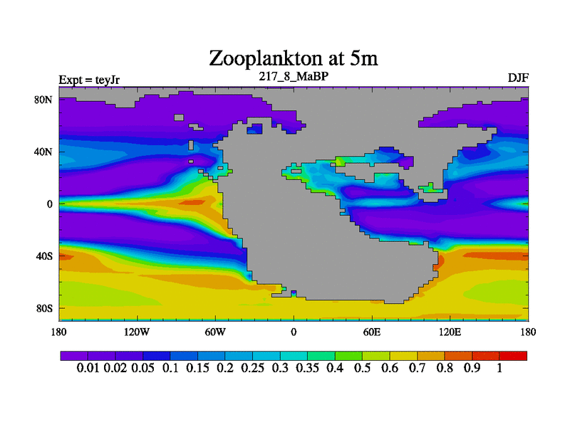 This is the 217.8 Ma simulation using the Scotese palaeogeographies and revised CCN etc. As teyfa3 but corrected orography problem over Antartartica. Now includes ocean biogeochemistry