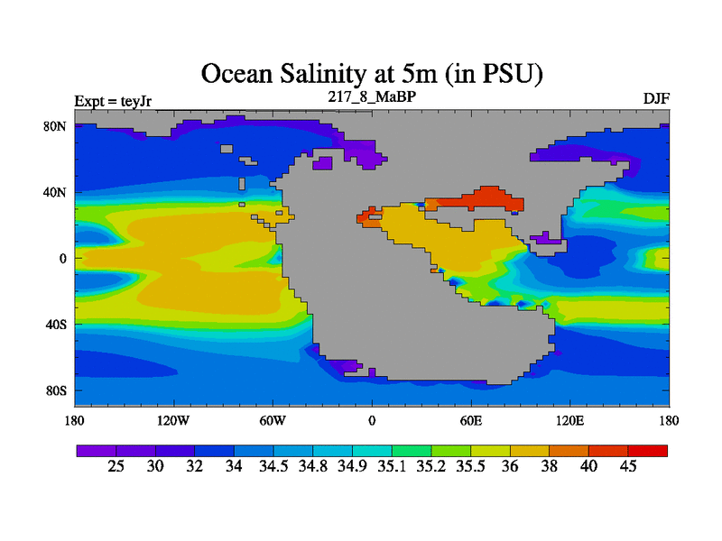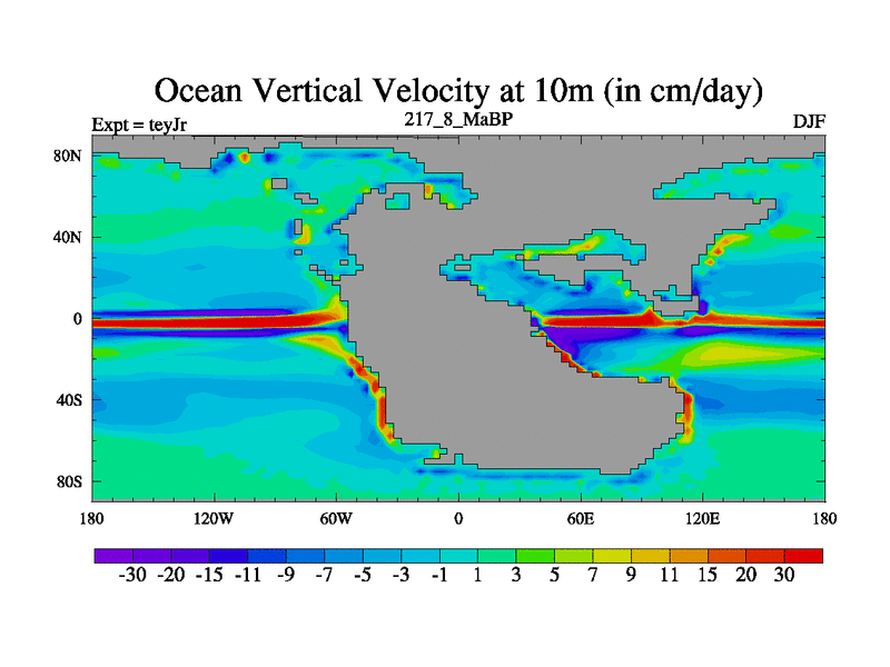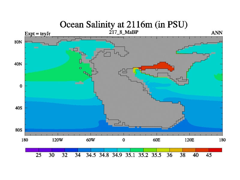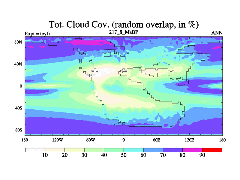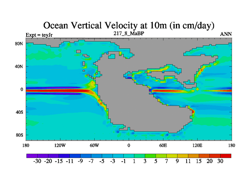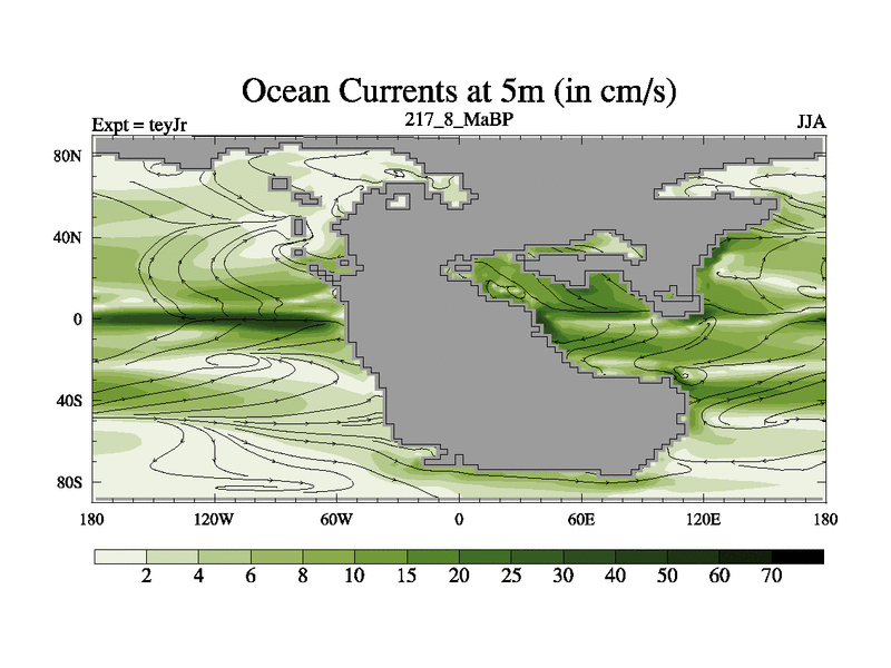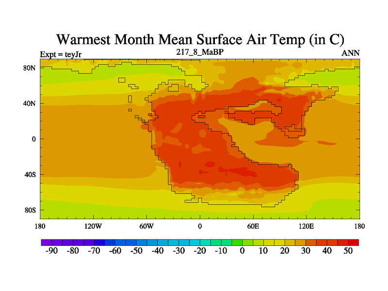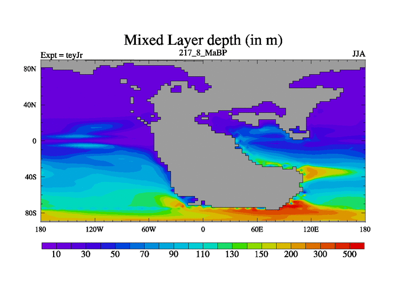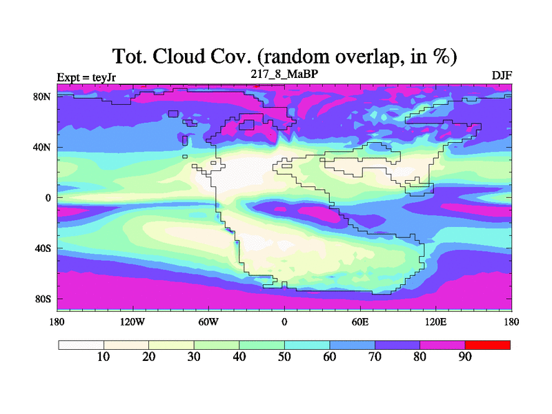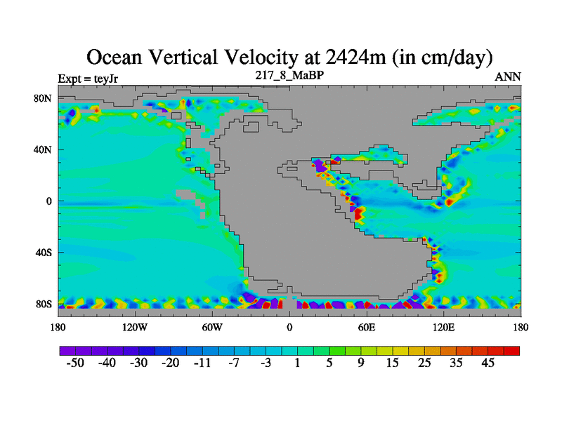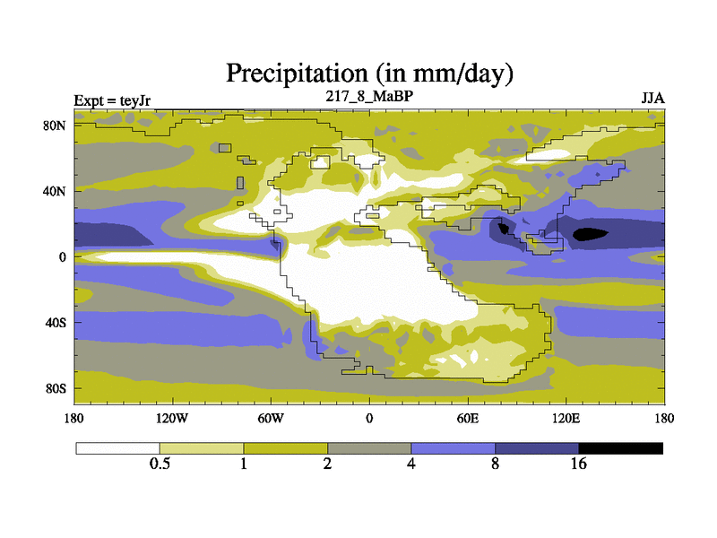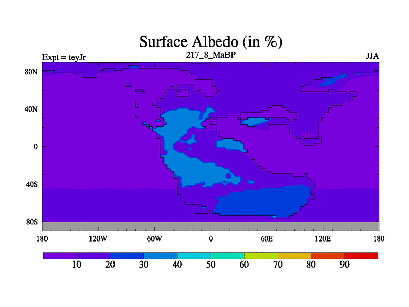 This is the 217.8 Ma simulation using the Scotese palaeogeographies and revised CCN etc. As teyfa3 but corrected orography problem over Antartartica. Now includes ocean biogeochemistry