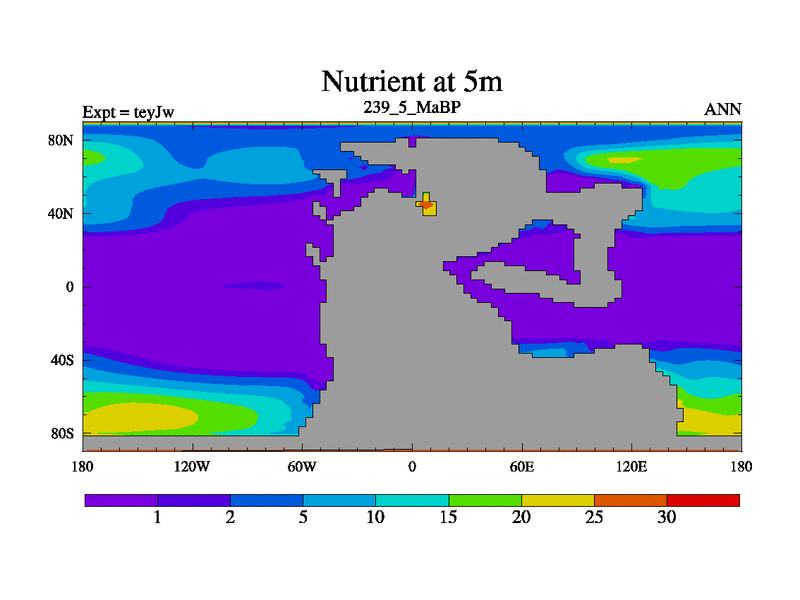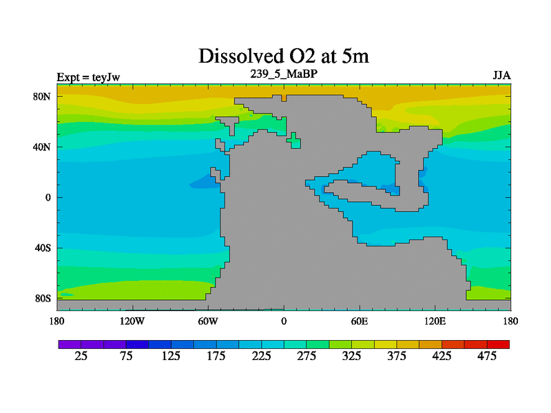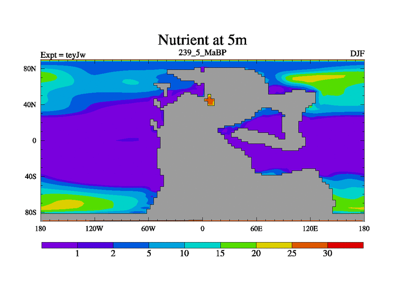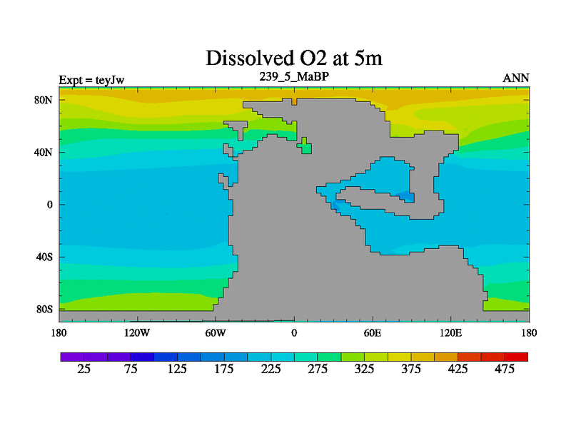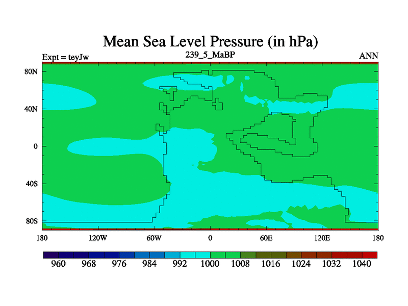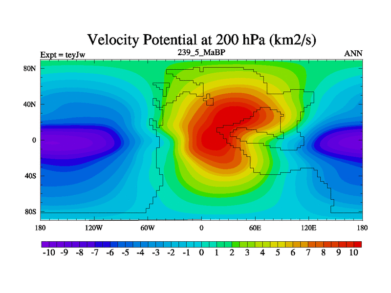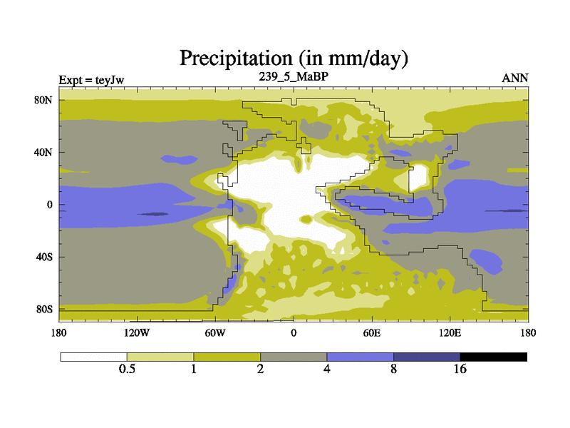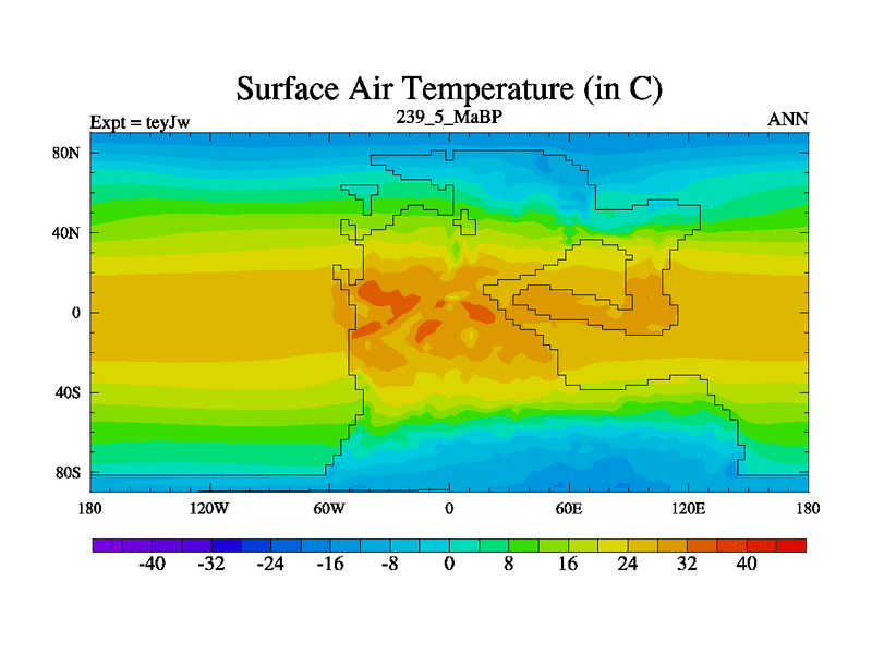 This is the 239.5 Ma simulation using the Scotese palaeogeographies and revised CCN etc. As teyfa3 but corrected orography problem over Antartartica. Now includes ocean biogeochemistry