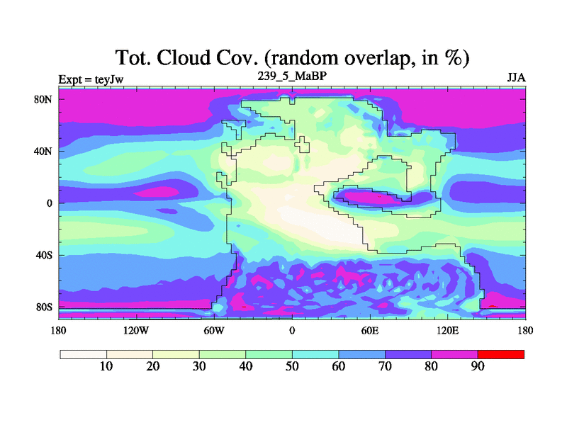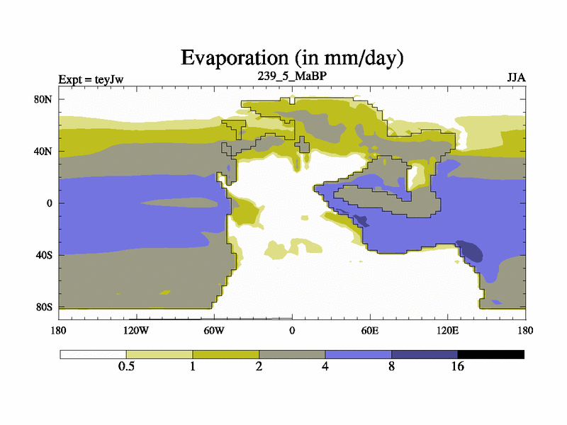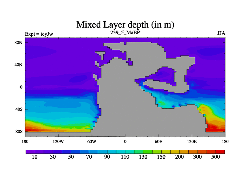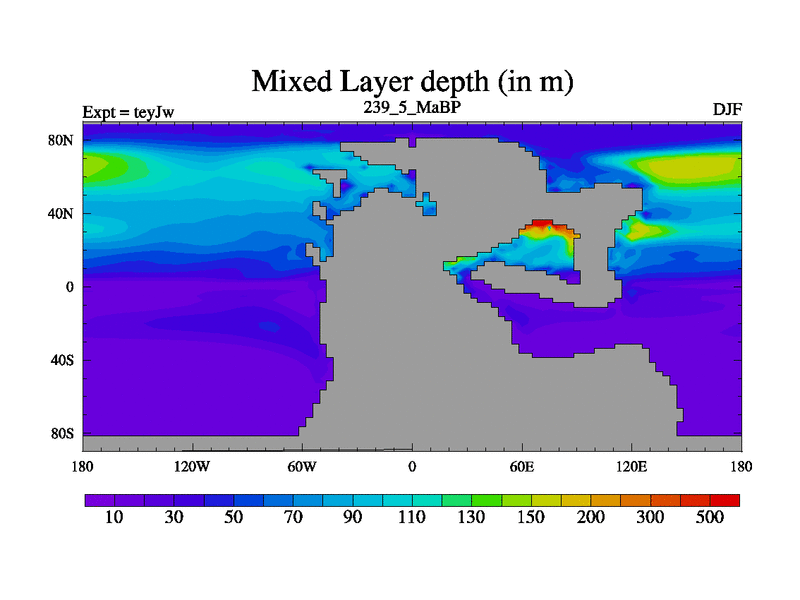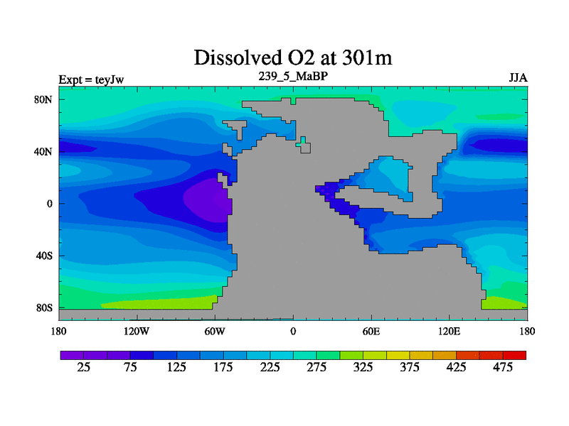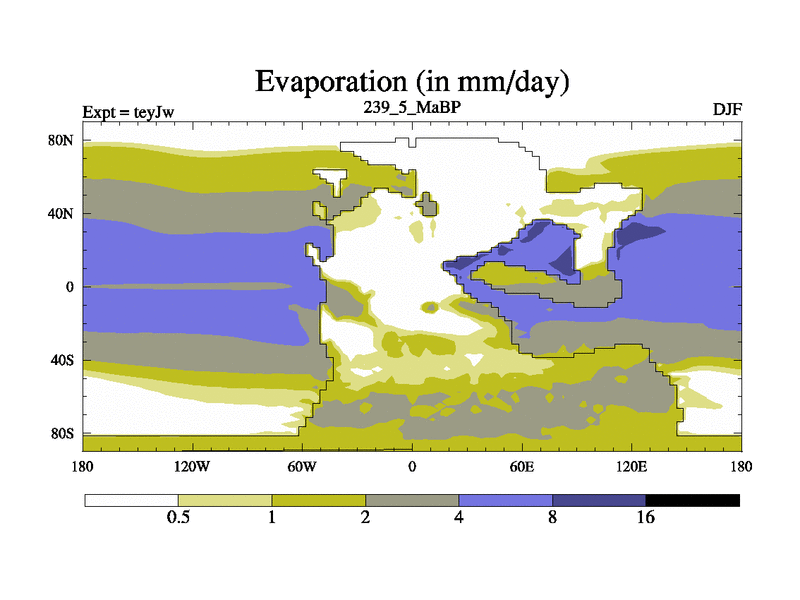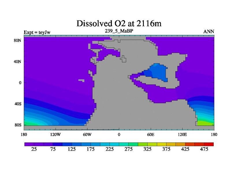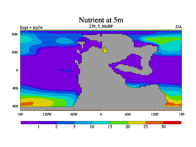 This is the 239.5 Ma simulation using the Scotese palaeogeographies and revised CCN etc. As teyfa3 but corrected orography problem over Antartartica. Now includes ocean biogeochemistry