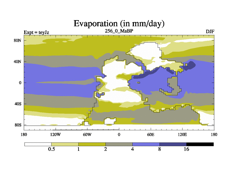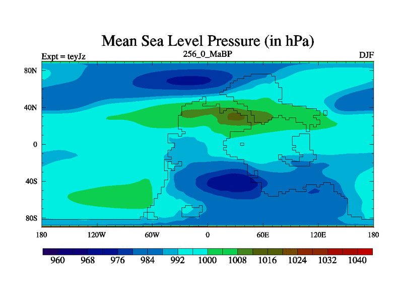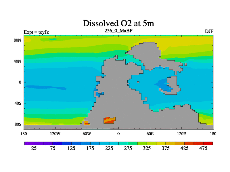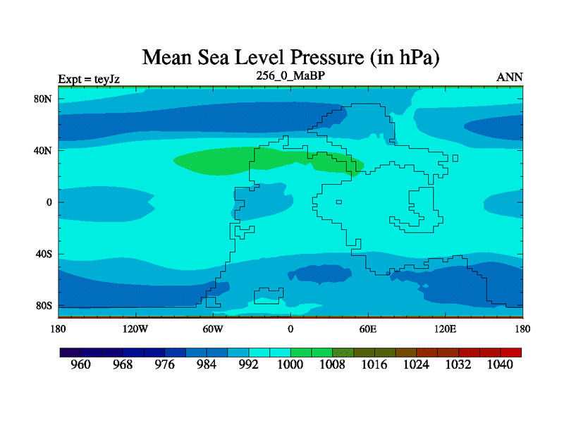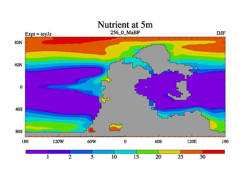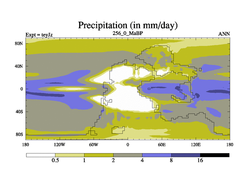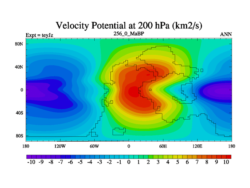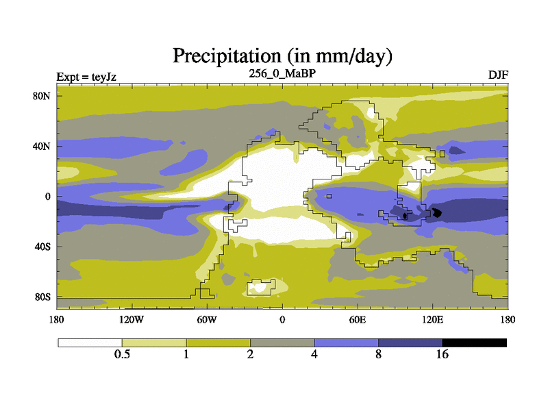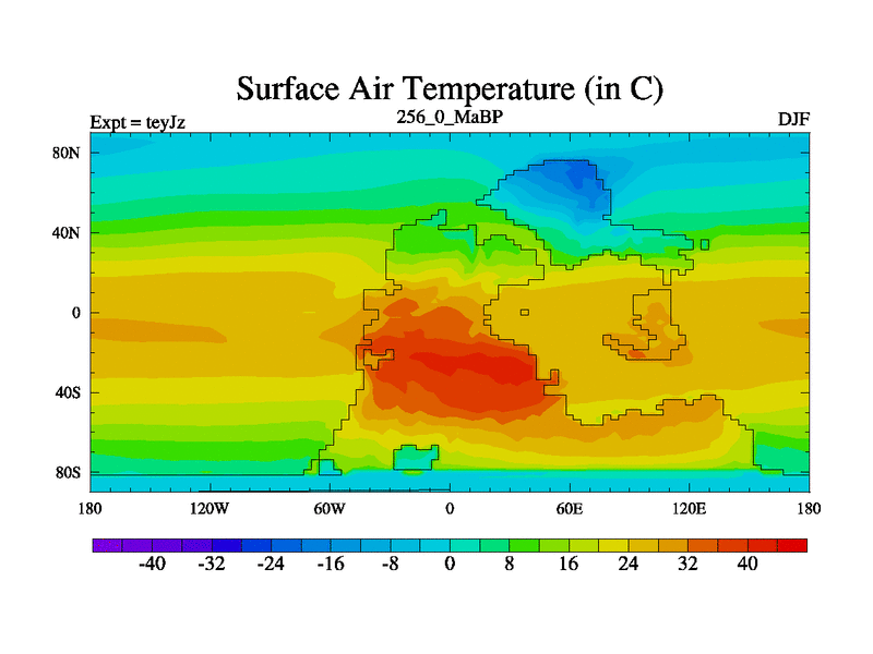 This is the 256.0 Ma simulation using the Scotese palaeogeographies and revised CCN etc. As teyfa3 but corrected orography problem over Antartartica. Now includes ocean biogeochemistry