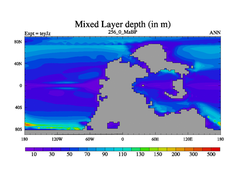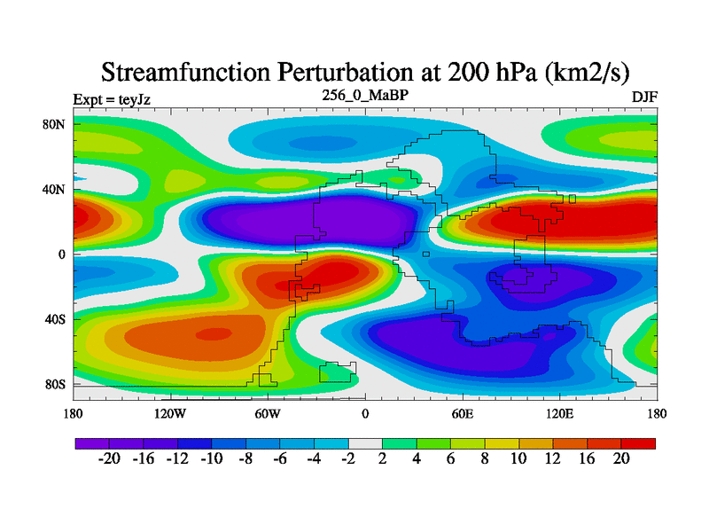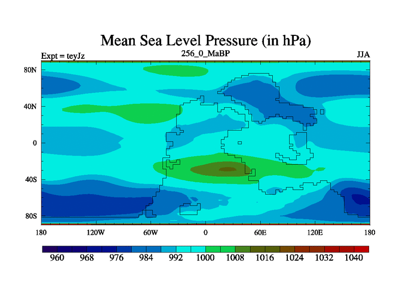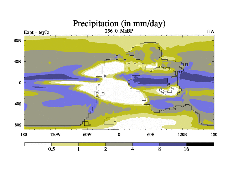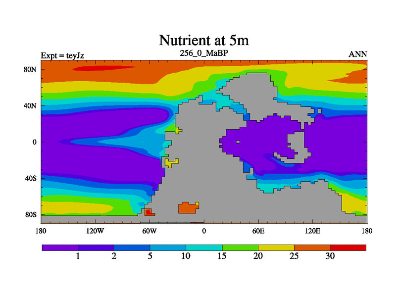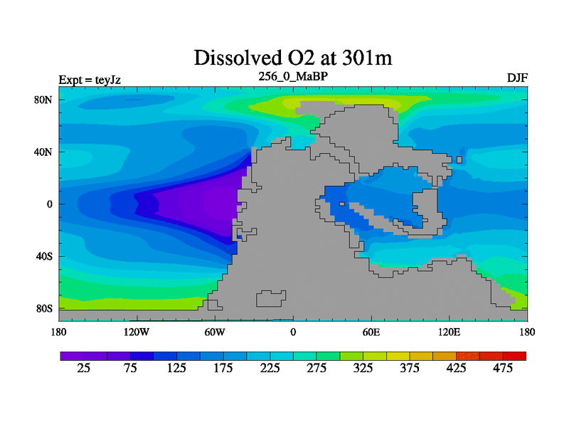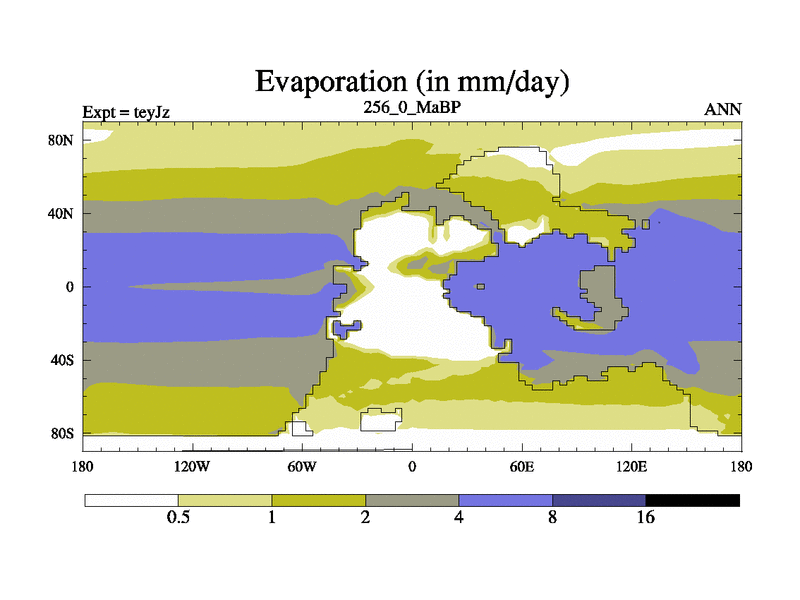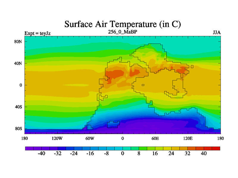 This is the 256.0 Ma simulation using the Scotese palaeogeographies and revised CCN etc. As teyfa3 but corrected orography problem over Antartartica. Now includes ocean biogeochemistry
