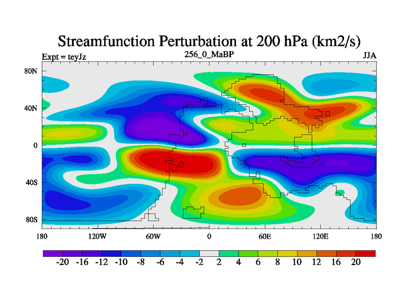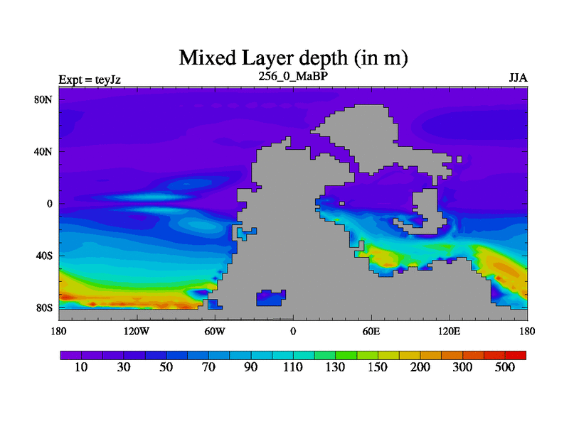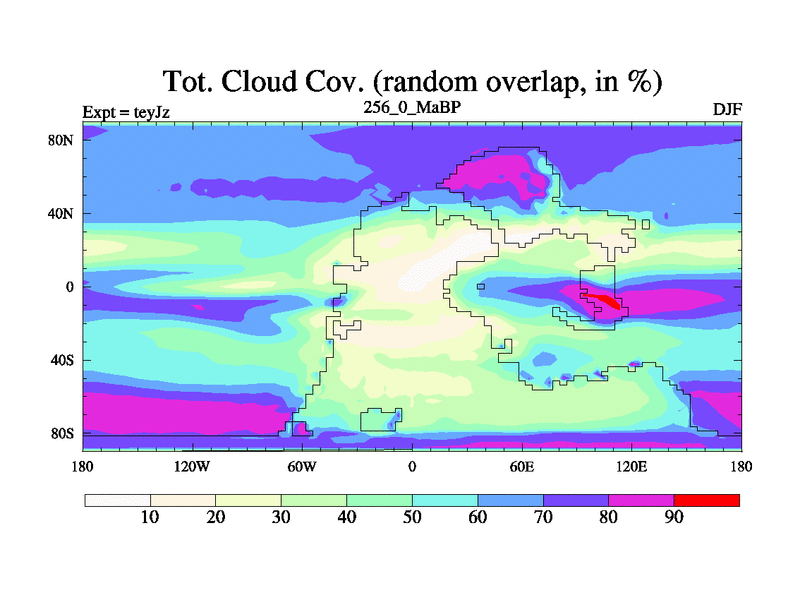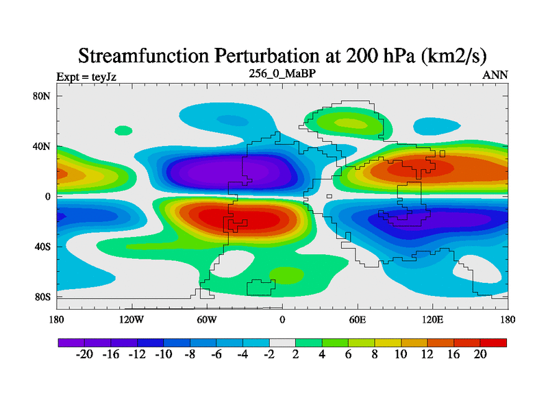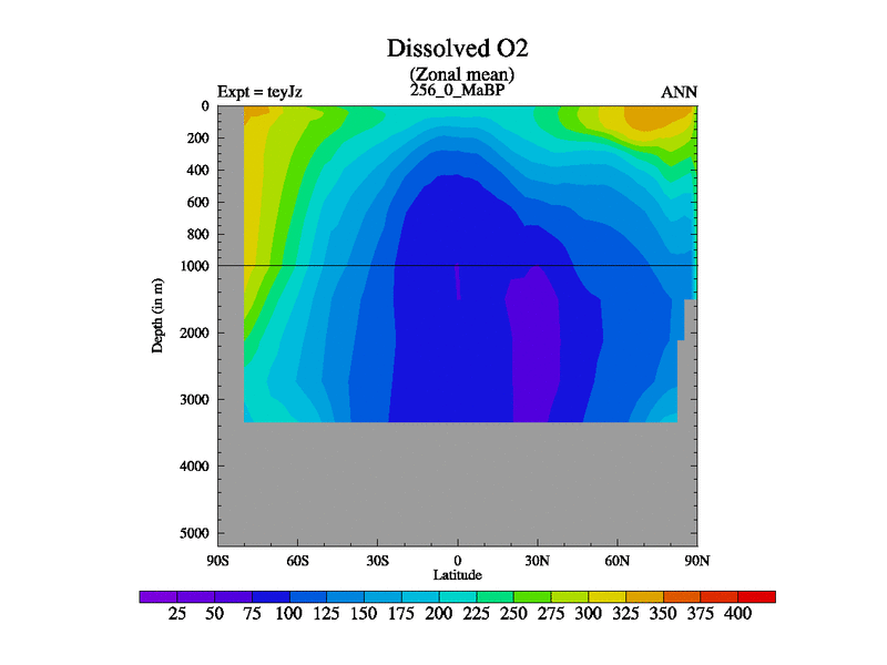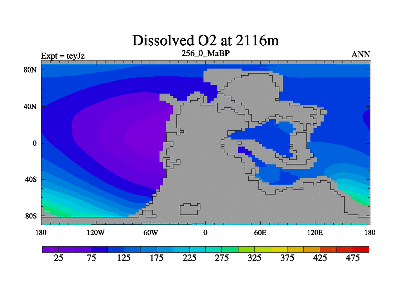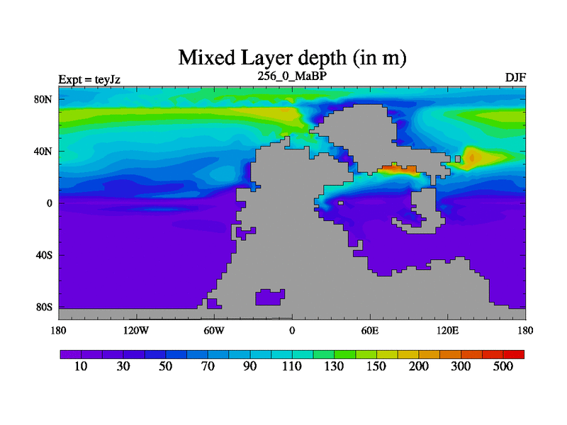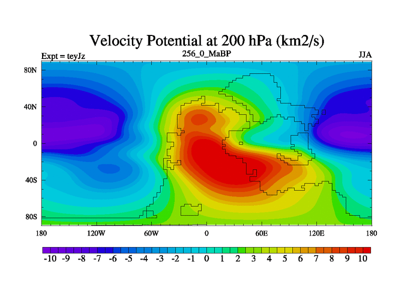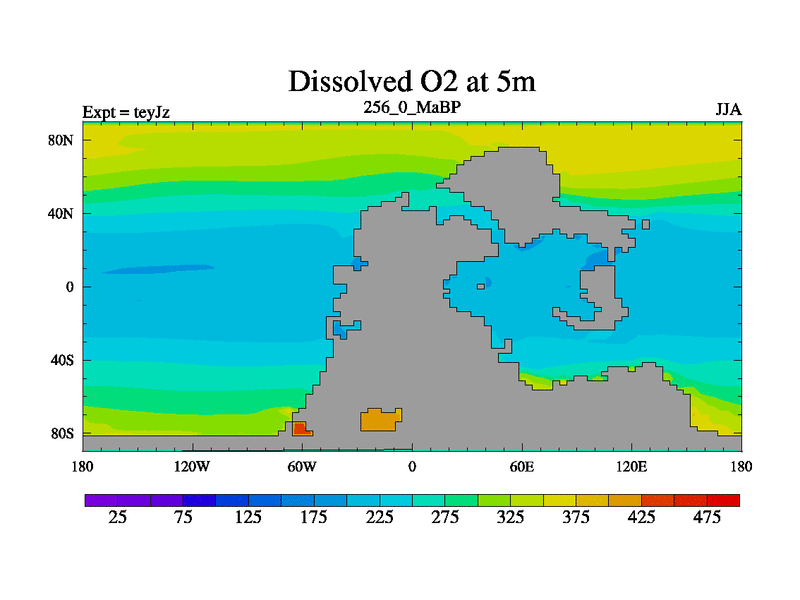 This is the 256.0 Ma simulation using the Scotese palaeogeographies and revised CCN etc. As teyfa3 but corrected orography problem over Antartartica. Now includes ocean biogeochemistry