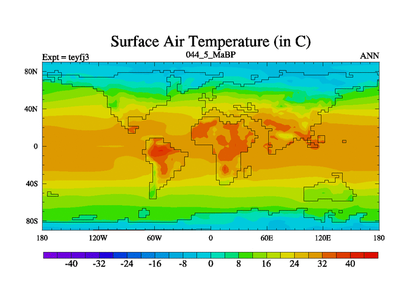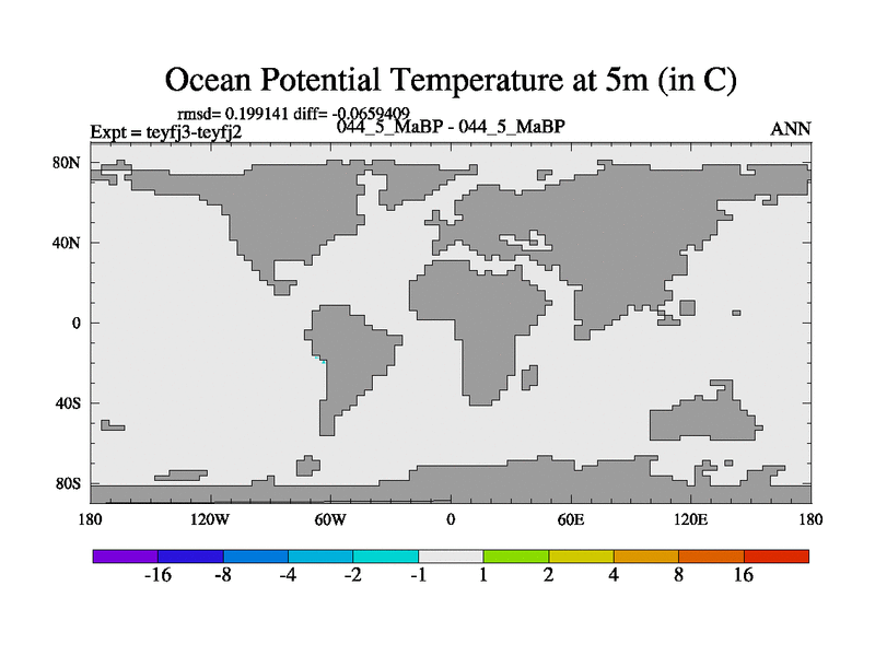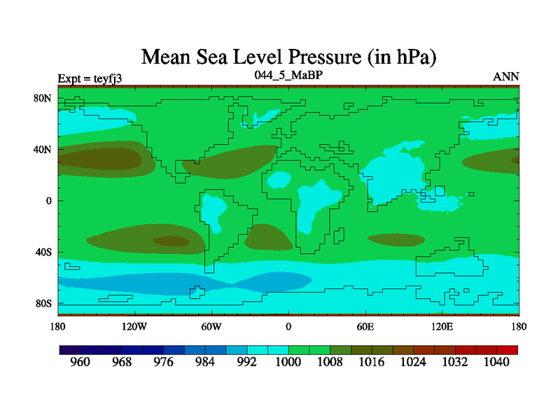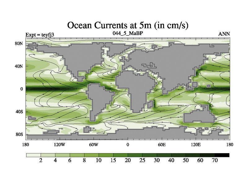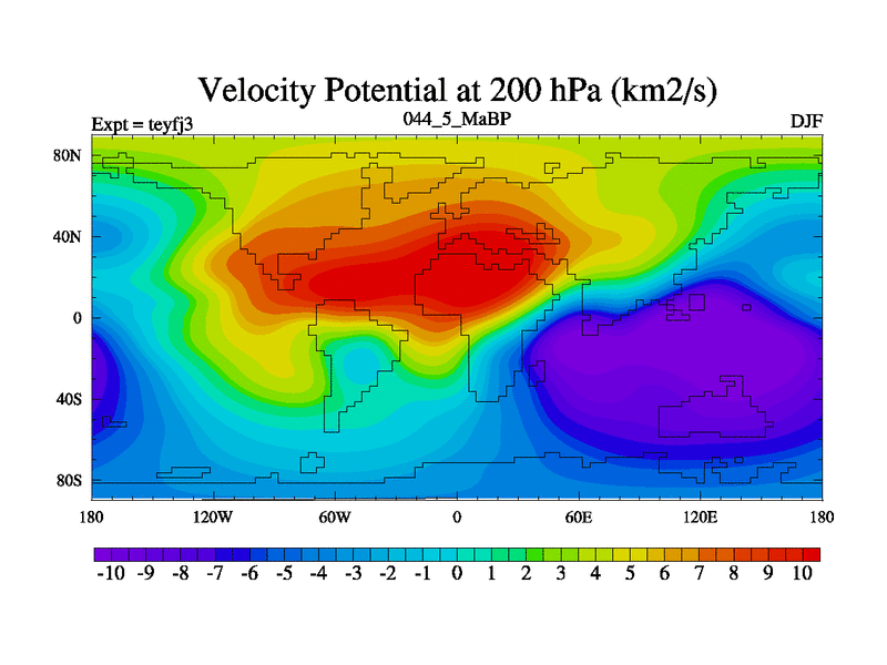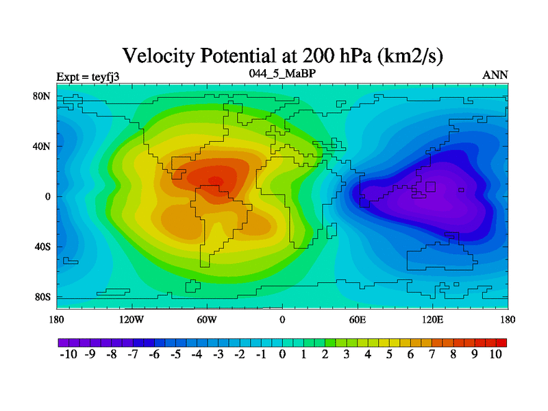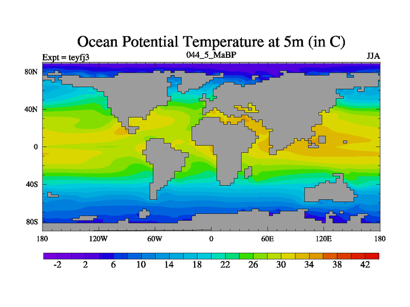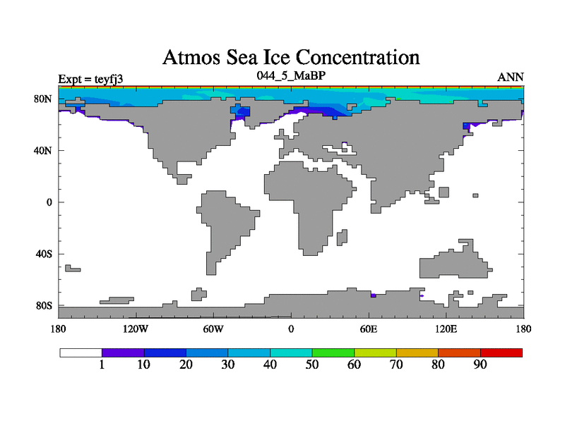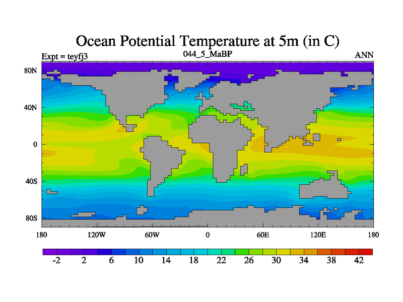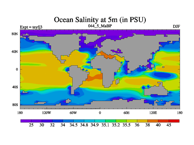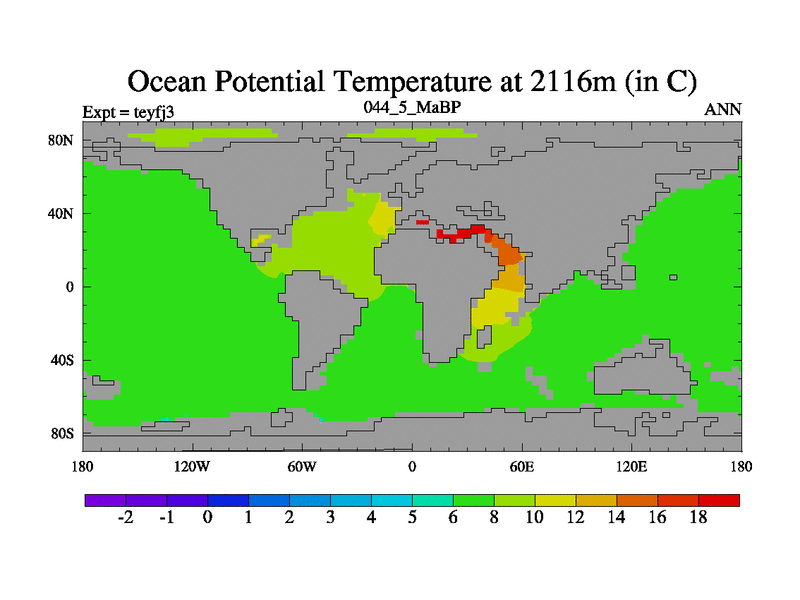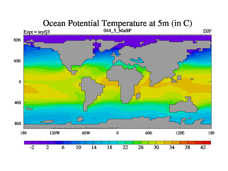 This is the 44.5 Ma simulation using the Scotese palaeogeographies and revised CCN etc. Updated HadCM3L ocean parameters and soil parameters. Also made sure orography gravity wave drag was consistent.