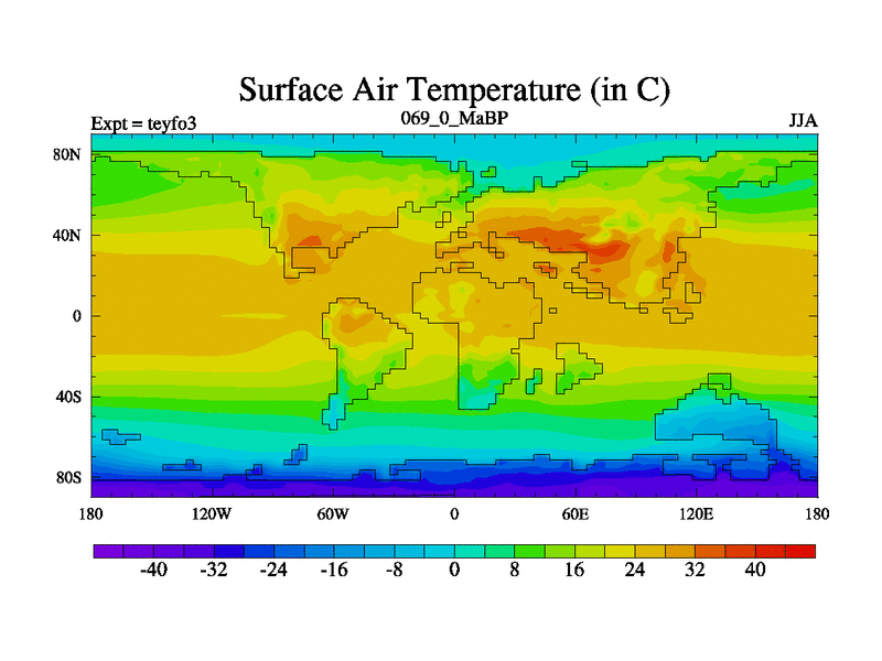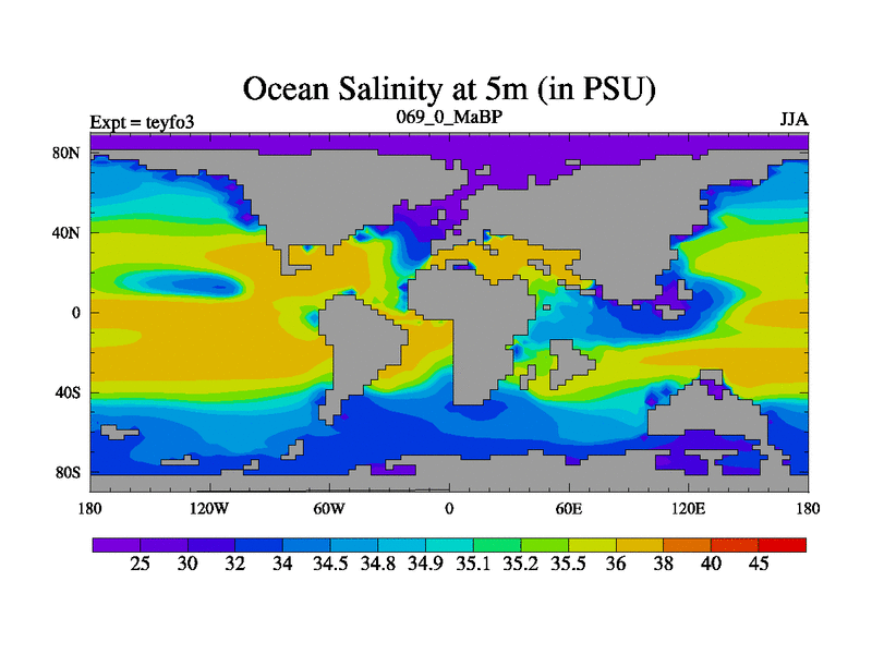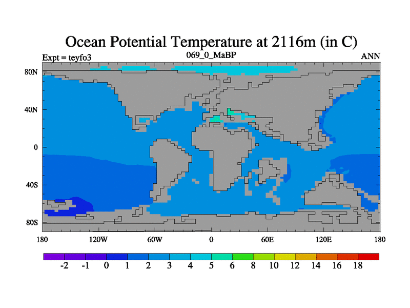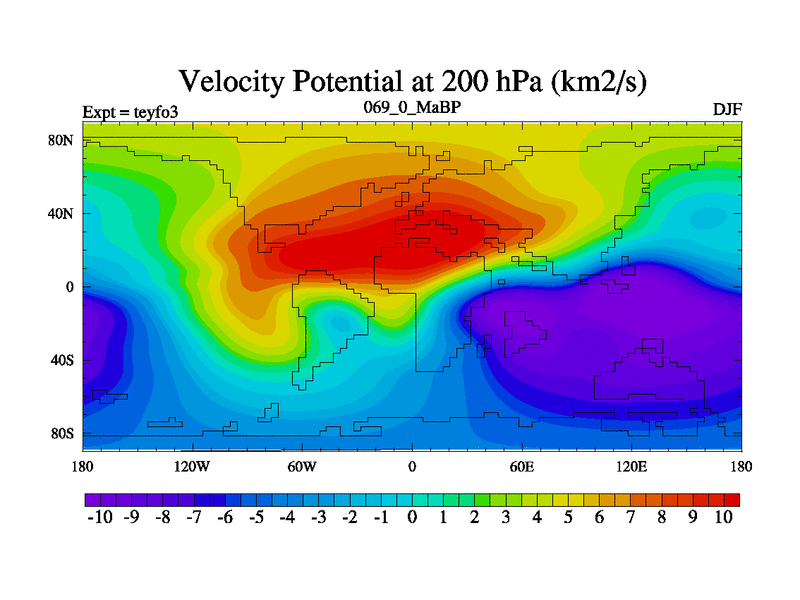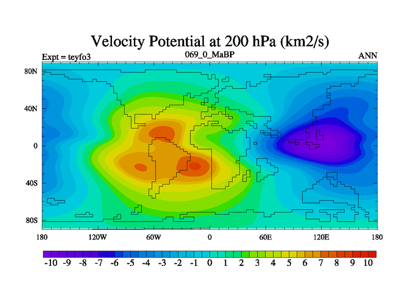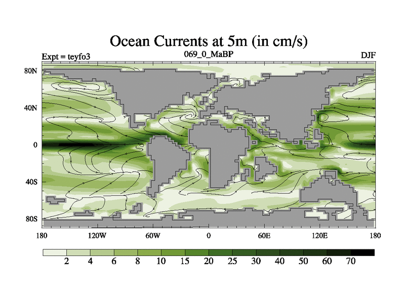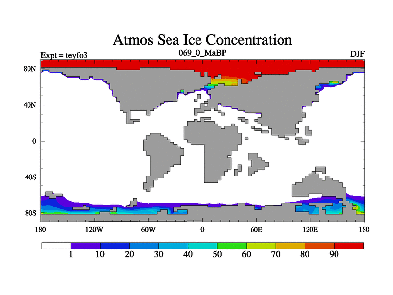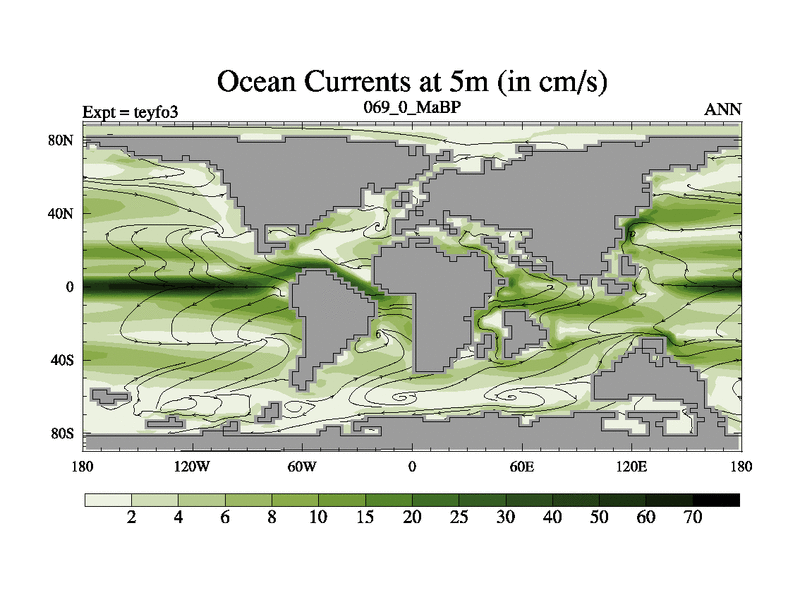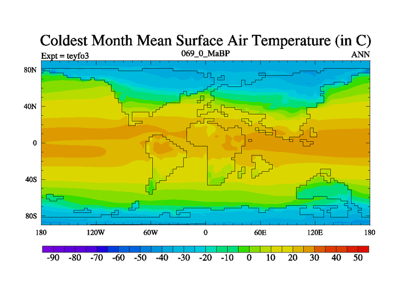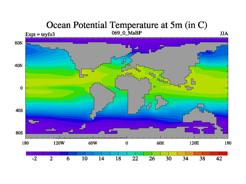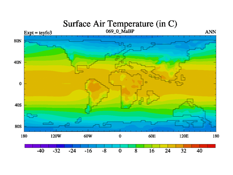 This is the 69.0 Ma simulation using the Scotese palaeogeographies and revised CCN etc. Updated HadCM3L ocean parameters and soil parameters. Also made sure orography gravity wave drag was consistent.