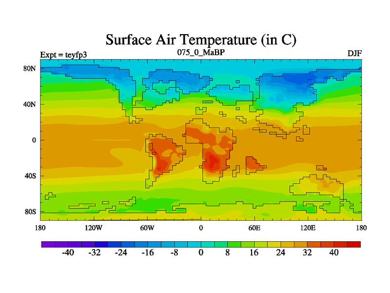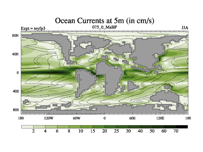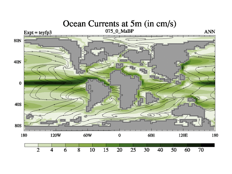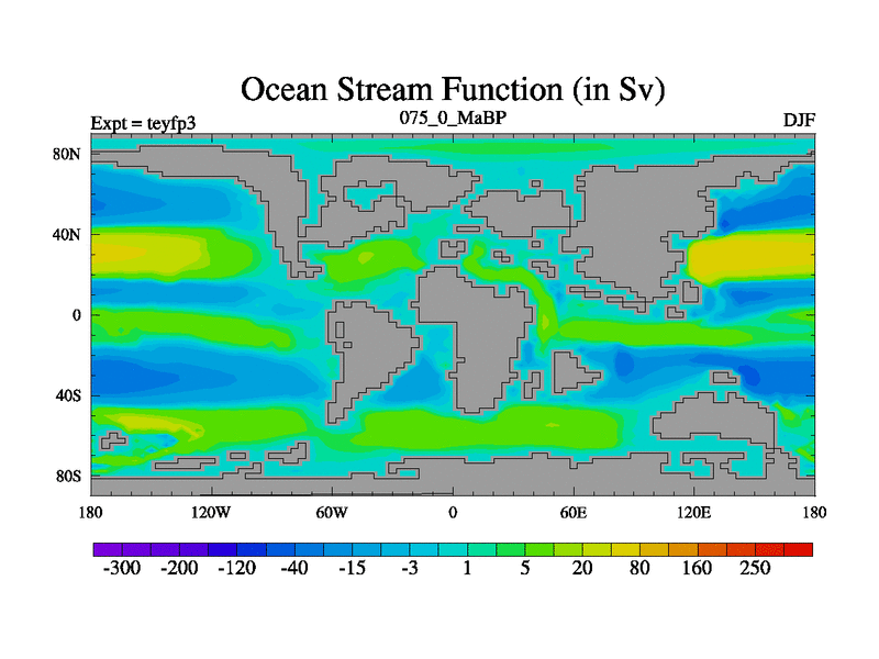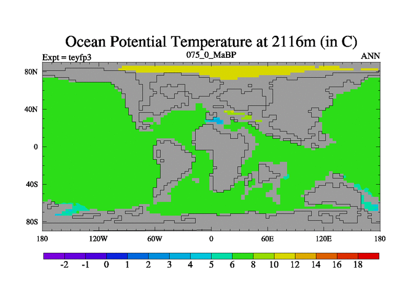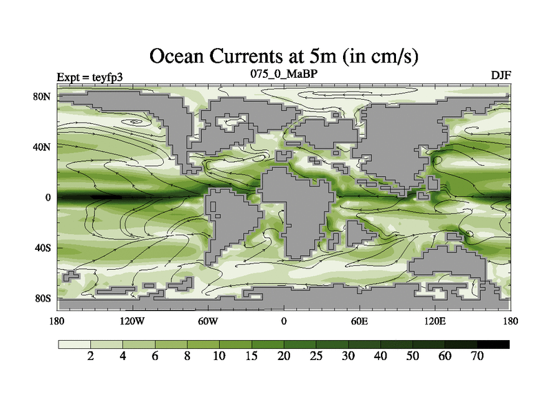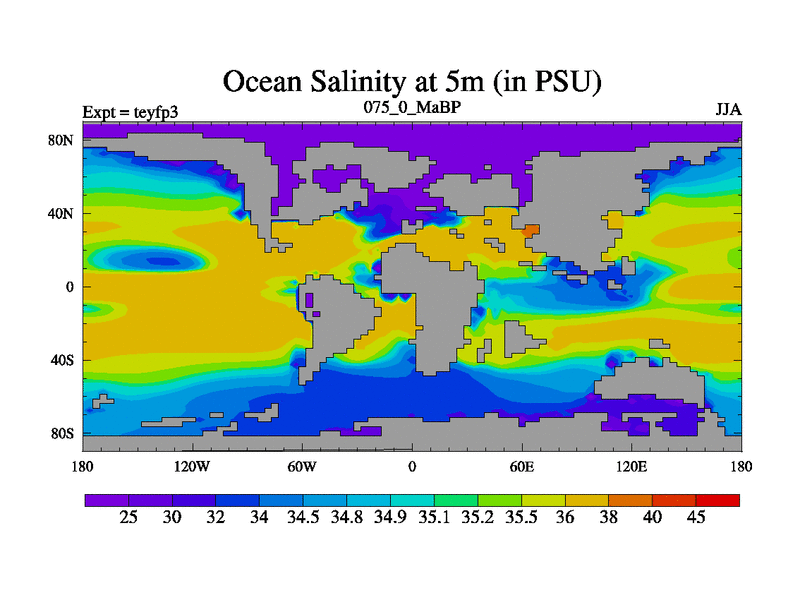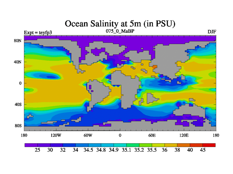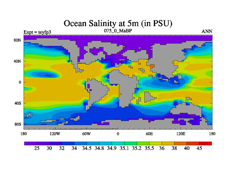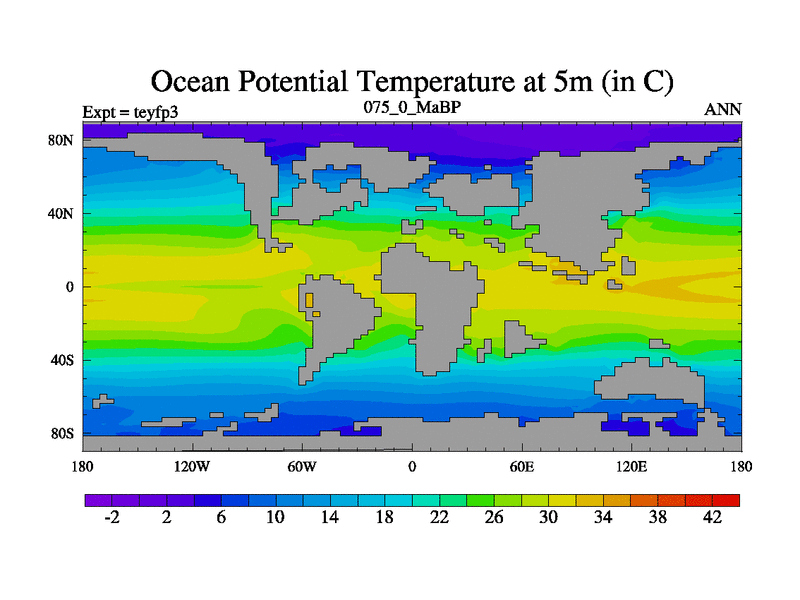 This is the 75.0 Ma simulation using the Scotese palaeogeographies and revised CCN etc. Updated HadCM3L ocean parameters and soil parameters. Also made sure orography gravity wave drag was consistent.